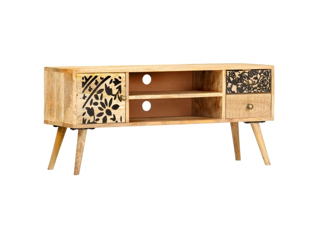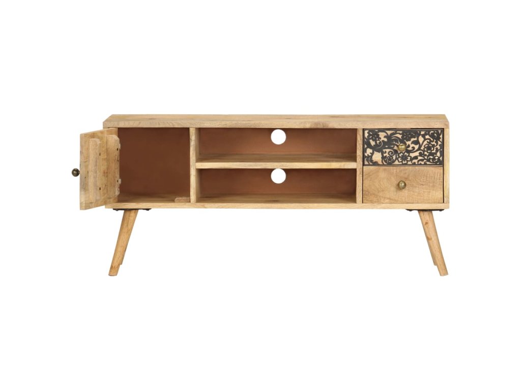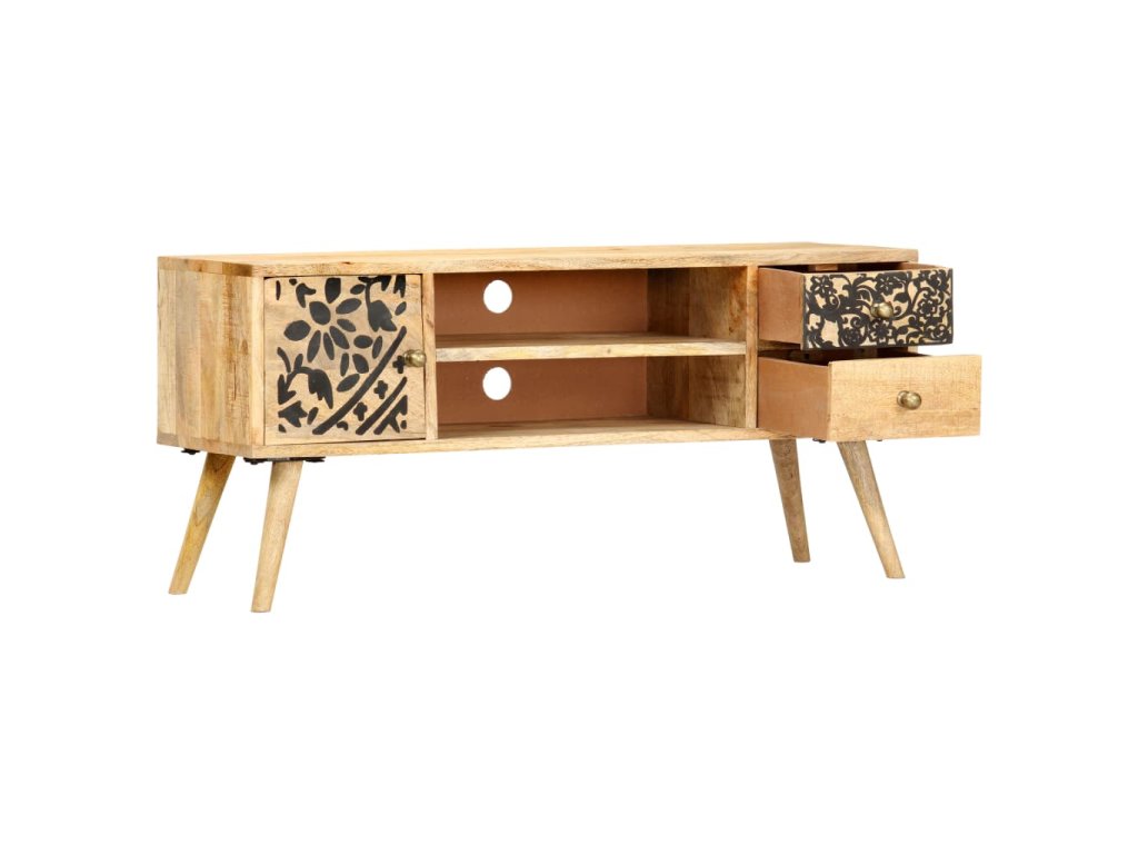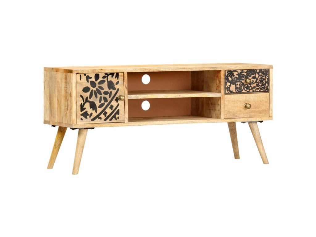 TV stolík je vyrobený z masívneho mangového dreva, ktoré je stabilné, odolné a krásne. Remeselné spracovanie mu dodáva veľkolepý retro štýl. Každý krok procesu výroby sa vykonáva s najväčšou starostlivosťou, či už ide o leštenie, natieranie alebo lakovanie. Vďaka remeselnému spracovaniu a štruktúre dreva je každý kus nábytku jedinečný a trochu odlišný od ostatných. Oceľové nohy mu dodáva stabilitu. Má 2 otvorené priehradky a 2 zásuvky, ktoré poskytujú dostatok priestoru pre uloženie DVD prehrávačov, herných konzol, streamingových zariadení a nosičov médií.