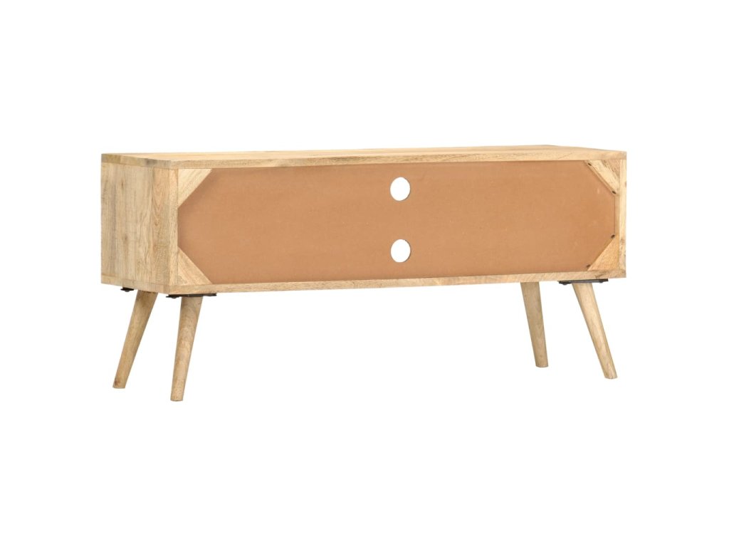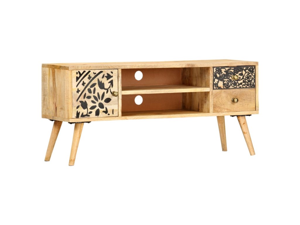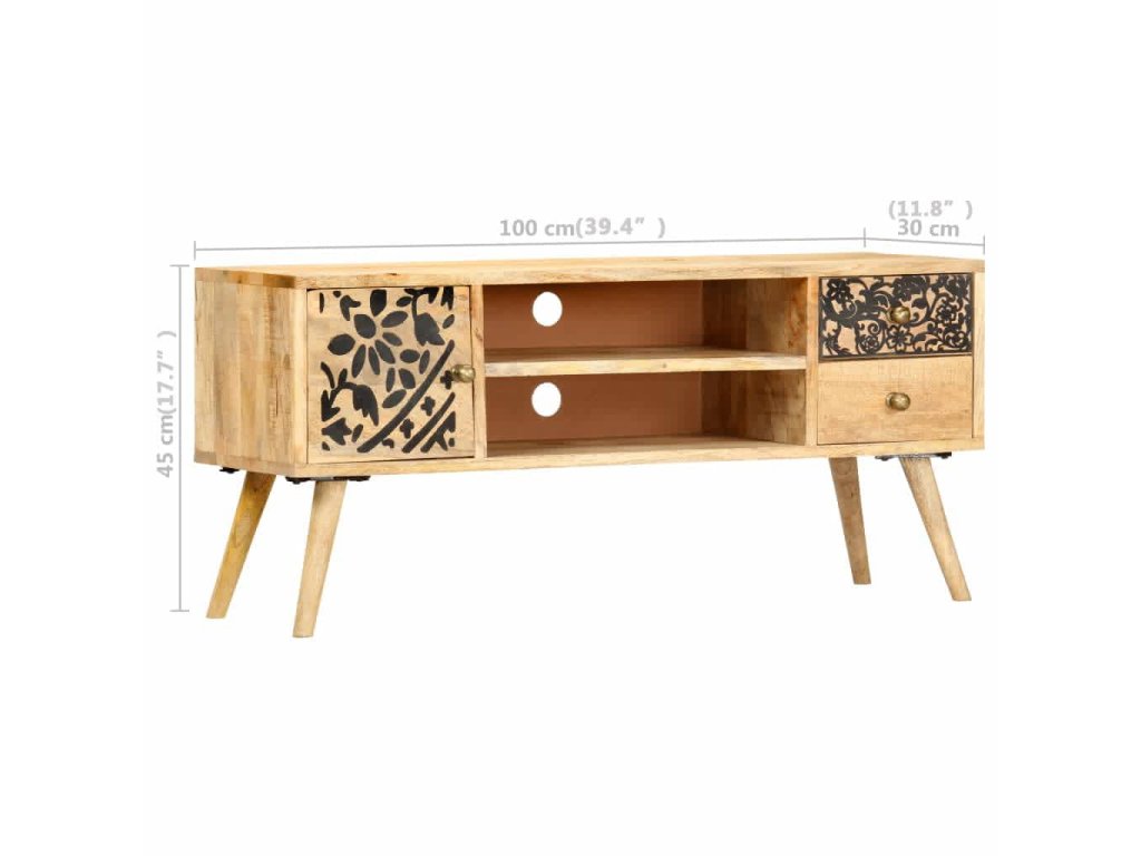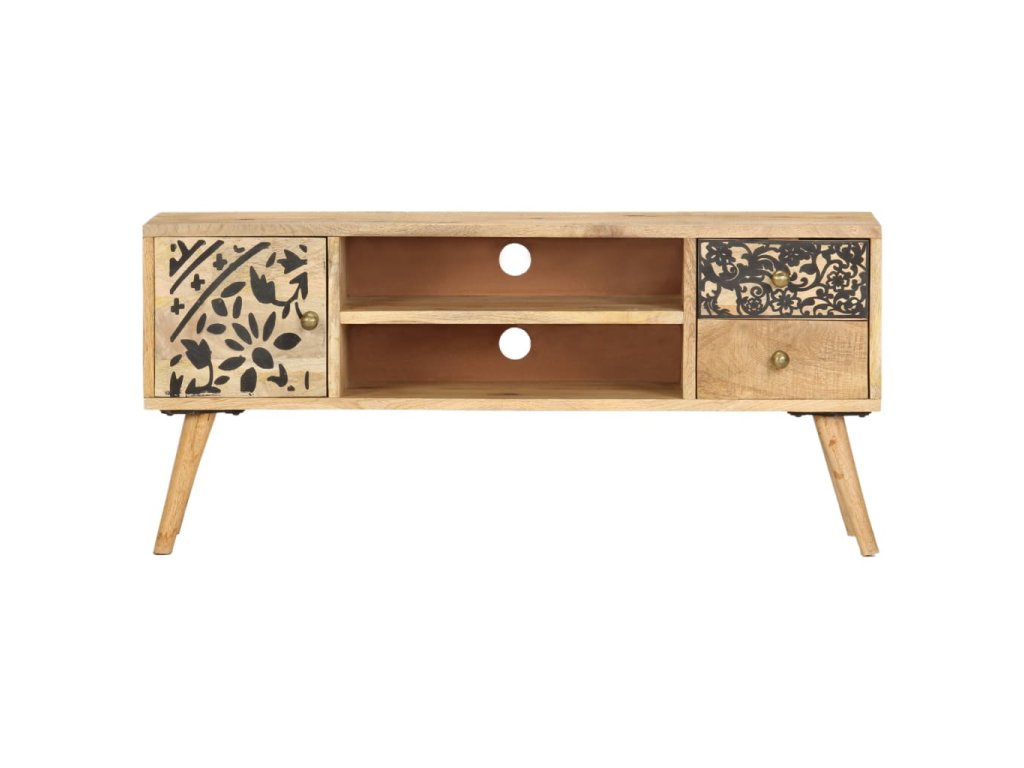 TV stolík je vyrobený z masívneho mangového dreva, ktoré je stabilné, odolné a krásne. Remeselné spracovanie mu dodáva veľkolepý retro štýl. Každý krok procesu výroby sa vykonáva s najväčšou starostlivosťou, či už ide o leštenie, natieranie alebo lakovanie. Vďaka remeselnému spracovaniu a štruktúre dreva je každý kus nábytku jedinečný a trochu odlišný od ostatných. Oceľové nohy mu dodáva stabilitu. Má 2 otvorené priehradky a 2 zásuvky, ktoré poskytujú dostatok priestoru pre uloženie DVD prehrávačov, herných konzol, streamingových zariadení a nosičov médií.