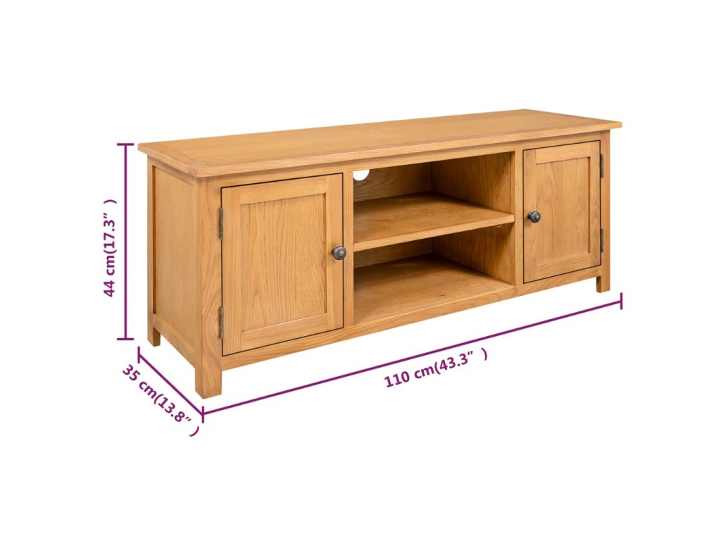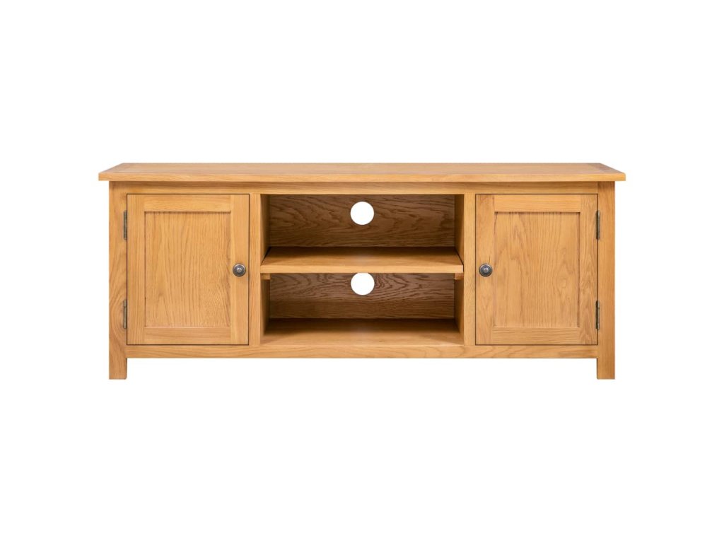 Pevný a robustný stojan na TV je vyhotovený z dubového dreva. Odolná vrchná doska poskytuje bezpečné a odolné miesto, kam si môžete položiť televíziu, košík s ovocím či vázu s kvetmi alebo iné ozdobné doplnky. TV skrinka má dvoje dvierok a dva otvorené priečinky, ktoré ponúkajú množstvo priestoru na odkladanie multimediálnych zariadení, kníh či iných predmetov.