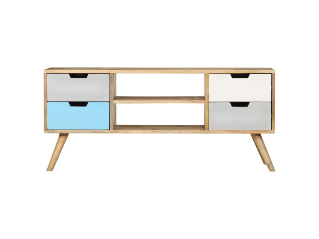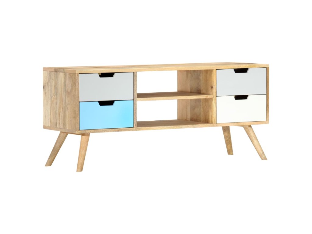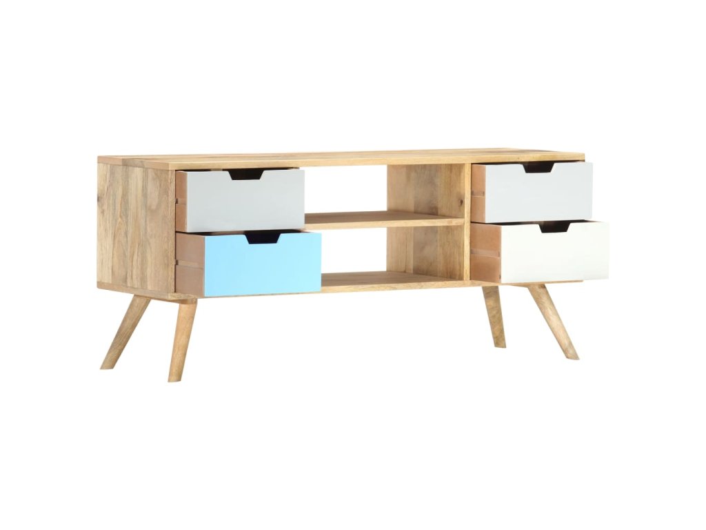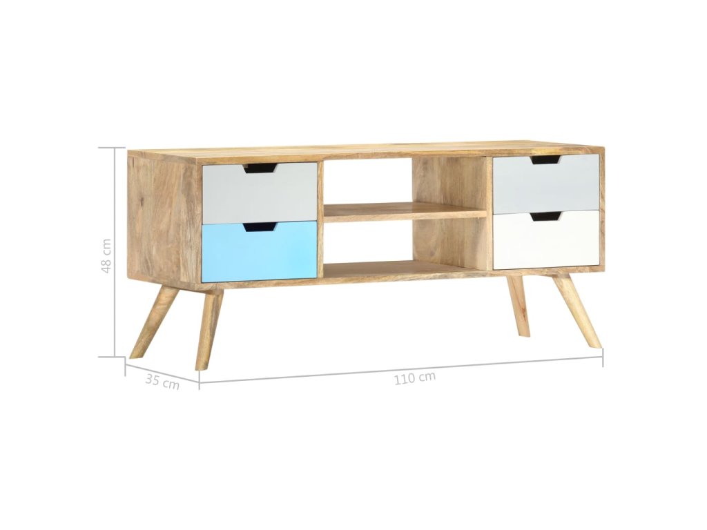 Skrinka je ručne vyrobená z mangovníkového dreva, ktoré je pevné, stabilné, trvácne a krásne a jej profesionálne spracovanie len umocňuje jej pôsobivý retro vzhľad. Každý krok výrobného procesu sa vykonáva s maximálnou starostlivosťou, či už ide o leštenie alebo lakovanie. Vďaka remeselnému spracovaniu a krásnej textúre dreva je každý kus nábytku jedinečný a trochu odlišný od ostatných kusov. Táto skrinka má pevnú vrchnú dosku, na ktorú môžete položiť rôzne ozdobné predmety, ako napríklad košíky s ovocím alebo vázy. Táto komoda má 4 zásuvky a 2 priečinky a poskytuje množstvo priestoru na odkladanie dôležitých predmetov, ktoré potrebujete mať na dosah ruky. Montáž TV stolíka je jednoduchá.