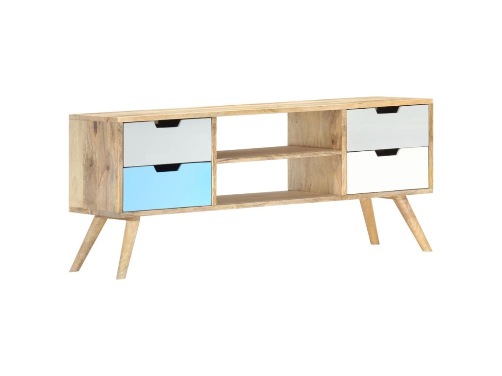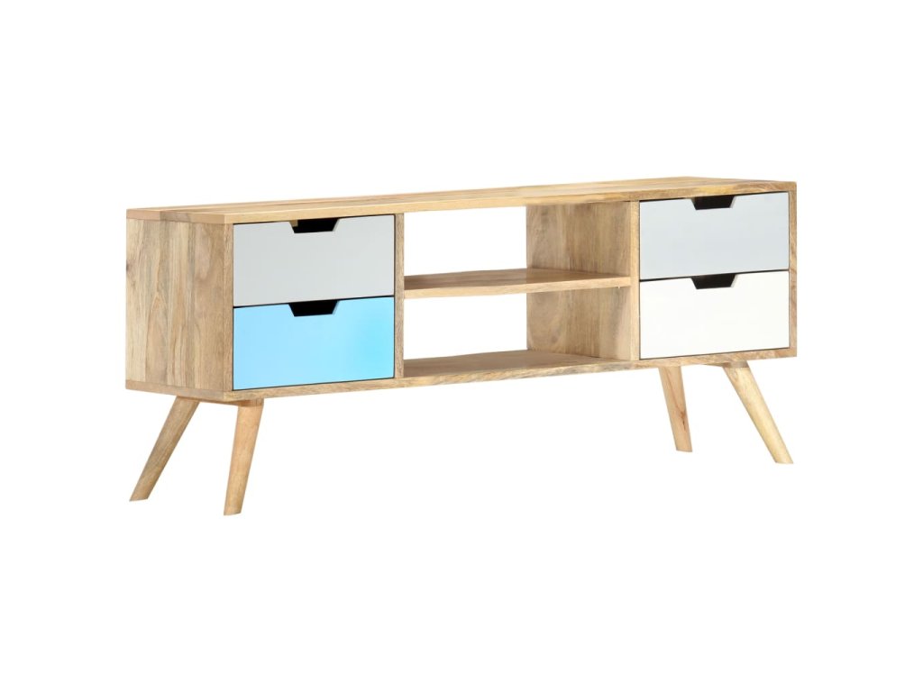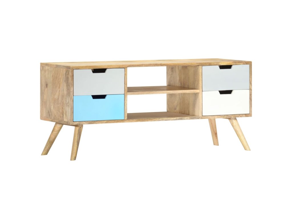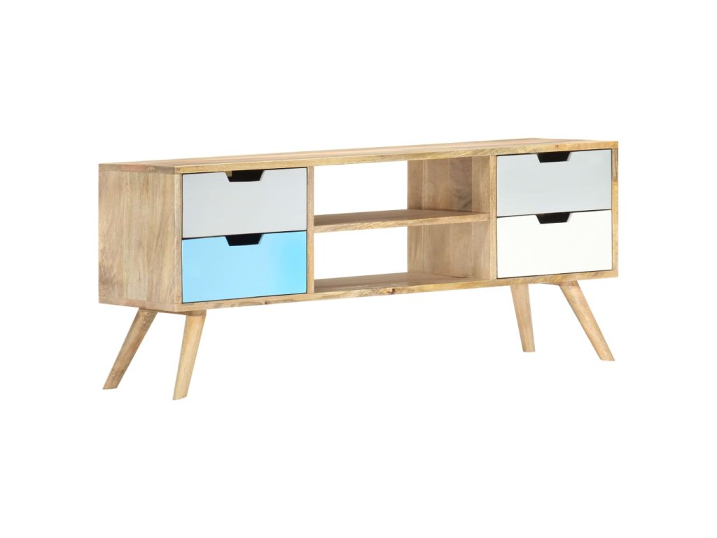 Skrinka je ručne vyrobená z mangovníkového dreva, ktoré je pevné, stabilné, trvácne a krásne a jej profesionálne spracovanie len umocňuje jej pôsobivý retro vzhľad. Každý krok výrobného procesu sa vykonáva s maximálnou starostlivosťou, či už ide o leštenie alebo lakovanie. Vďaka remeselnému spracovaniu a krásnej textúre dreva je každý kus nábytku jedinečný a trochu odlišný od ostatných kusov. Táto skrinka má pevnú vrchnú dosku, na ktorú môžete položiť rôzne ozdobné predmety, ako napríklad košíky s ovocím alebo vázy. Táto komoda má 4 zásuvky a 2 priečinky a poskytuje množstvo priestoru na odkladanie dôležitých predmetov, ktoré potrebujete mať na dosah ruky. Montáž TV stolíka je jednoduchá.
