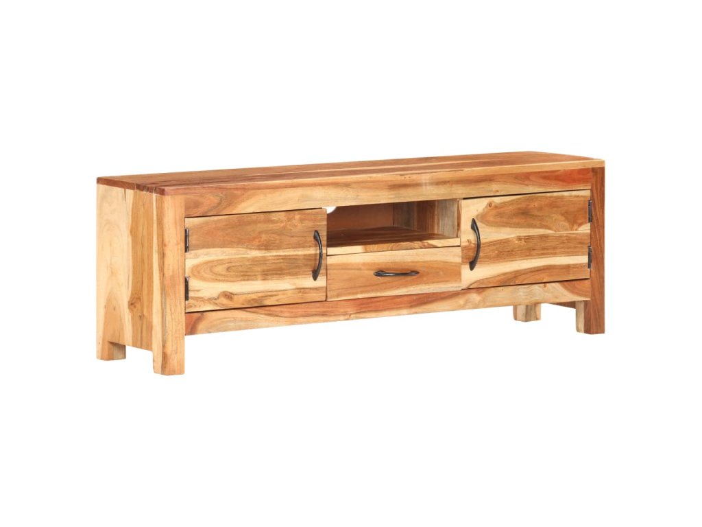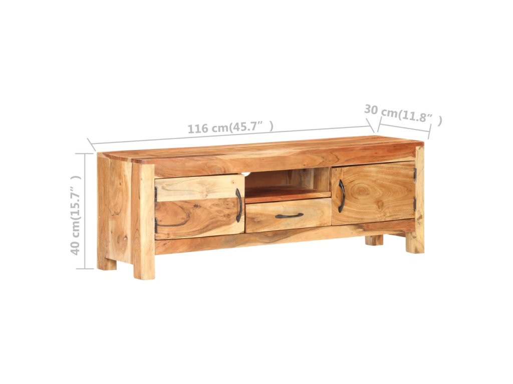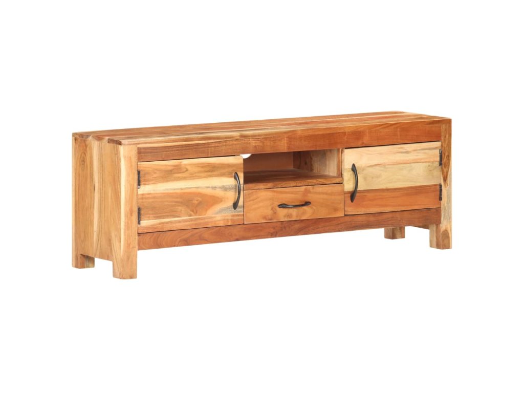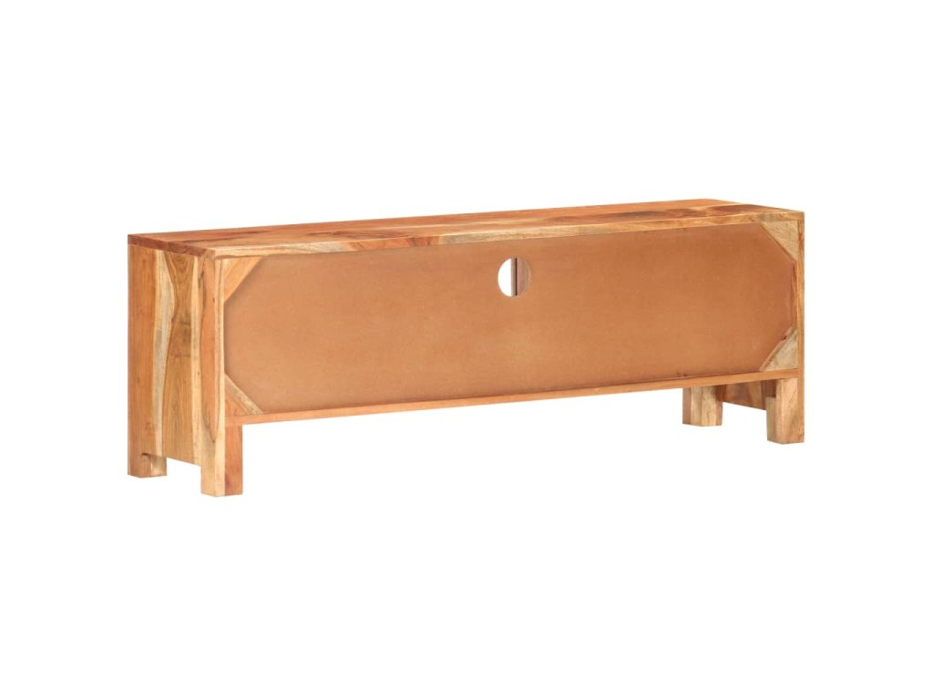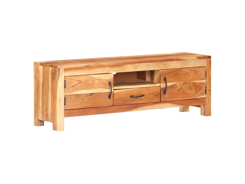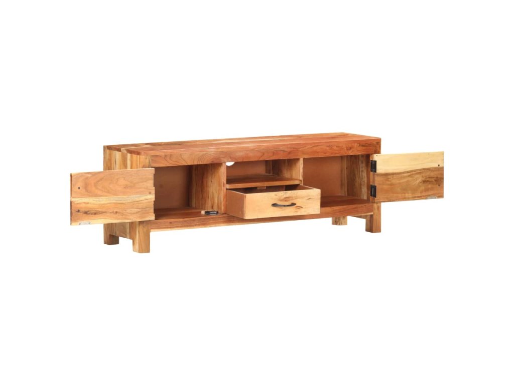 Stereo skrinka je vyrobená z masívneho akáciového dreva s prírodnou povrchovou úpravou, vďaka čomu je stabilná a odolná. Vďaka remeselnému spracovaniu a krásnej štruktúre dreva je každý kus nábytku jedinečný a mierne odlišný od ostatných. Multimediálna skrinka má tiež dve dvierka, zásuvku a poličku, ktoré poskytujú dostatok úložného priestoru. Okrem toho možno robustnú hornú časť použiť na vystavenie dekoratívnych predmetov, ako sú fotorámiky, rastliny v kvetináčoch, vázy atď.
