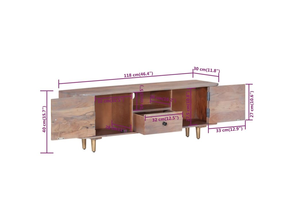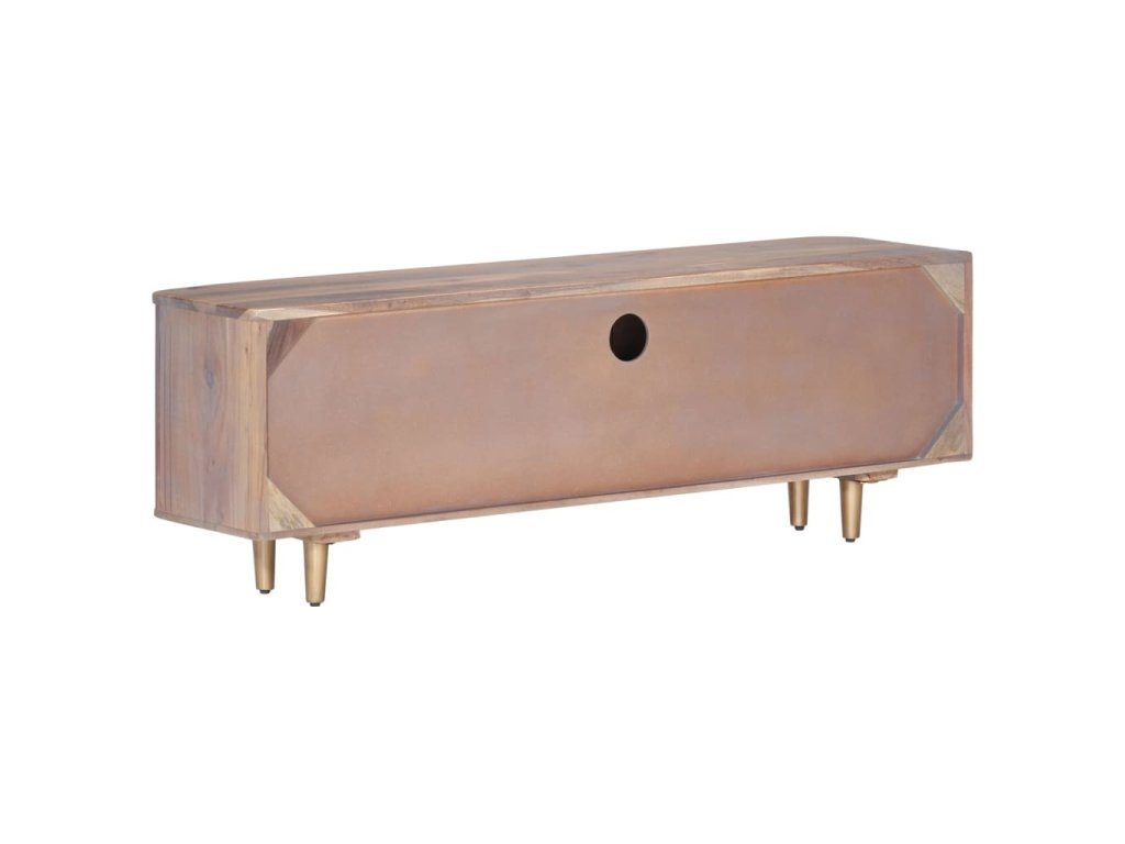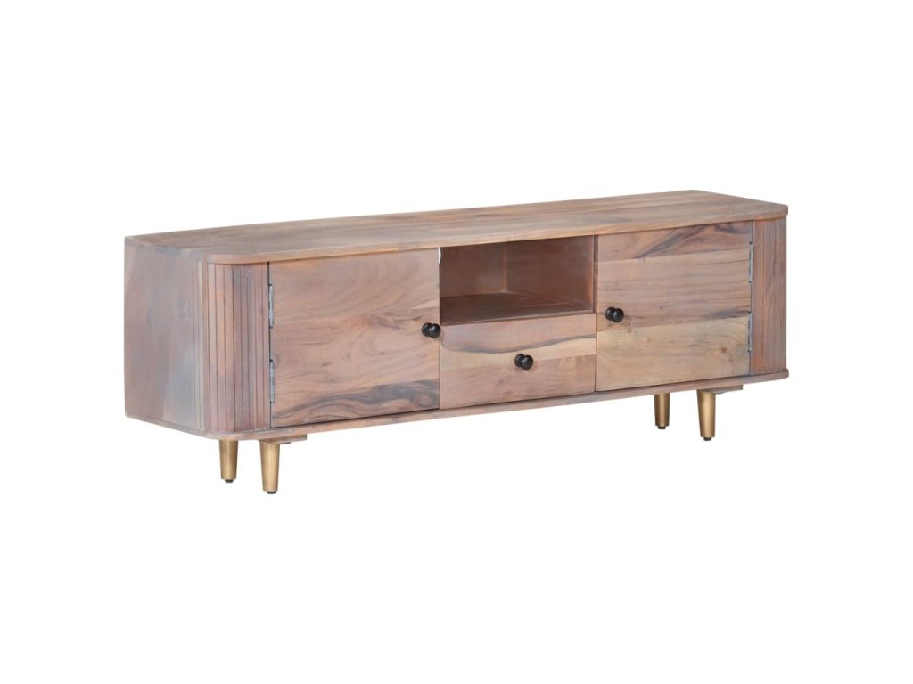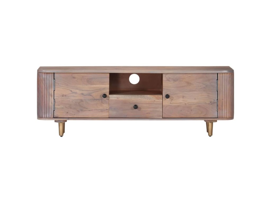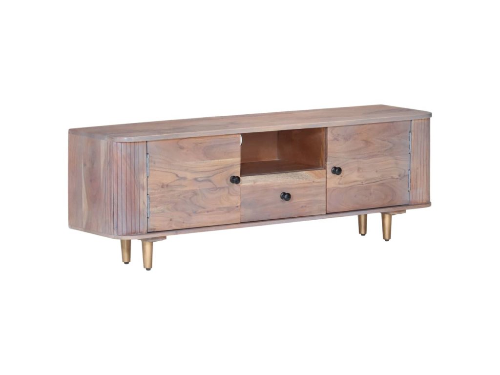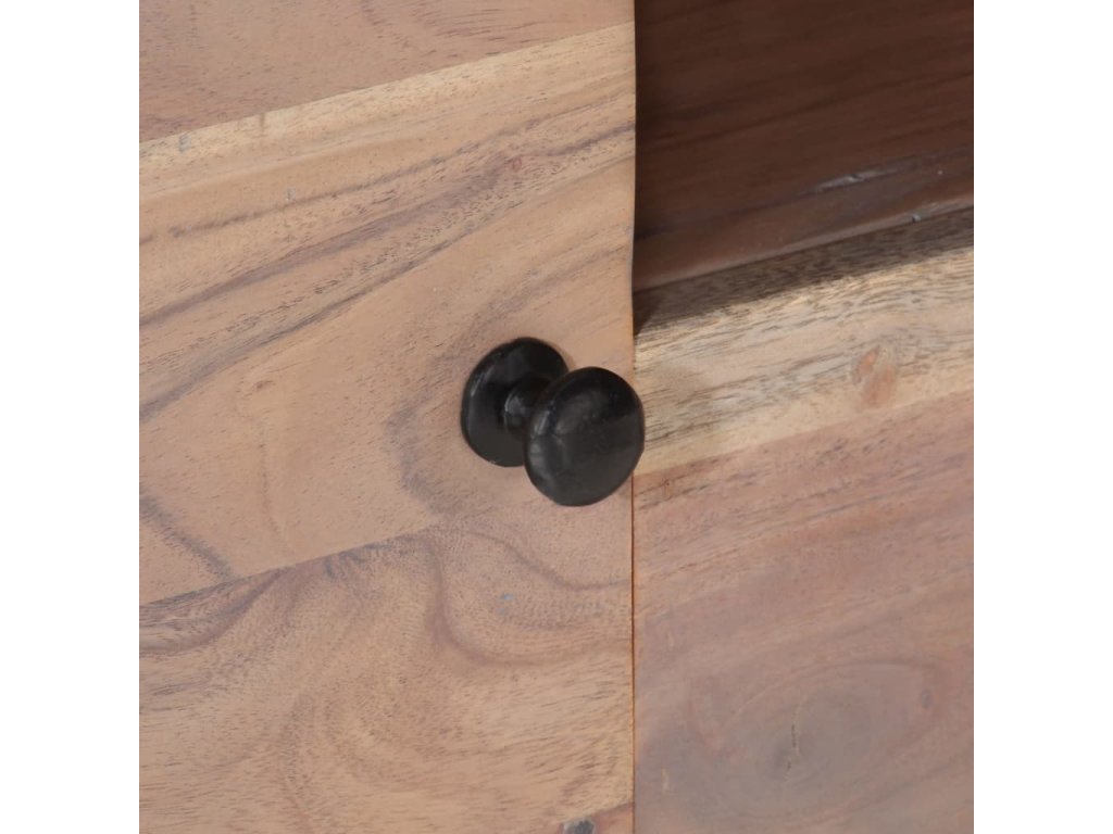 TV stolík je vyrobený z masívneho akáciového dreva, tvrdého dreva s bohatou štruktúrou, vďaka čomu je stabilný a odolný. Železné nohy dodávajú mimoriadnu stabilitu a dosku môžete použiť na umiestnenie dekoratívnych predmetov. Úložný priečinok a zásuvky poskytujú dostatok priestoru na uloženie vašich multimediálnych zariadení, kníh a rôznych iných predmetov.