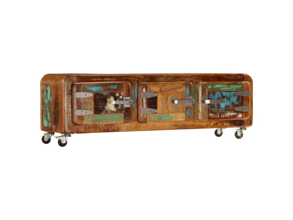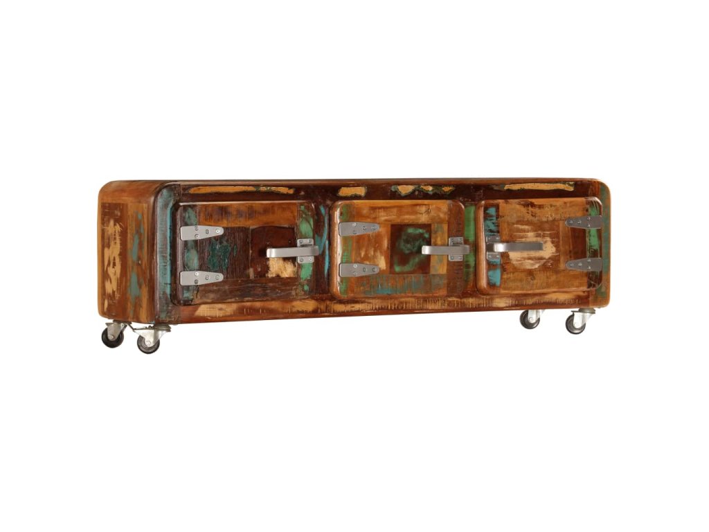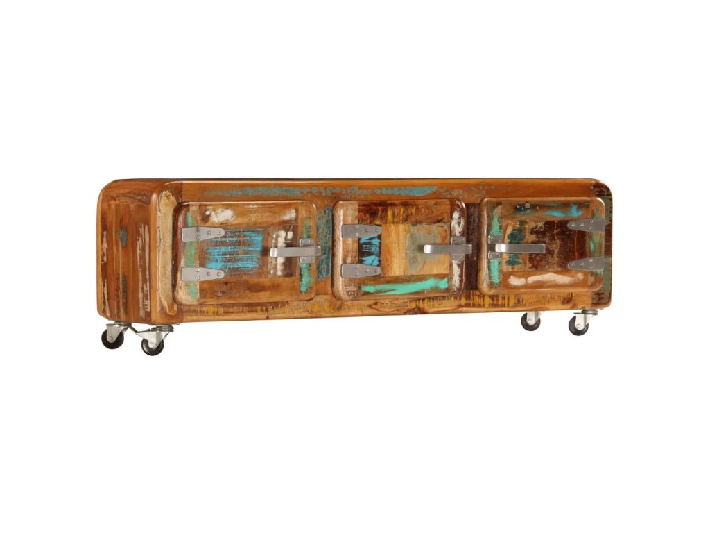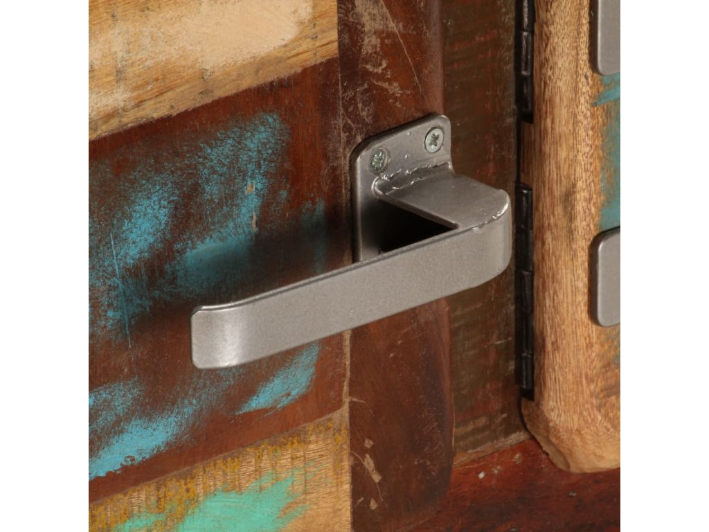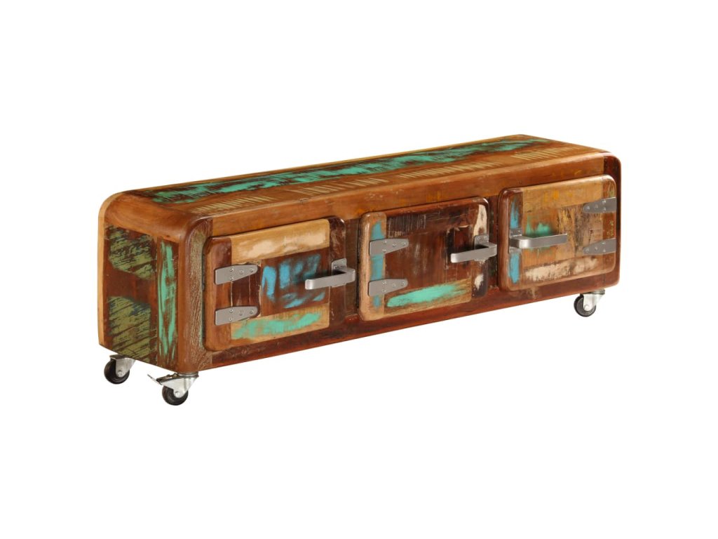 Skrinka na Hi-Fi vežu je vyrobená z recyklovaného masívu, ktorý pochádza z trámov, podláh a nosníkov zo starých zbúraných stavieb a pozostáva z rôznych typov dreva, ako napríklad borovicového, tíkového, bukového, dubového, cédrového, mangového či akáciového dreva. Recyklované drevo sa preto vyznačuje vlastnosťami týchto typov dreva. Recyklované drevo je staré, zvetrané a usušené, a preto sa nezmršťuje ani neohýba. Nízka skrinka je kompletne ručne vyrobená a vďaka krásnej textúre dreva je každý kus nábytku jedinečný a trochu odlišný od ostatných. Kovové prvky umocňujú industriálny vzhľad skrinky. Komoda s 3 skrinkami s dvierkami poskytuje množstvo úložného priestoru na multimediálne zariadenia, knihy či rôzne iné predmety. TV skrinka je vybavená 4 otočnými kolieskami, a tak sa dá jednoducho premiestniť.