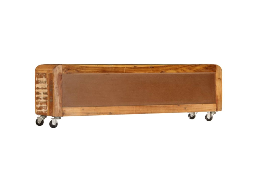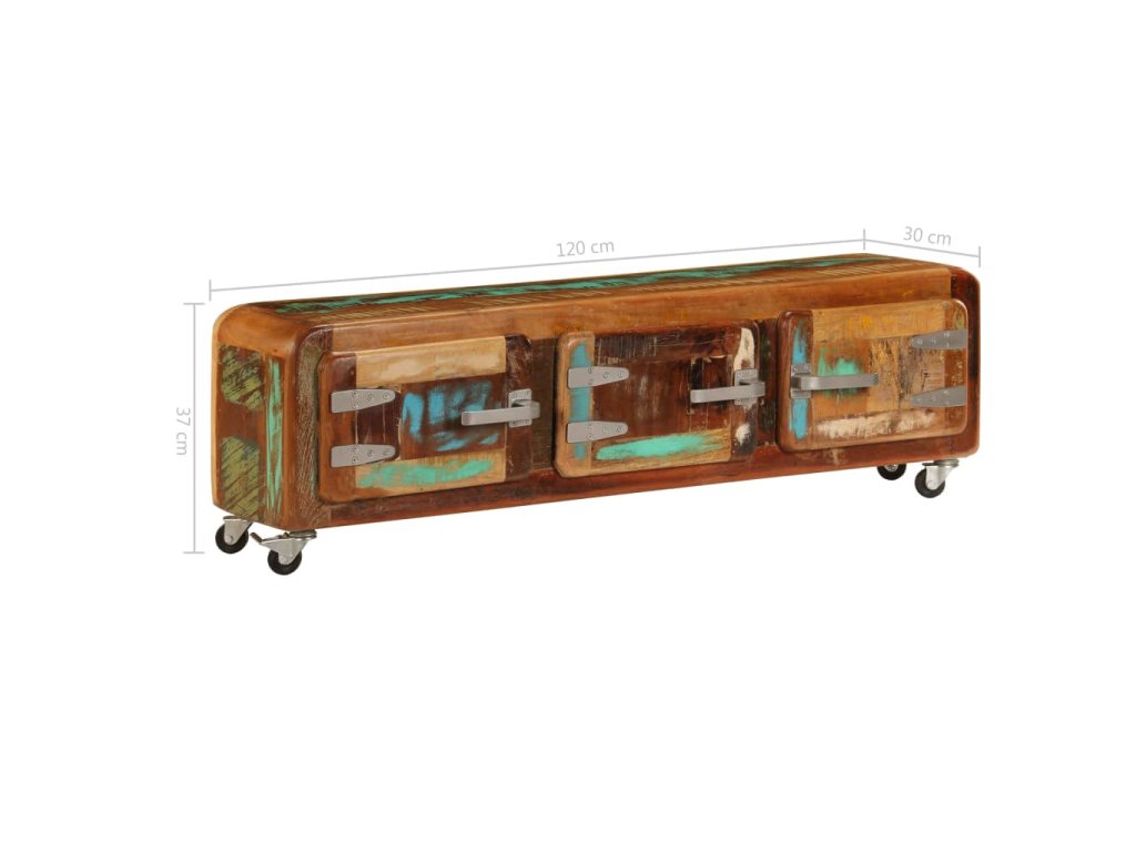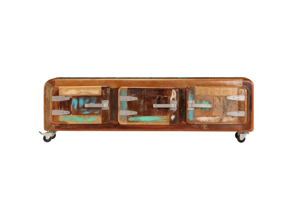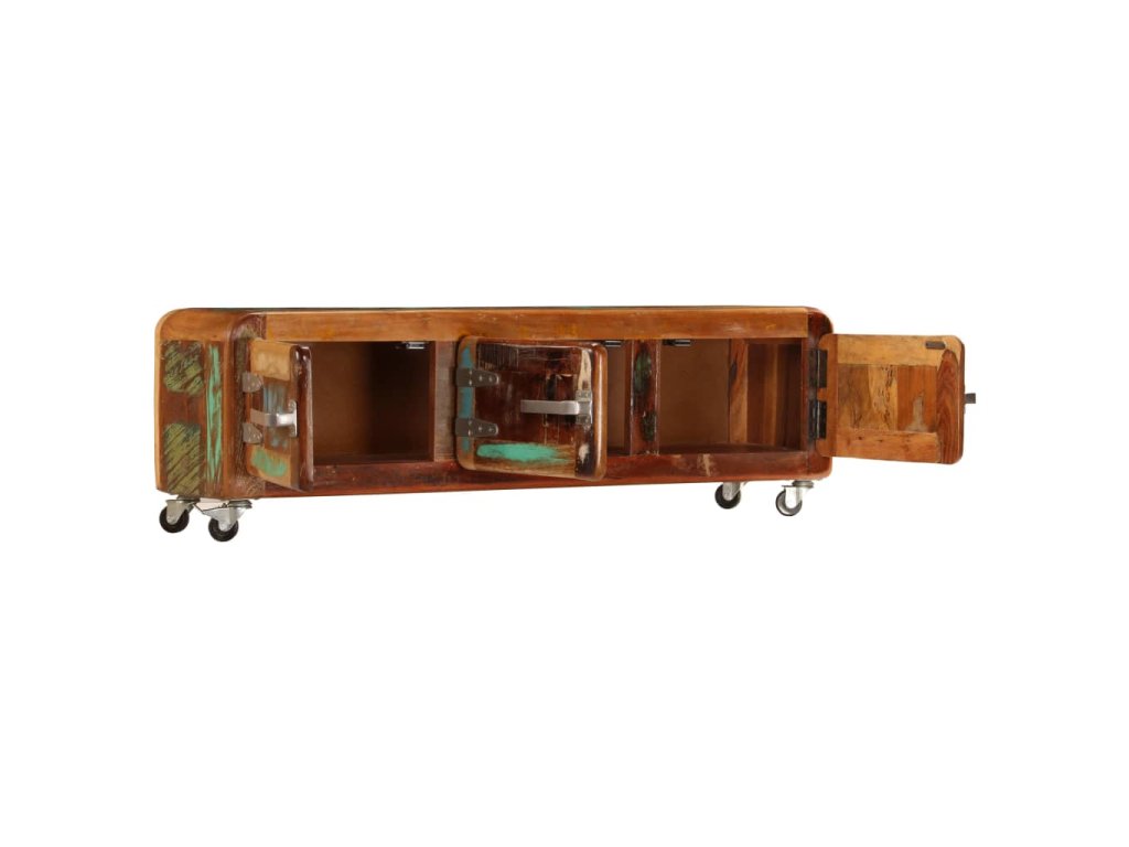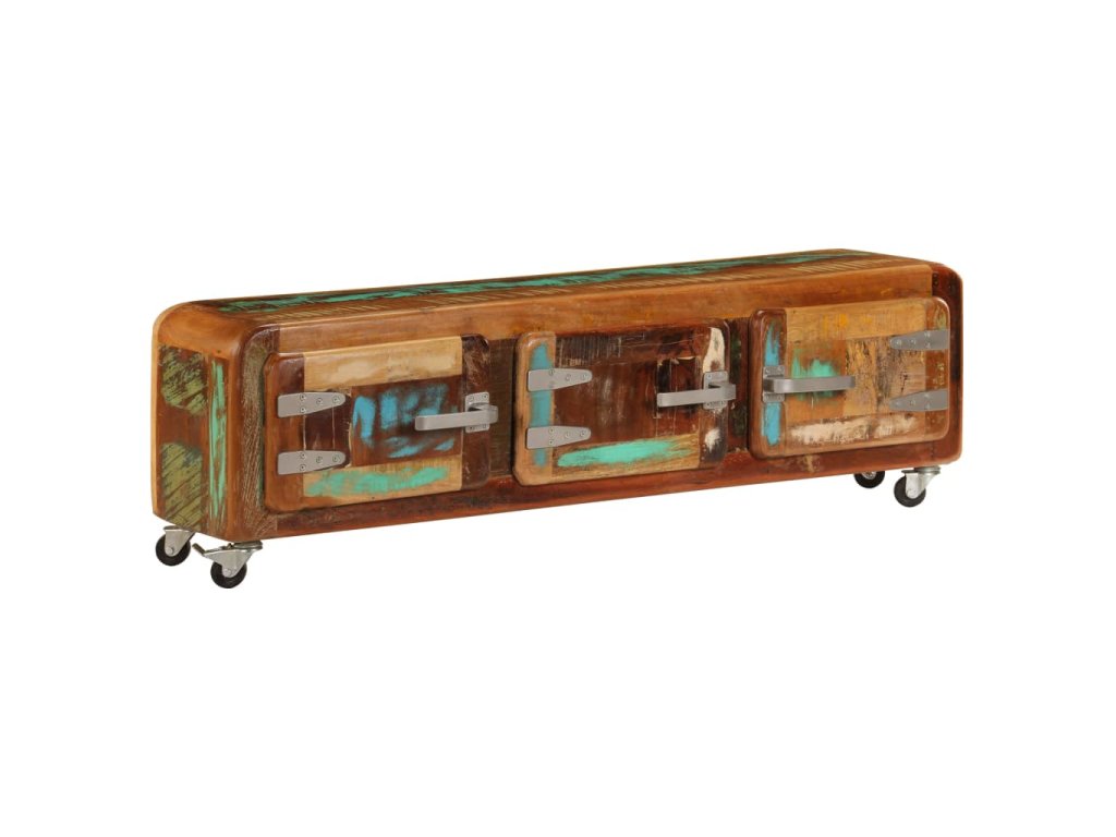 Skrinka na Hi-Fi vežu je vyrobená z recyklovaného masívu, ktorý pochádza z trámov, podláh a nosníkov zo starých zbúraných stavieb a pozostáva z rôznych typov dreva, ako napríklad borovicového, tíkového, bukového, dubového, cédrového, mangového či akáciového dreva. Recyklované drevo sa preto vyznačuje vlastnosťami týchto typov dreva. Recyklované drevo je staré, zvetrané a usušené, a preto sa nezmršťuje ani neohýba. Nízka skrinka je kompletne ručne vyrobená a vďaka krásnej textúre dreva je každý kus nábytku jedinečný a trochu odlišný od ostatných. Kovové prvky umocňujú industriálny vzhľad skrinky. Komoda s 3 skrinkami s dvierkami poskytuje množstvo úložného priestoru na multimediálne zariadenia, knihy či rôzne iné predmety. TV skrinka je vybavená 4 otočnými kolieskami, a tak sa dá jednoducho premiestniť.