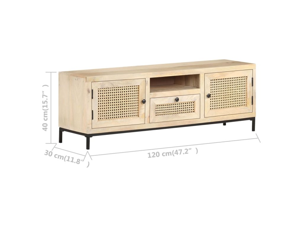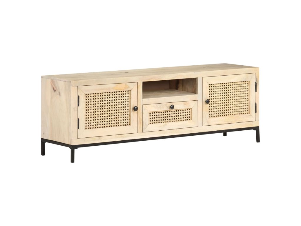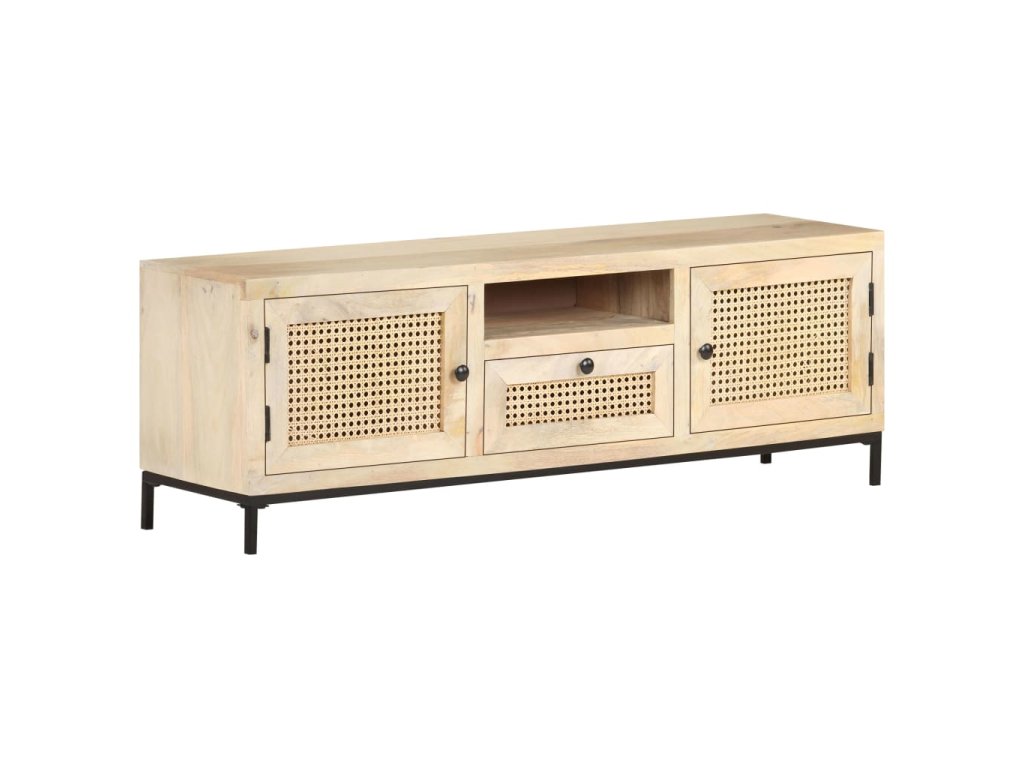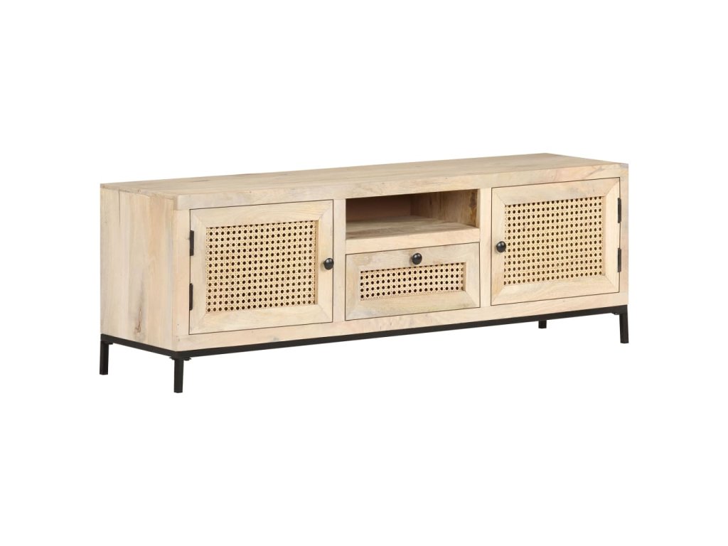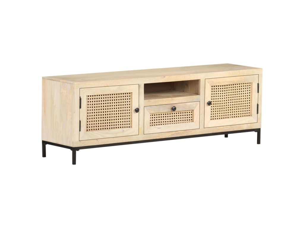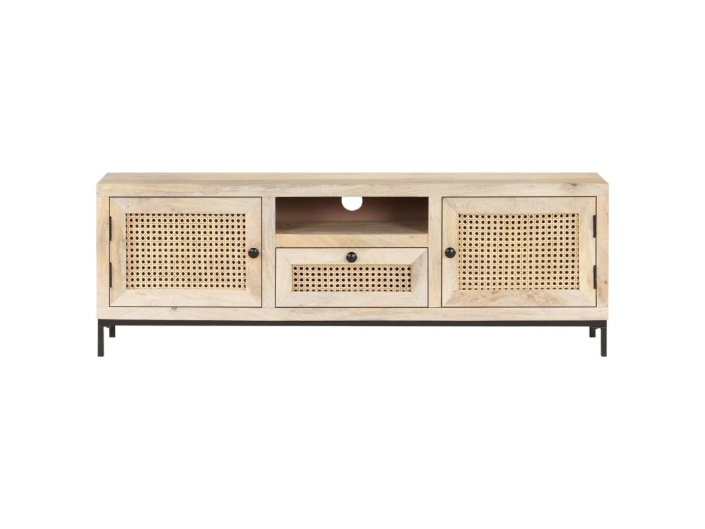 Masívne mangovníkové drevo je tropické tvrdé drevo, ktoré sa môže pochváliť nielen pevnosťou, ktorá unesie veľkú hmotnosť, ale aj odolnosťou voči opotrebovaniu. Vďaka vynikajúcemu remeselnému spracovaniu a krásnej štruktúre dreva je každá HiFi skrinka mierne odlišná od ostatných kusov. Stereo skrinka je vybavená dostatočným úložným priestorom, takže môžete svoje veci vystaviť alebo prehľadne uložiť. Oceľová základňa prispieva k pevnosti a stabilite. A čo viac, TV skrinka má na dvierkach a zásuvke ručne tkanú trstinu, ktorá dotvára rustikálny pôvab.