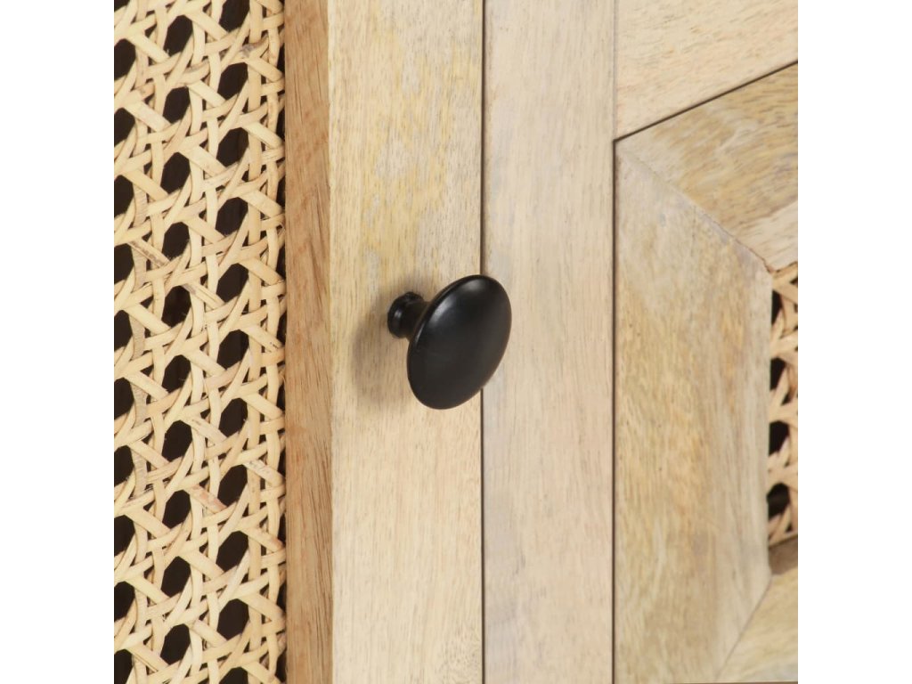 - Materiál: Masívne mangovníkové drevo s bieleným povrchom, prírodná trstina, práškovaná oceľ