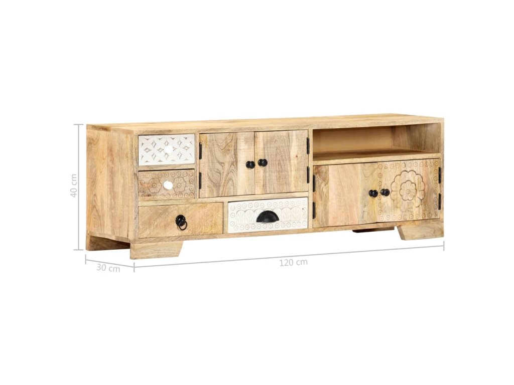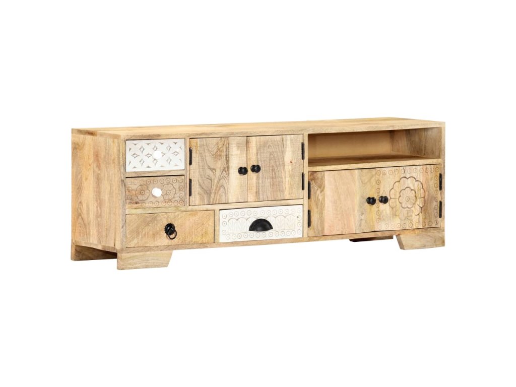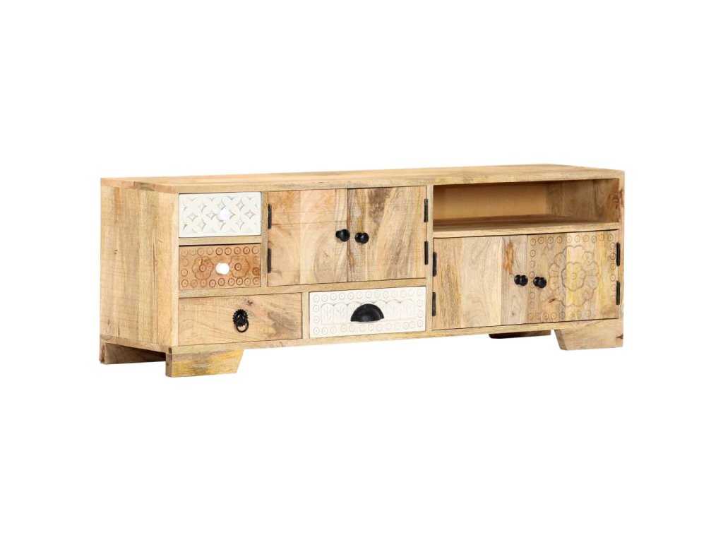 Ak hľadáte do svojho bývania jednoduchý doplnok s rustikálnym šarmom, táto TV skrinka z dreveného masívu je pre vás ako stvorená. TV stolík obsahuje 4 zásuvky, 2 priečinky s dvierkami a 1 priečinok na odkladanie rôznych potrieb, a tak predstavuje praktický, a zároveň pôsobivý doplnok do interiéru.