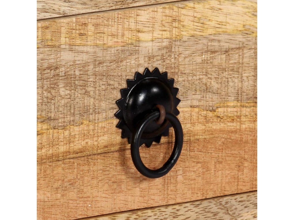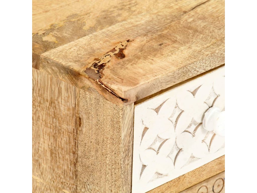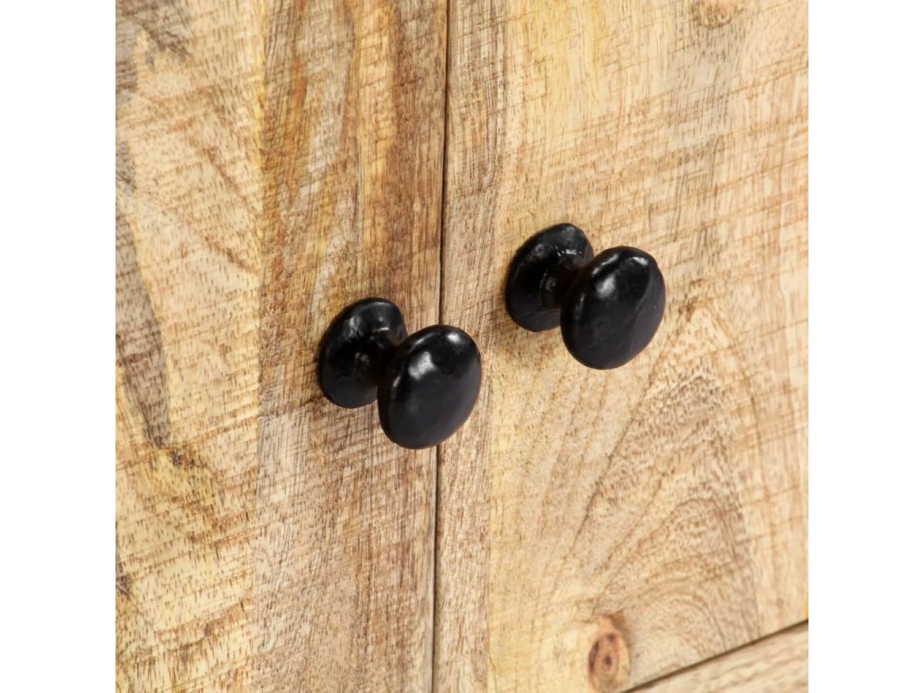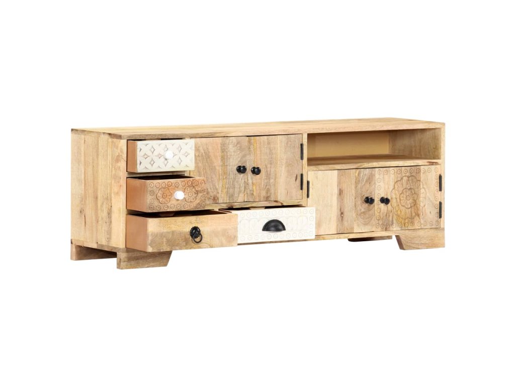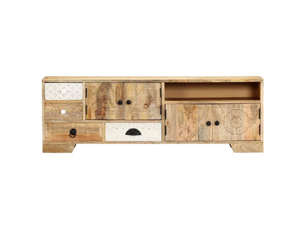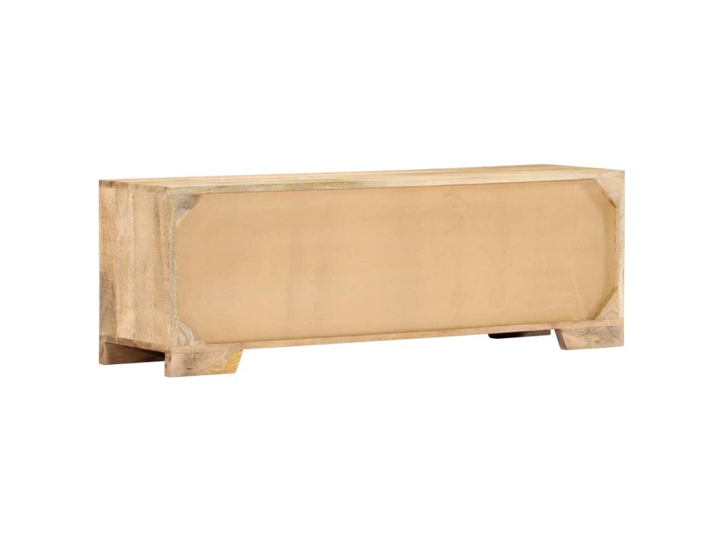 Táto Hifi skrinka je vyrobená z masívneho mangovníkového dreva s prírodným náterom a vyžaruje z nej originálny vzhľad. Vďaka vynikajúcemu remeselnému spracovaniu a krásnej štruktúre mangovníkového dreva je každý kus tohto nábytku jedinečný a mierne odlišný od ostatných kusov. Ozdobný vyrezávaný vzor a kovové rúčky navyše prispievajú ku kráse tejto skrinky.