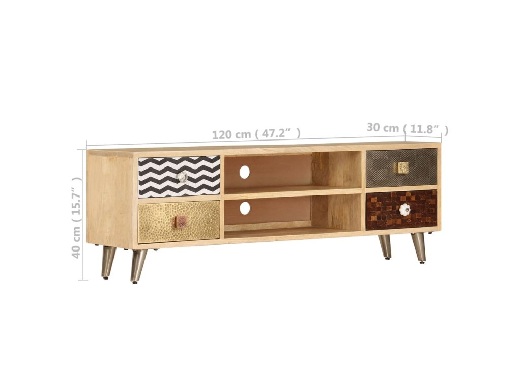 TV skrinka je vyrobená z masívneho mangovníkového dreva, ktoré je stabilné, odolné a krásne. Remeselné spracovanie jej dodáva veľkolepý retro štýl. Každý krok procesu výroby sa vykonáva s najväčšou starostlivosťou, či už ide o leštenie, natieranie alebo lakovanie. Vďaka remeselnému spracovaniu a štruktúre dreva je každý kus nábytku jedinečný a trochu odlišný od ostatných. Kovové nohy jej dodávajú stabilitu. Má 2 priehradky a 4 zásuvky, ktoré poskytujú dostatok priestoru pre úhľadné uloženie DVD prehrávačov, herných konzol, streamingových zariadení a nosičov médií.