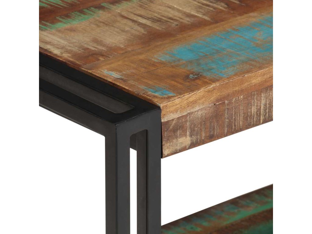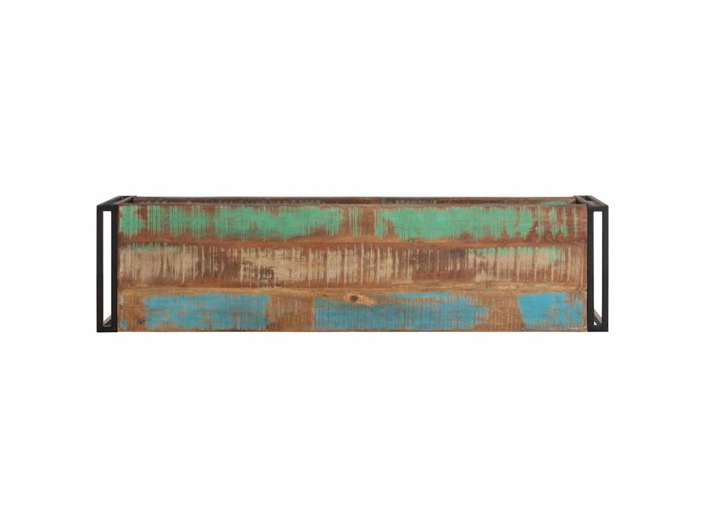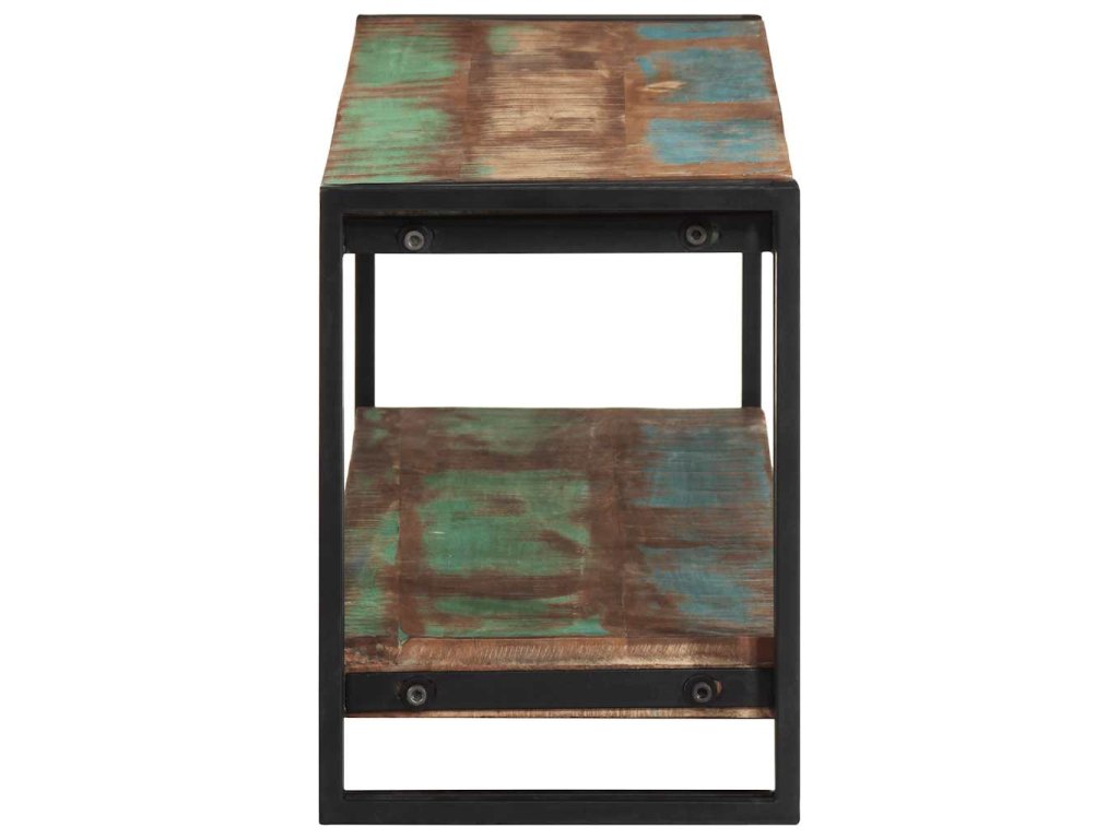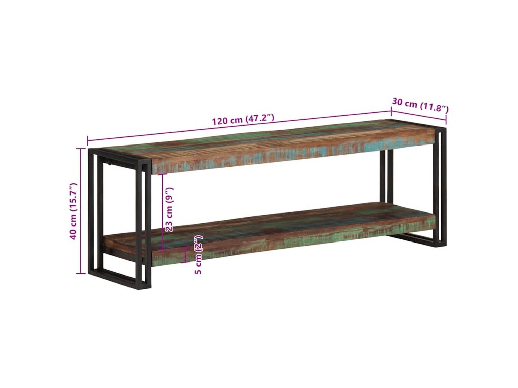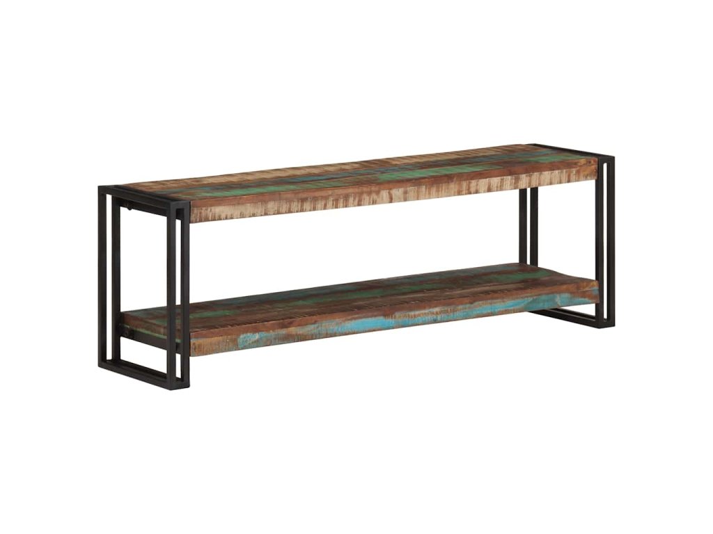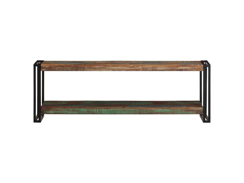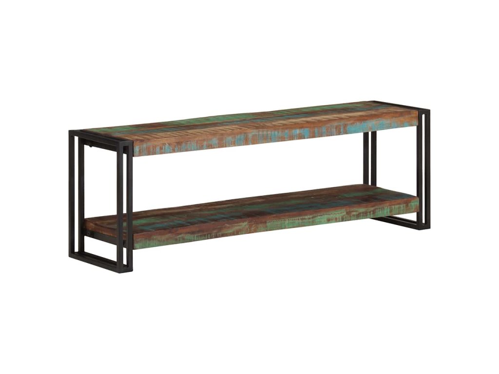 TV skrinka je vyrobená z masívneho recyklovaného dreva, ktoré pochádza z trámov, podláh a nosníkov starých zbúraných stavieb. Okrem toho môže pozostávať z rôznych druhov dreva, ako je teakové drevo, tvrdé drevo, tropické drevo, mangovníkové drevo atď. To znamená, že recyklované drevo si zachováva vlastnosti týchto rôznych druhov drevín. Recyklované drevo už je staré, zvetrané a vysušené. Preto sa nezmršťuje ani neohýba. Pevná vrchná doska sa dá použiť na uloženie dekoratívnych predmetov. Polica tiež poskytuje dostatok priestoru na uloženie vašich multimediálnych zariadení, kníh a rôznych ďalších vecí.