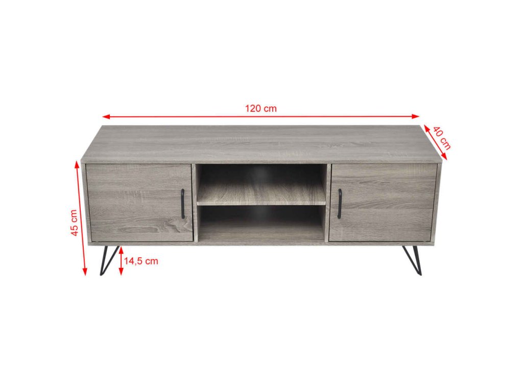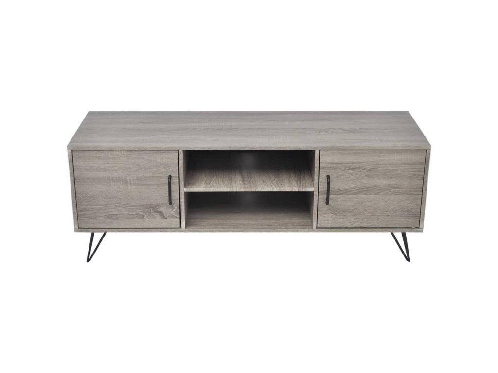 Šedá farba dáva stolíku rustikálny vzhľad, vďaka čomu sa bude hodiť do akejkoľvek domácnosti. Vďaka vysoko kvalitnému materiálu MDF a silným oceľovým nožičkám je tento TV stolík veľmi pevný a odolný. Veľké skrinky a poličky s dostatočným priestorom vám umožnia uložiť DVD prehrávač, hernú konzolu, streamingové zariadenie a nosiče médií. Dve zásuvky na káble umožňujú úhľadné uloženie všetkých káblov mimo dohľad.