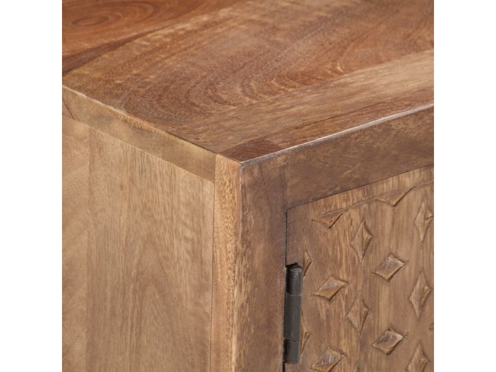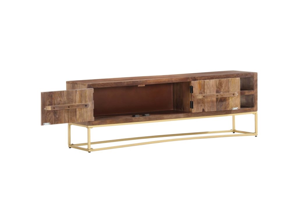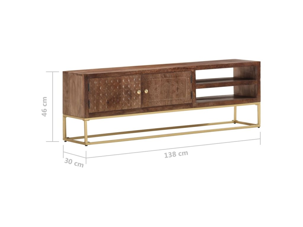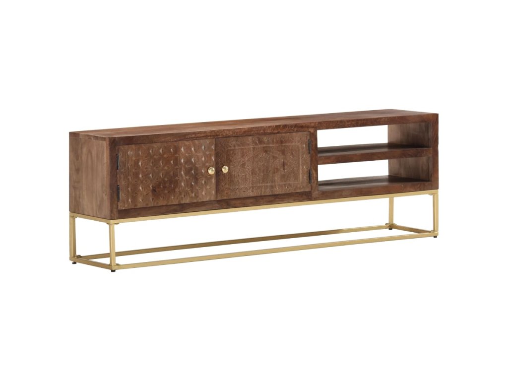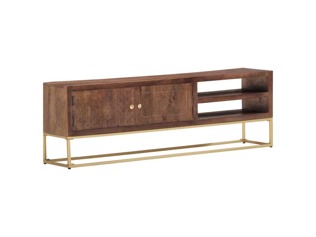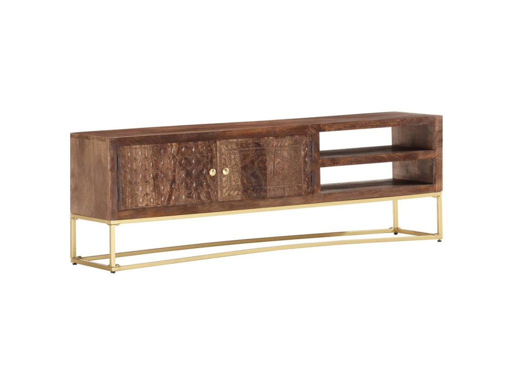 Stereo skrinka s ručne vyrezávanými časťami v prednej časti je ručne vyrobená z masívneho mangovníkového dreva, čo je husté a robustné tvrdé drevo s krásnymi hnedými alebo zlatými pruhmi a kontúrami na povrchu. Každý krok procesu výroby sa vykonáva s najväčšou starostlivosťou, či už ide o leštenie alebo lakovanie, a remeselné spracovanie mu dodáva veľkolepý retro štýl. Vďaka krásnej drevenej štruktúre bude každý kus nábytku jedinečný a mierne sa líši od iných kusov. Oceľový rám s práškovým povrchom prispieva k priemyselnému štýlu. Okrem toho má táto skrinka vo vintage štýle 2 dvierka a 2 priehradky, ktoré poskytujú dostatočný priestor pre uchovanie všetkých menších položiek, ktoré chcete mať na dosah ruky. Montáž je jednoduché.