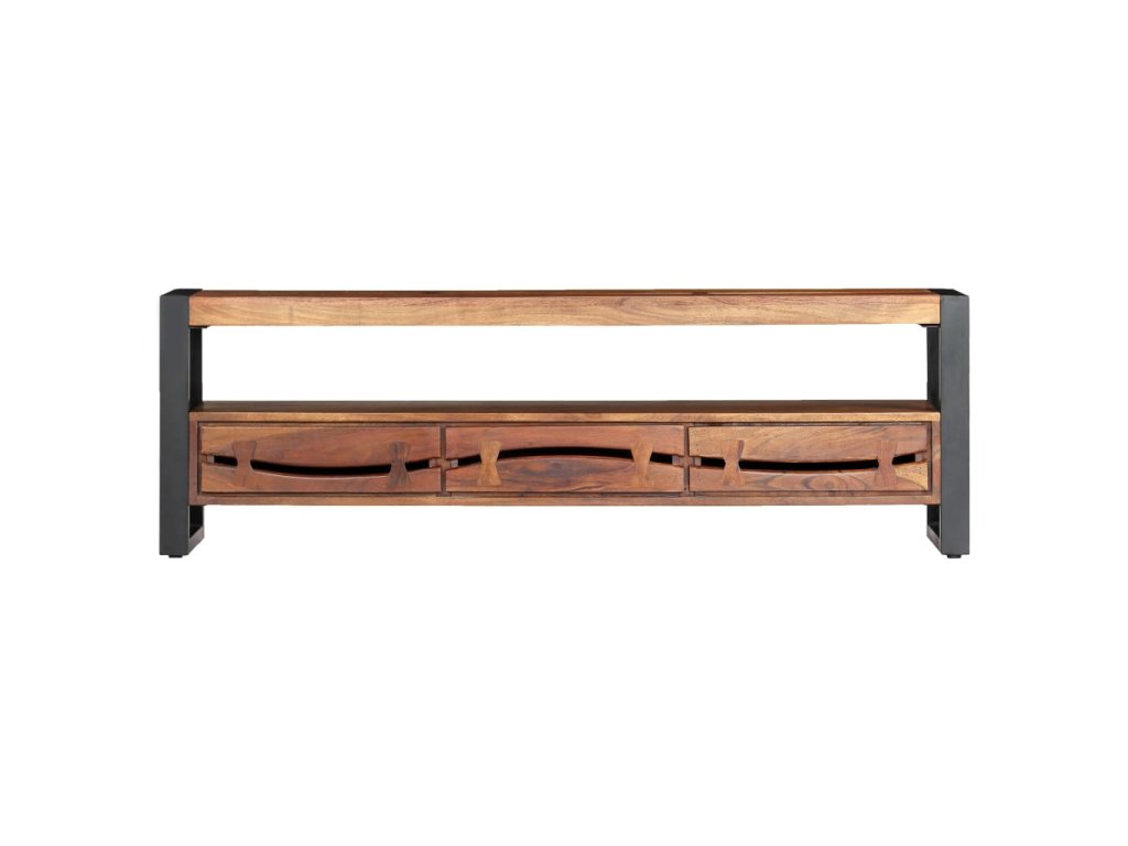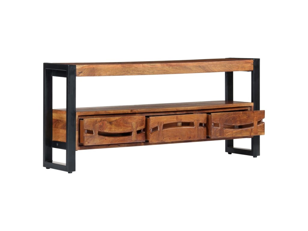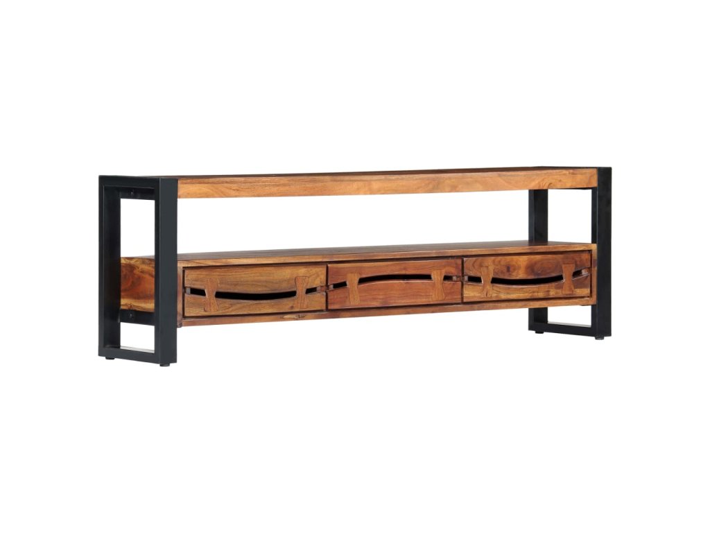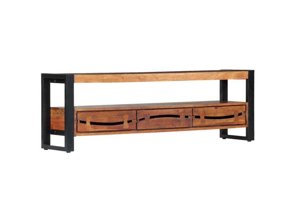 Táto drevená TV skrinka je nielen sofistikovaná a elegantná. Vďaka akáciovému masívu s medovým povrchom a oceľovému rámu z nej vyžaruje vintage šarm a priemyselný štýl.