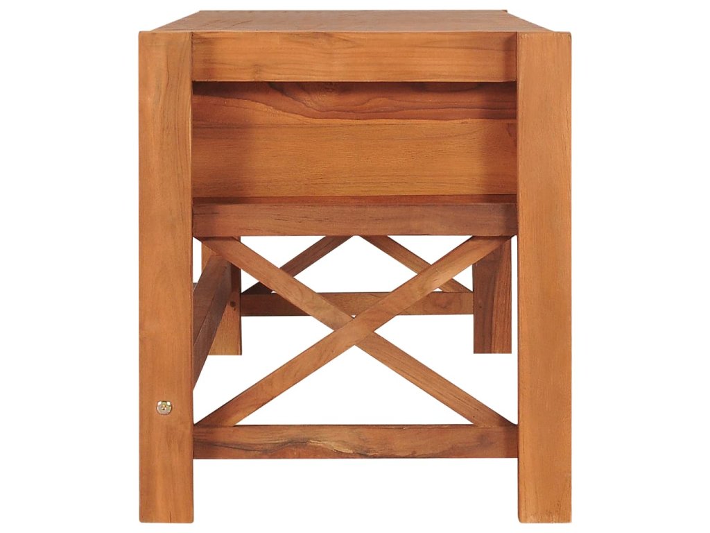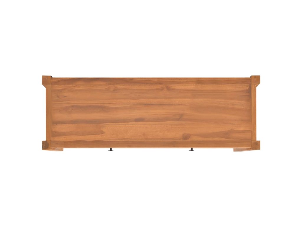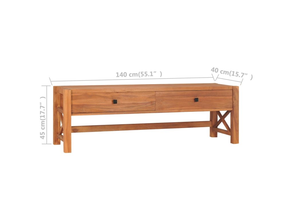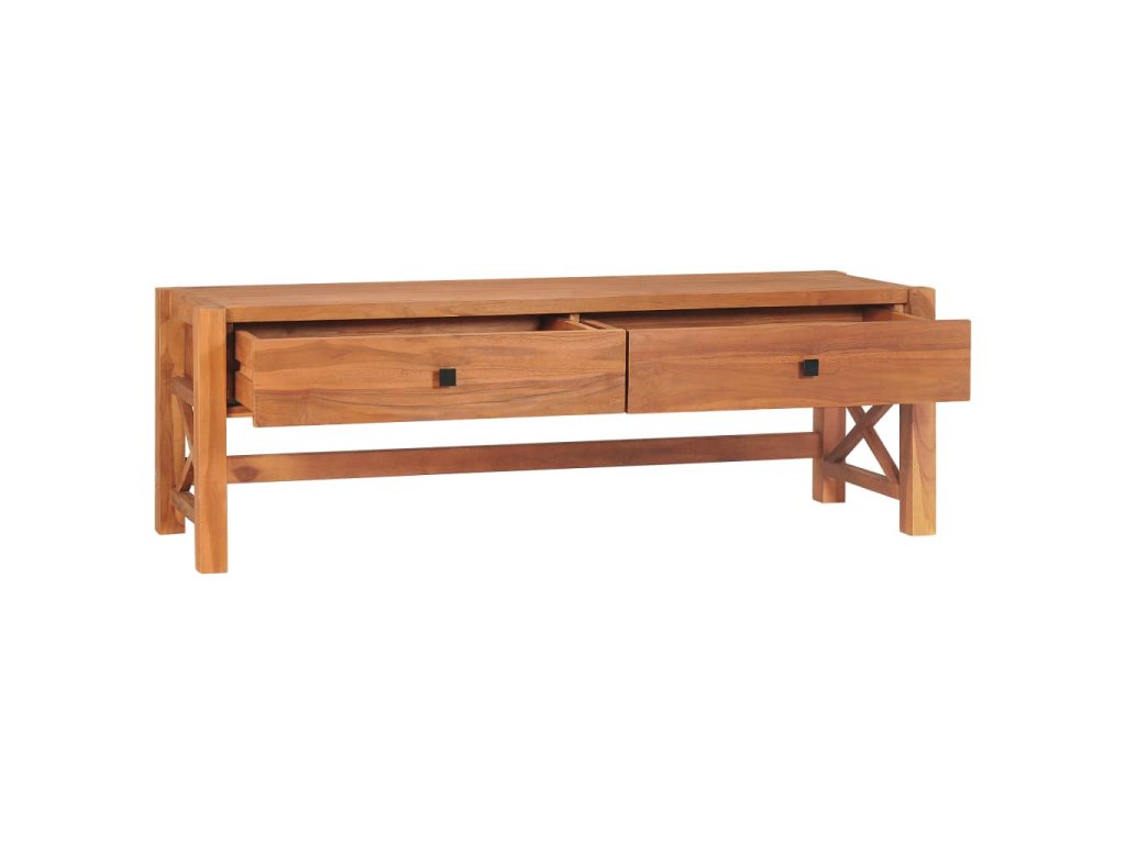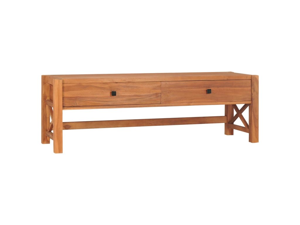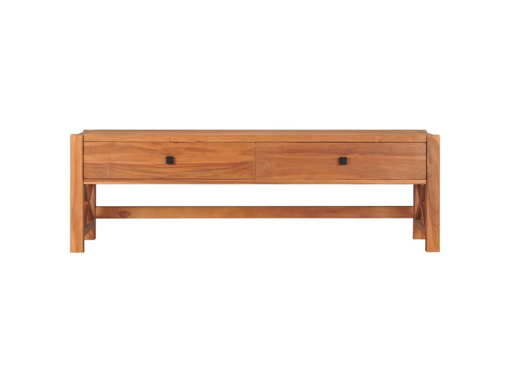 Táto TV skrinka je vyrobená z tíkového dreva, ktoré bolo umelo vysušené v sušiarni a jeho povrch bol následne jemne obrúsený, aby získal hladký vzhľad. Tíkové drevo sa vyznačuje výnimočnou pevnosťou, a tak predstavuje jeden z najvhodnejších materiálov na výrobu nábytku spomedzi všetkých ostatných druhov dreva. TV stolík má prírodnú farbu a pevnú vrchnú dosku z tvrdého dreva. Môžete si naň umiestniť televíziu, router, multimediálne zariadenia alebo si naň vystaviť dekoratívne predmety, ako sú fotorámiky, košíky s ovocím alebo vázy. Drevená skrinka na HiFi vežu má 2 zásuvky, ktoré poskytujú množstvo úložného priestoru na prehľadné odkladanie rôznych drobností, ktoré tak budete mať vždy poruke. TV nábytok je navyše trvácny a ľahko sa čistí.