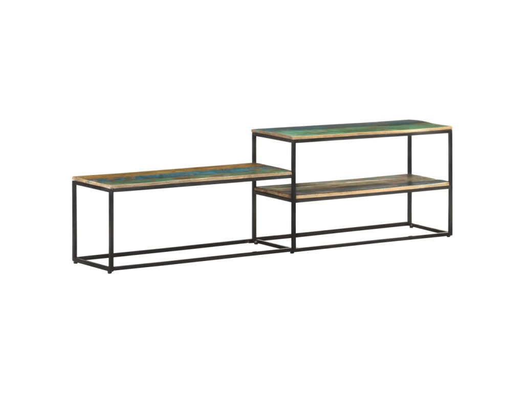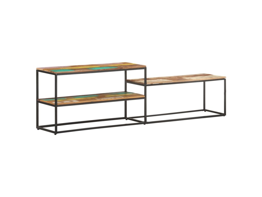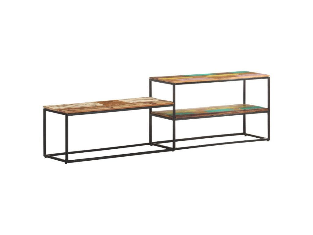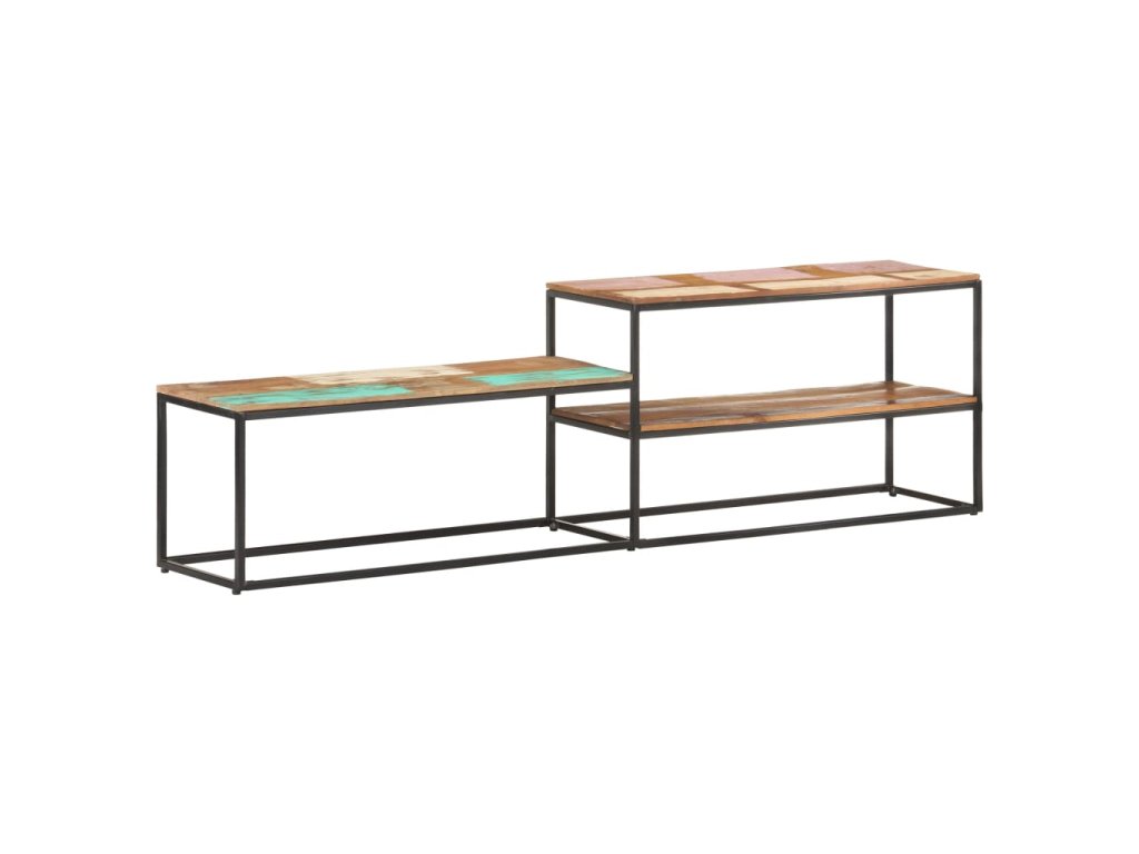 TV skrinka je vyrobená z MDF a masívneho recyklovaného dreva, ktoré pochádza z trámov, podláh a nosníkov starých zbúraných stavieb. Okrem toho môže pozostávať z rôznych druhov dreva, ako je teakové drevo, tvrdé drevo, tropické drevo, mangovníkové drevo atď. To znamená, že recyklované drevo si zachováva vlastnosti týchto rôznych druhov drevín. Recyklované drevo už je staré, zvetrané a vysušené. Preto sa nezmršťuje ani neohýba. Oceľový rám jej tiež dodáva ďalšiu stabilitu. Mediálna jednotka má 3 poličky, ktoré poskytujú dostatok priestoru na uloženie vašich multimediálnych zariadení, kníh a rôznych ďalších predmetov.