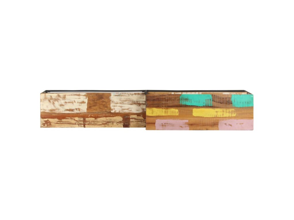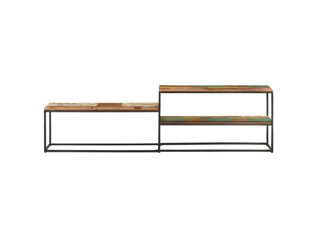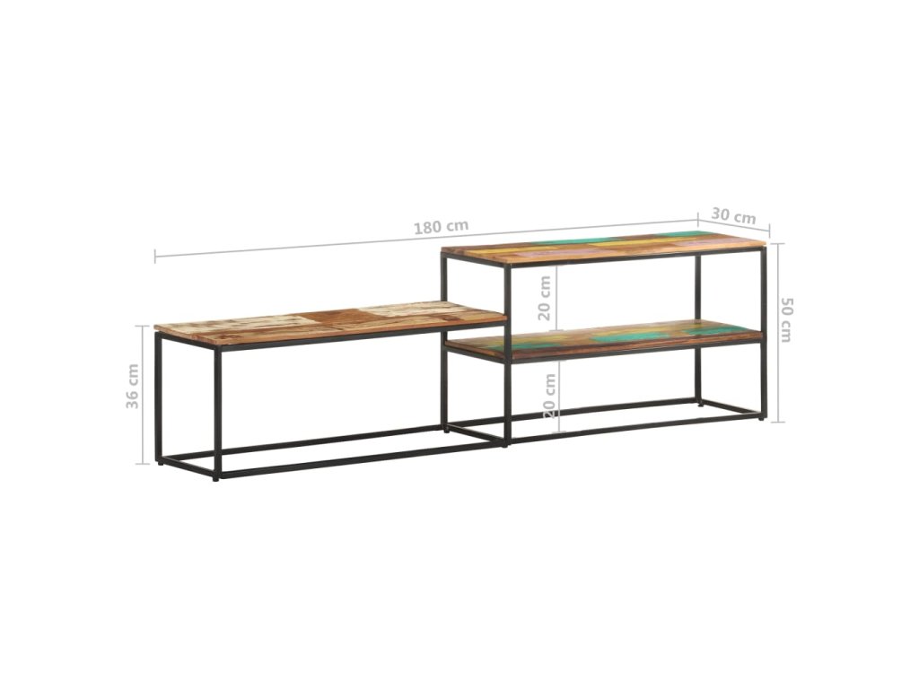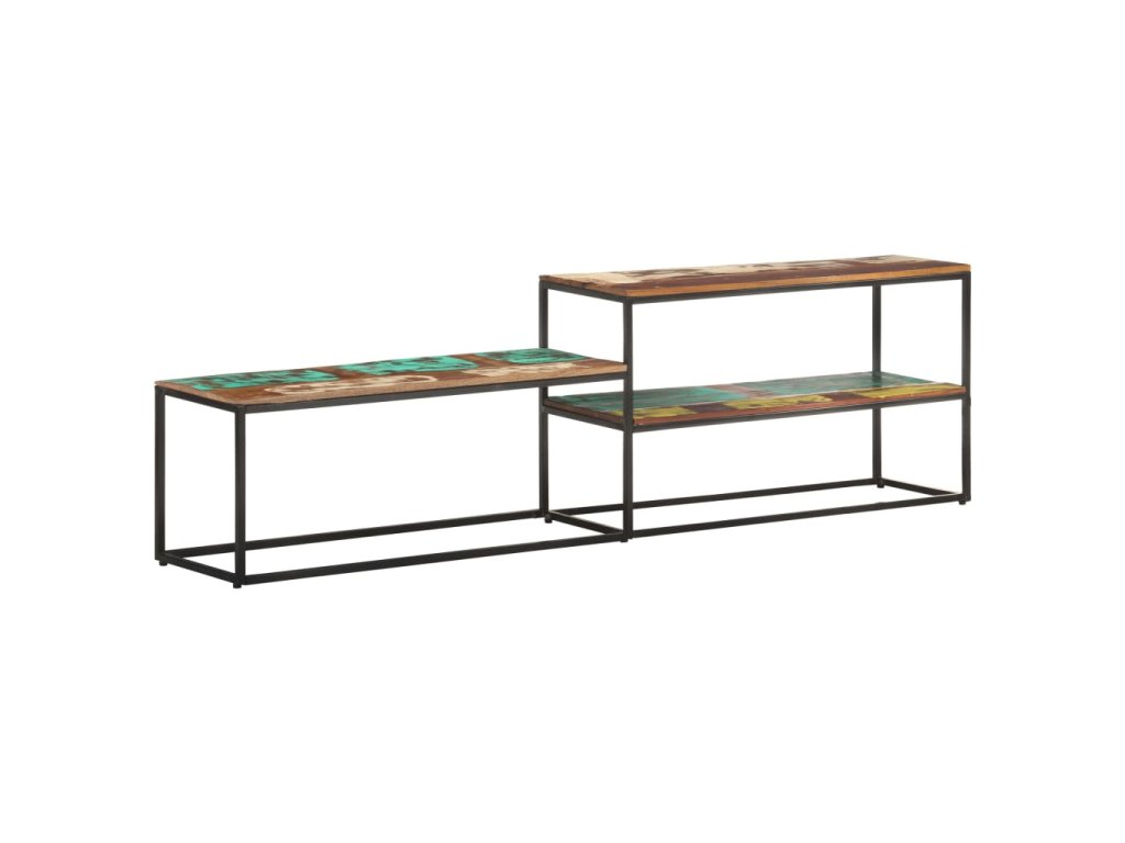 TV skrinka je vyrobená z MDF a masívneho recyklovaného dreva, ktoré pochádza z trámov, podláh a nosníkov starých zbúraných stavieb. Okrem toho môže pozostávať z rôznych druhov dreva, ako je teakové drevo, tvrdé drevo, tropické drevo, mangovníkové drevo atď. To znamená, že recyklované drevo si zachováva vlastnosti týchto rôznych druhov drevín. Recyklované drevo už je staré, zvetrané a vysušené. Preto sa nezmršťuje ani neohýba. Oceľový rám jej tiež dodáva ďalšiu stabilitu. Mediálna jednotka má 3 poličky, ktoré poskytujú dostatok priestoru na uloženie vašich multimediálnych zariadení, kníh a rôznych ďalších predmetov.