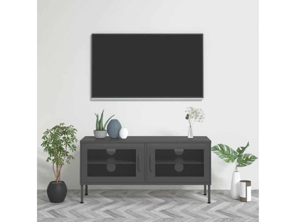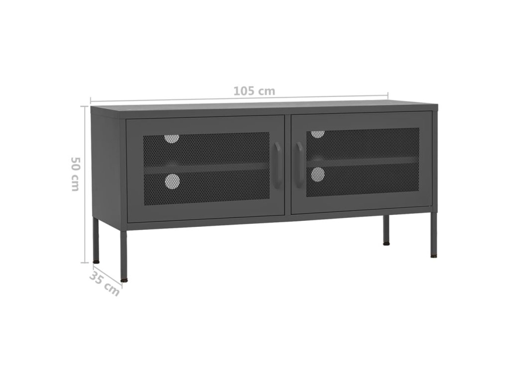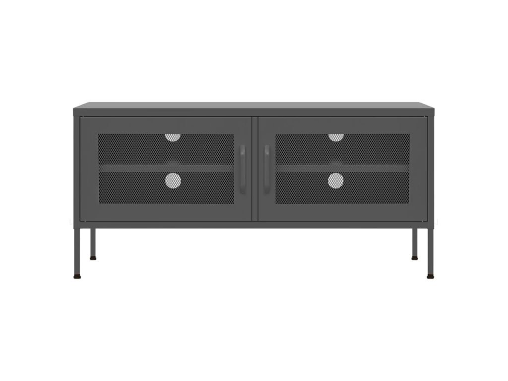 Oceľová konštrukcia tejto TV jednotky je veľmi pevná a odolná. Na spodnej strane sú vyrovnávače, pomocou ktorých si výšku nastavíte podľa svojich potrieb. TV stolík má 2 sieťované dvierka s policou vo vnútri, a poskytuje dostatok úložného priestoru pre DVD, časopisy a ďalšie veci. Okrem toho sú na zadnom paneli 4 otvory na usporiadanie káblov elektronický zariadení. Ľahko sa čistí vlhkou handričkou.