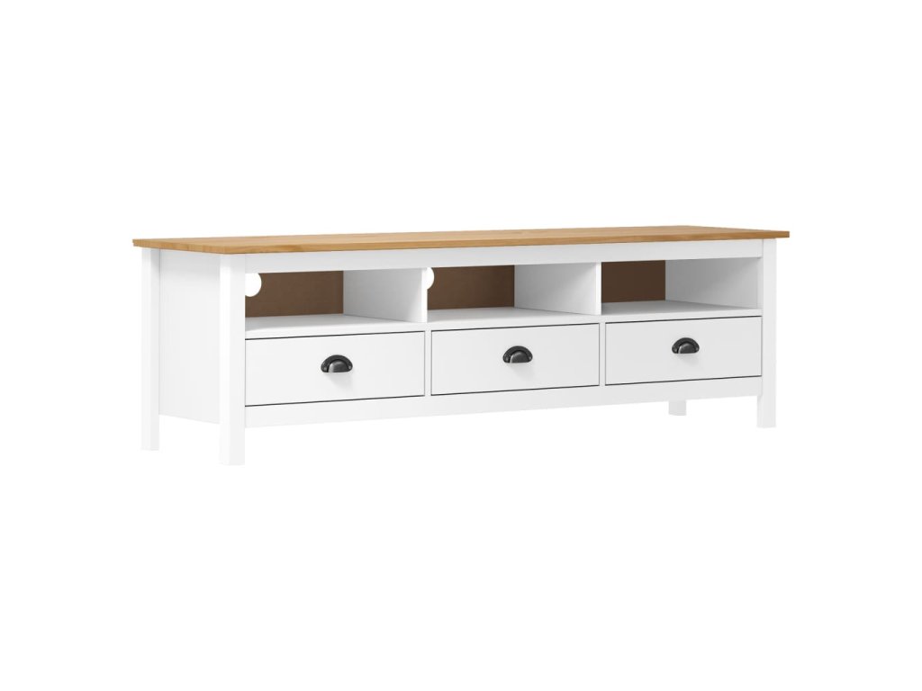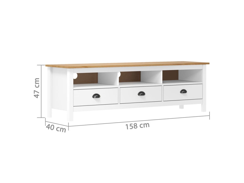 Táto TV skrinka vyrobená z borovicového masívu je pevná a odolná. Vďaka svojmu elegantnému dizajnu bude táto polička výrazným dekoratívnym doplnkom vašej domácnosti. Skrinka na stereo má 3 poličky a 3 zásuvky, ktoré poskytujú dostatočný priestor na uloženie rôznych druhov drobností, ako sú kľúče, poznámkové bloky, perá a iné veci, ktoré potrebujete mať uložené a na dosah ruky. Veľká vrchná doska je navyše ideálna na položenie televízora, routeru, multimediálnych zariadení alebo na vystavenie ozdobných predmetov.