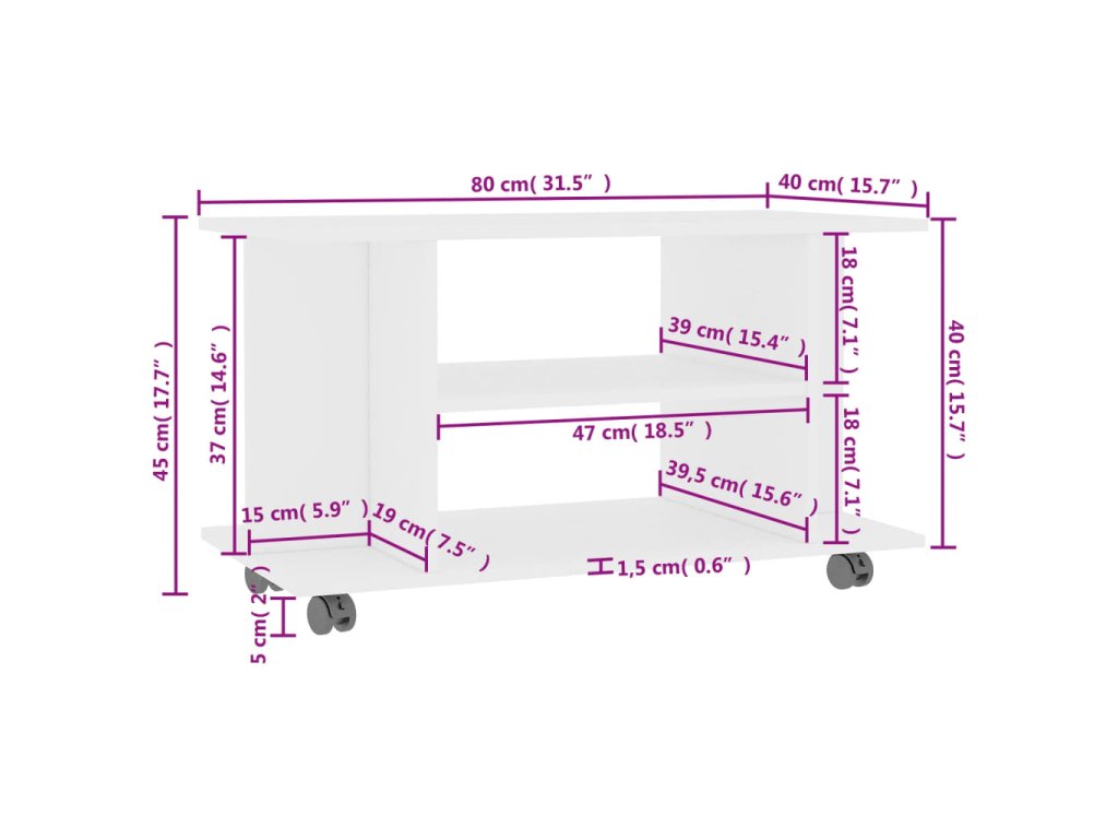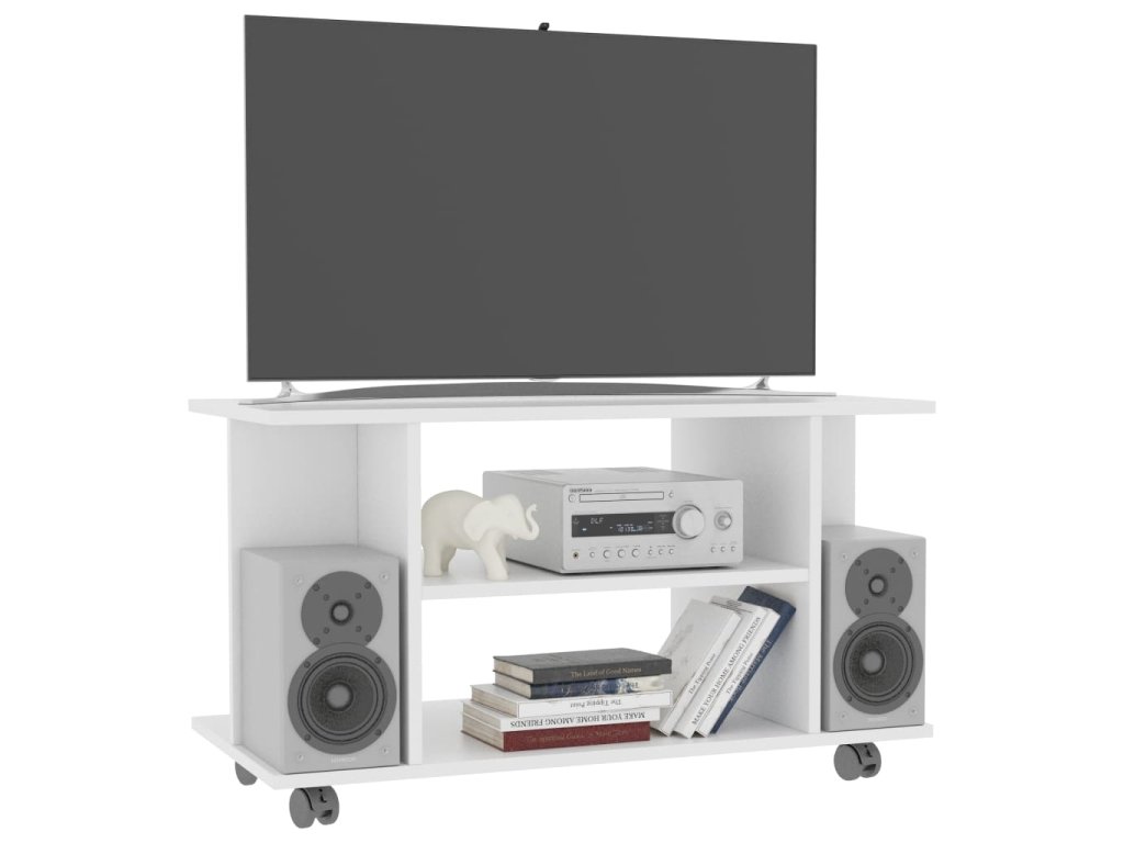 TV skrinka je vyrobená z kompozitné drevo, čo zaručuje jej pevnosť, trvácnosť a dlhú životnosť. Bola navrhnutá so 4 otvorenými policami a ponúka dostatok úložného priestoru pre úhľadné usporiadanie časopisov, kníh, DVD a multimediálnych zariadení, ktoré chcete mať na dosah ruky. Navyše sa vďaka 4 kolieskam jednoducho premiestňuje. 2 kolieska sú uzamykateľné, takže ostane pevne na mieste.