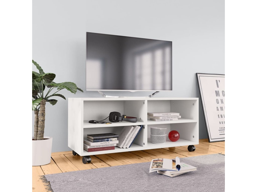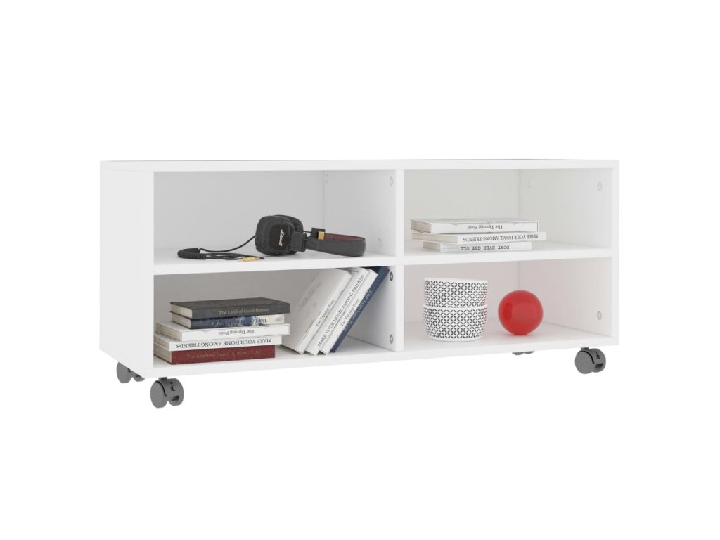 TV skrinka je vyrobená z dosky, čo zaručuje jej pevnosť, trvácnosť a dlhú životnosť. Bola navrhnutá so 4 priehradkami a ponúka dostatok úložného priestoru pre úhľadné usporiadanie časopisov, kníh, DVD a multimediálnych zariadení, ktoré chcete mať na dosah ruky. Navyše sa jednoducho premiestňuje vďaka 4 kolieskam. 2 kolieska sú uzamykateľné, takže ostane pevne na mieste.