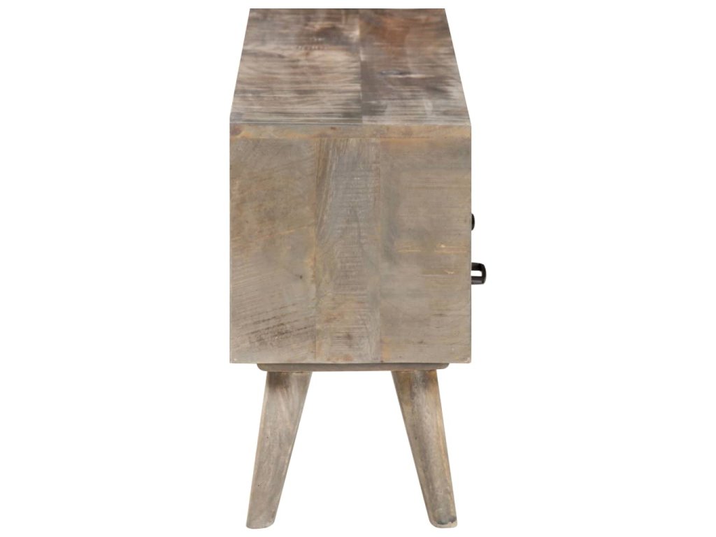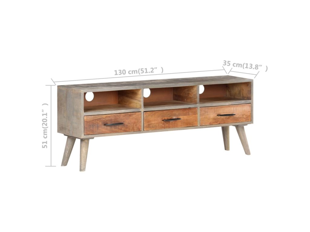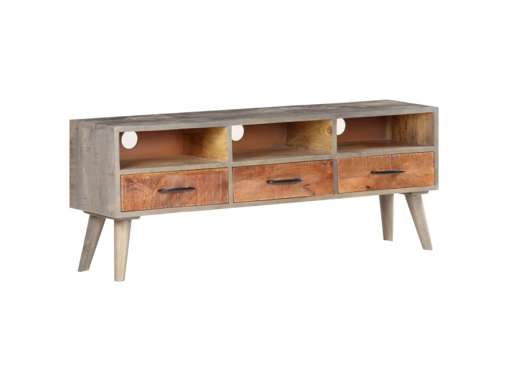 Tento TV stolík je vyrobený z masívne mangovníkového dreva, tropického tvrdého dreva. Toto drevo sa môže pochváliť nielen pevnosťou, ktorá unesie veľkú hmotnosť, ale aj odolnosťou voči opotrebovaniu. Vďaka vynikajúcemu remeselnému spracovaniu a nádhernej drevenej štruktúre sa každý kúsok mierne líši od iných kusov. Táto stereo skrinka má 3 priehradky a 3 zásuvky, ktoré poskytujú dostatok úložného priestoru na usporiadanie DVD, multimediálnych zariadení, kníh a drobných základných predmetov.