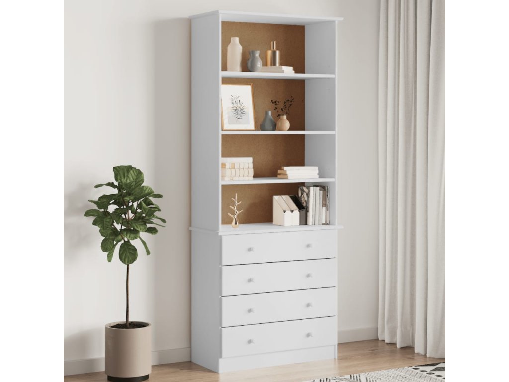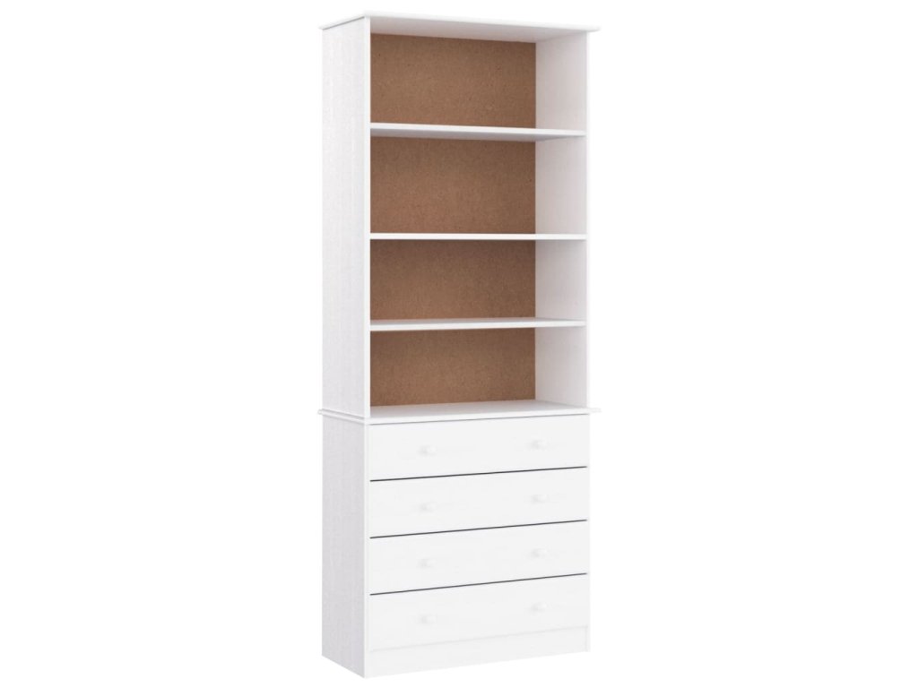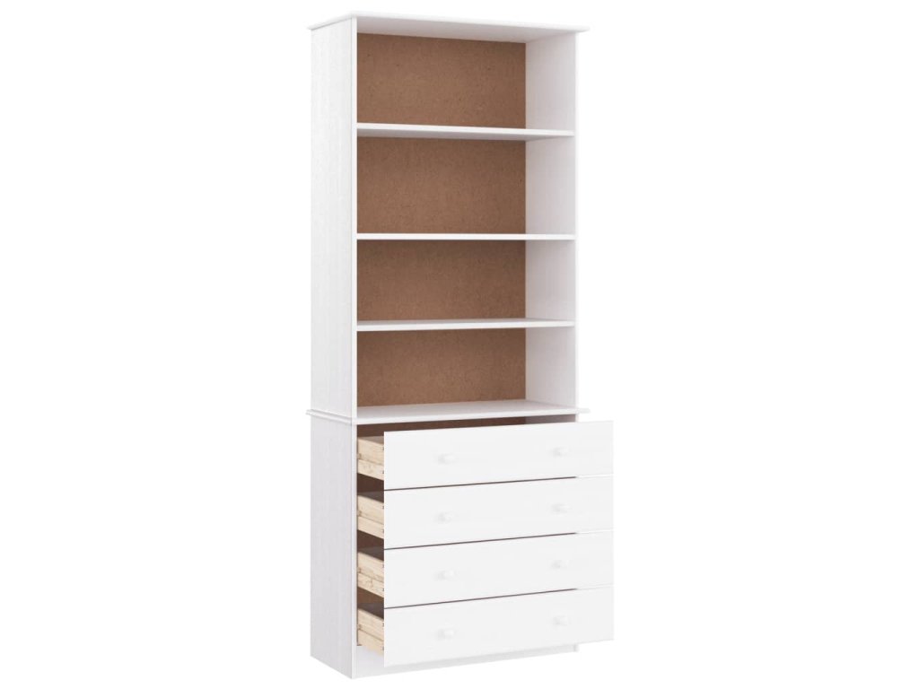 - Borovicový masív: Borovicový masív je krásny prírodný materiál. Borovicové drevo má rovnú kresbu a nachádzajú sa na ňom uzly, ktoré tomuto materiálu dodávajú charakteristický rustikálny vzhľad. Regál na knihy je vyrobený z masívneho borovicového dreva a je odolný a pevný.