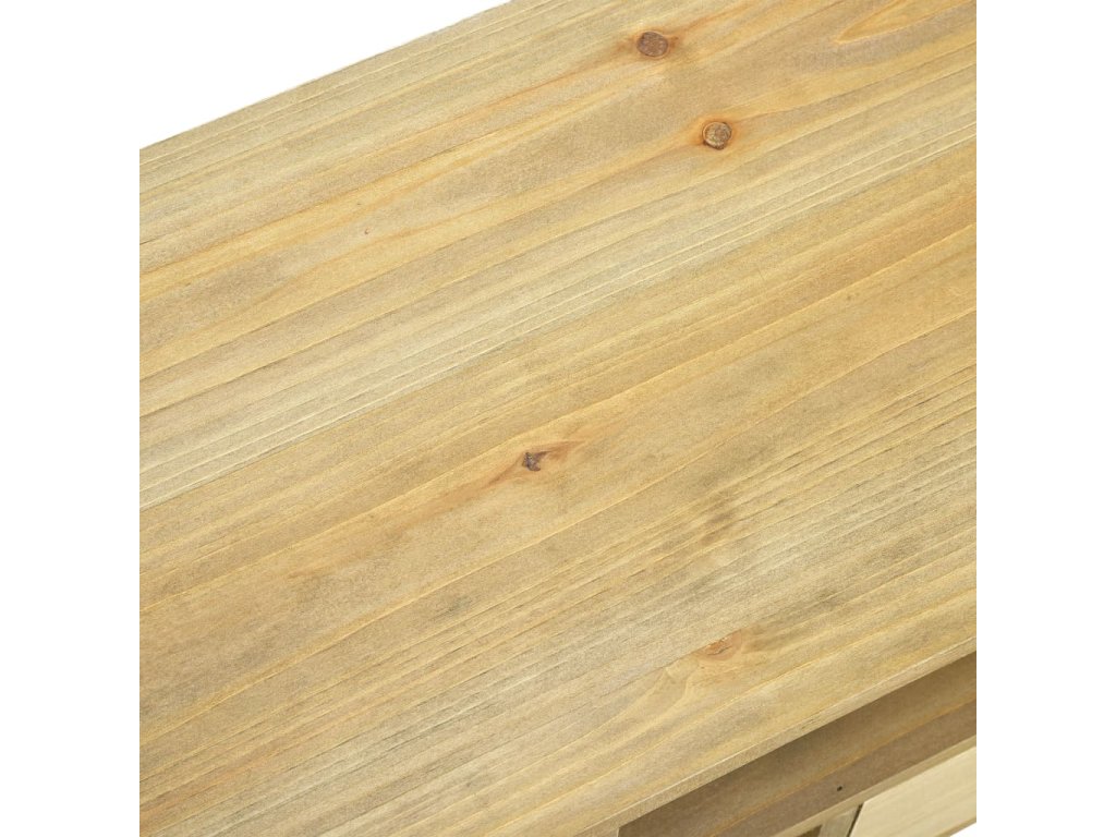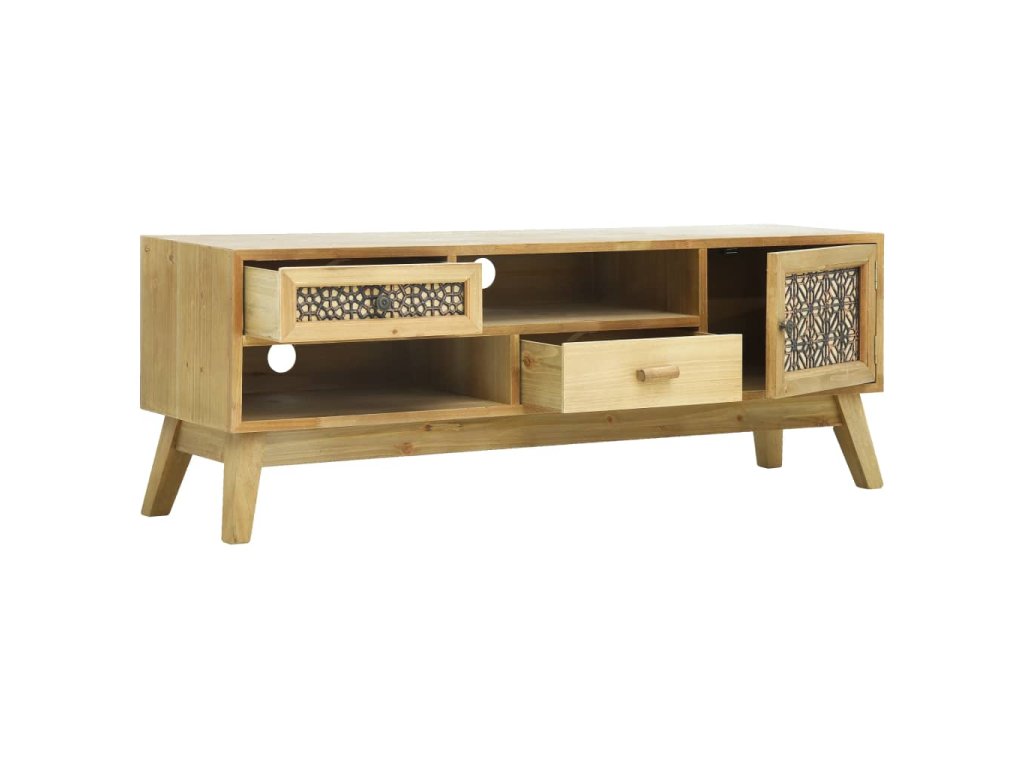 Táto TV skrinka je vyrobená z kvalitného MDF a má nohy z borovicového dreva s olúpaným povrchom, ktorý je odolný, stabilný a dodáva stolíku vintage efekt. Veľká vrchná doska je ideálna na umiestnenie televízora, smerovačov, multimediálnych zariadení alebo na zobrazovanie ozdobných predmetov, fotorámčekov alebo dokonca črepníkových rastlín, zatiaľ čo zásuvky, otvorené priečinky a skrinka poskytujú dostatok úložného priestoru na úhľadné uloženie všetkých druhov menších predmetov, napríklad poznámkových blokov, časopisov, kníh, ale aj iných drobností, ktoré chcete mať na dosah ruky.