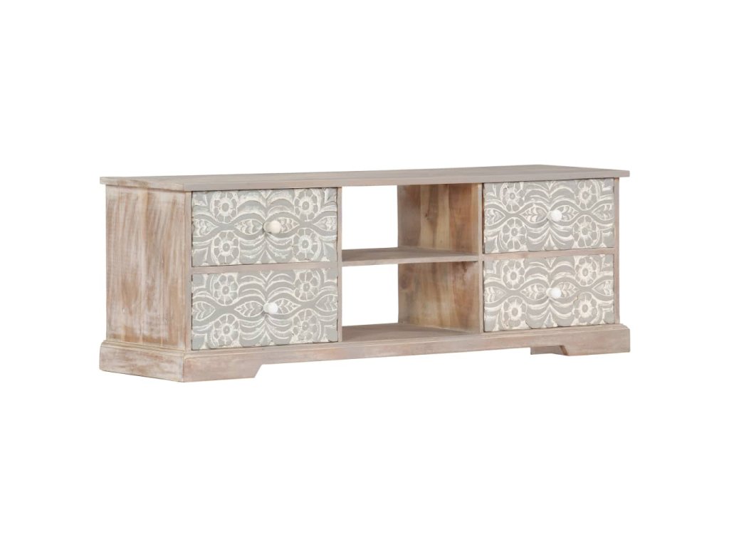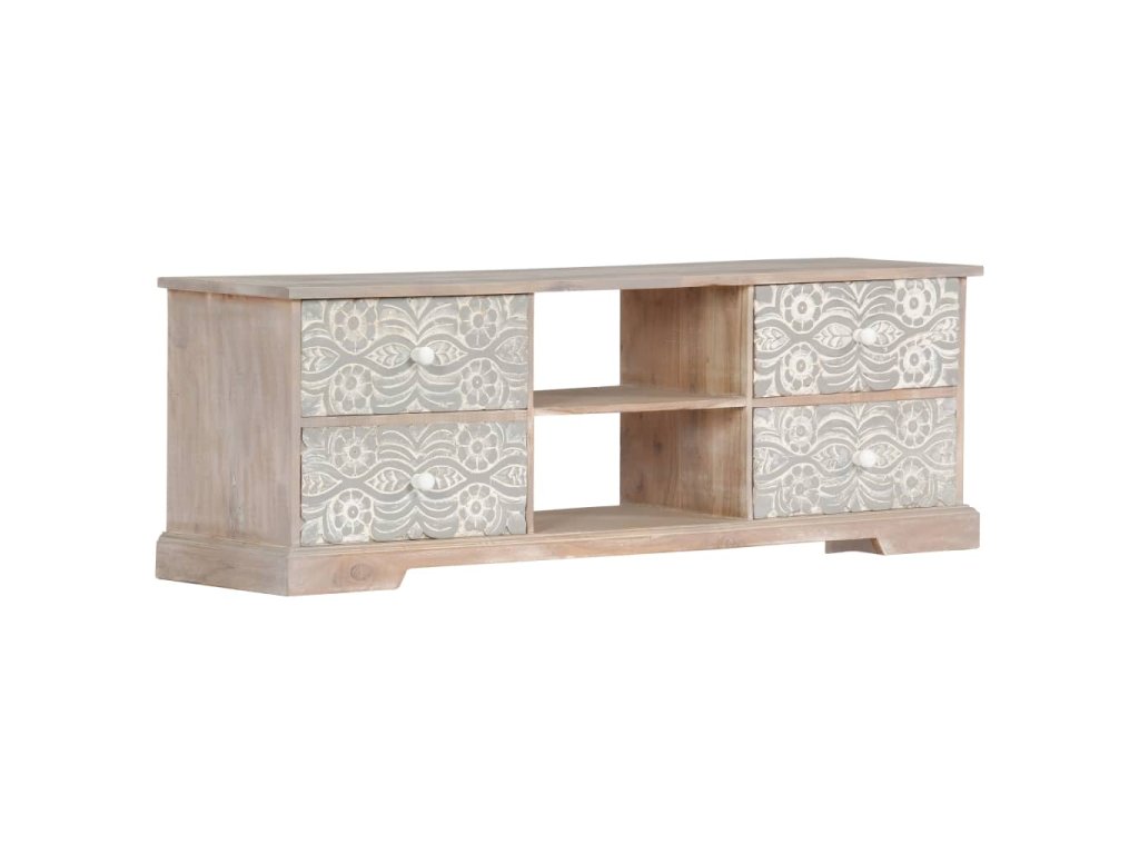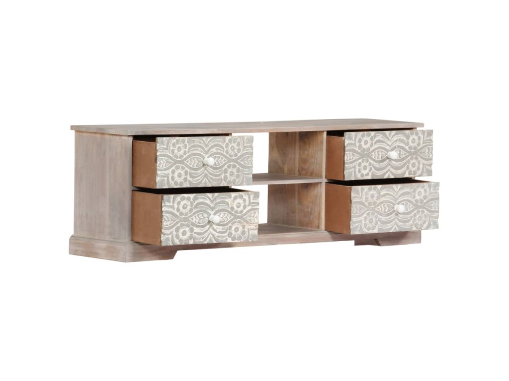 Táto HiFi skrinka je vyrobená z masívneho akáciového dreva s bielou povrchovou úpravou, ktorá mu dodáva krásny vzhľad a svetlé farby. Skrinka je ručne vyrobená a vďaka peknej štruktúre dreva je každý kus tohto nábytku jedinečný a mierne odlišný od ostatných kusov. Dokonalé remeselné spracovanie zaručuje, že každý krok procesu sa vykonáva s najväčšou starostlivosťou, či už je to leštenie, maľovanie alebo lakovanie. Elegantné ručne vyrezávané vzory na prednej strane skrinku ešte viac skrášľujú. Táto komoda obsahuje 4 zásuvky a 2 priečinky, ktoré poskytujú dostatok priestoru na udržiavanie multimediálnych zariadení, kníh a rôznych položiek prehľadne usporiadaných.