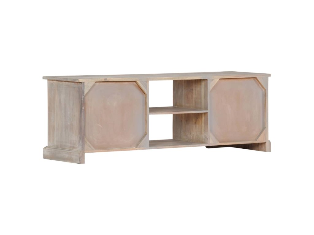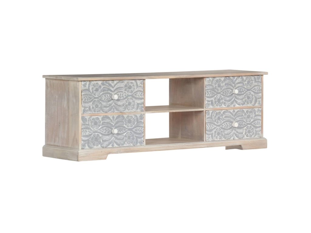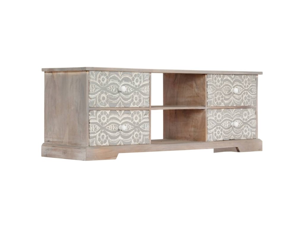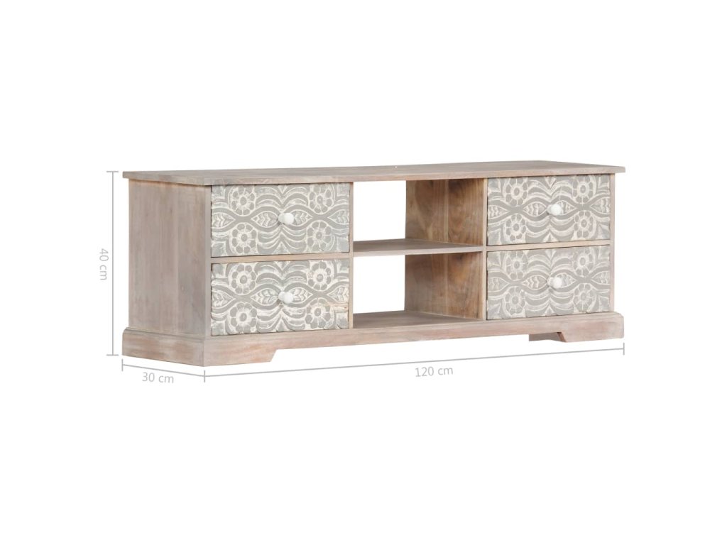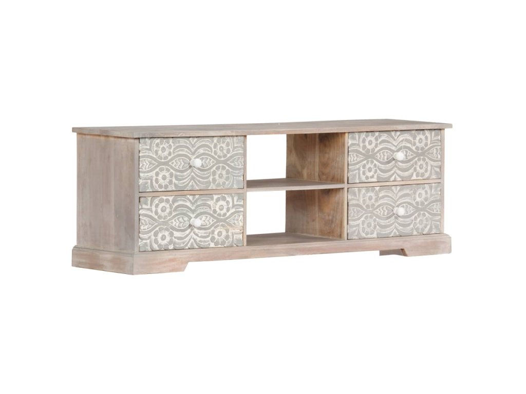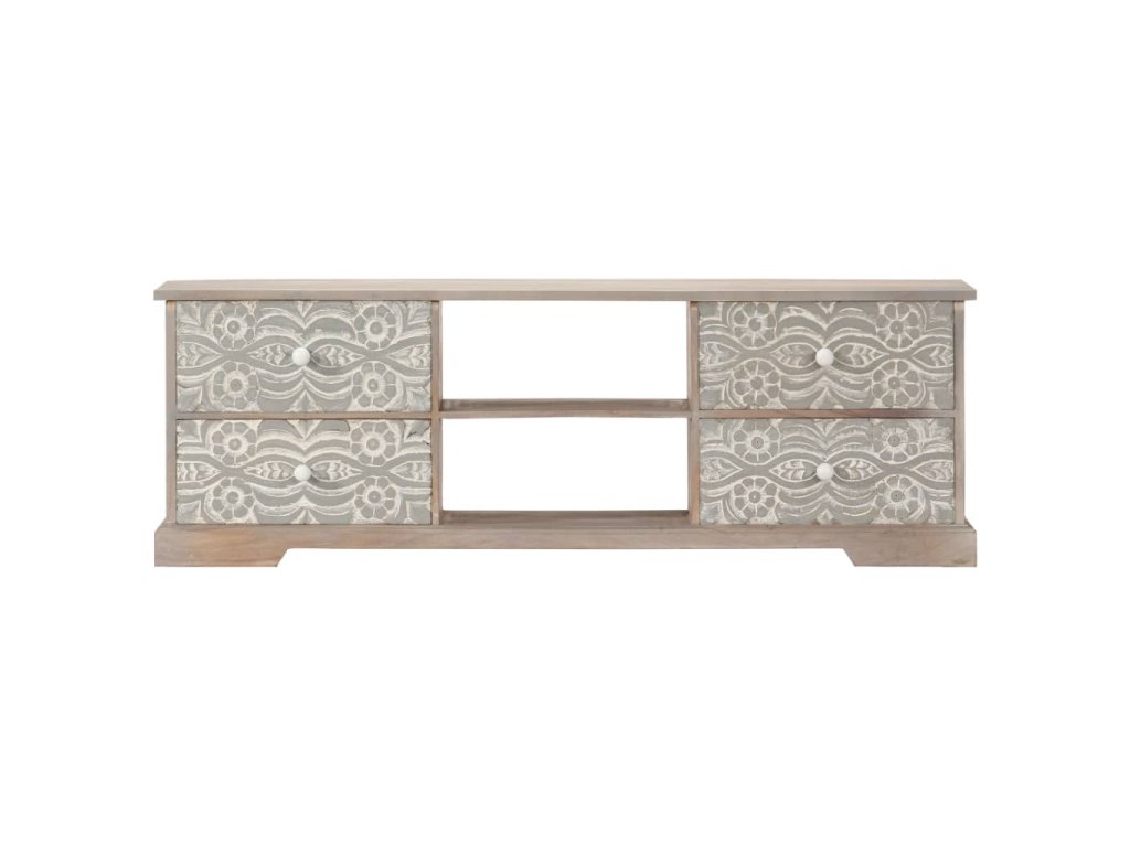 Táto drevená TV skrinka s krásnymi vyrezávanými vzormi predstavuje nadčasový doplnok do interiéru.