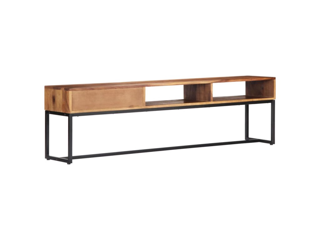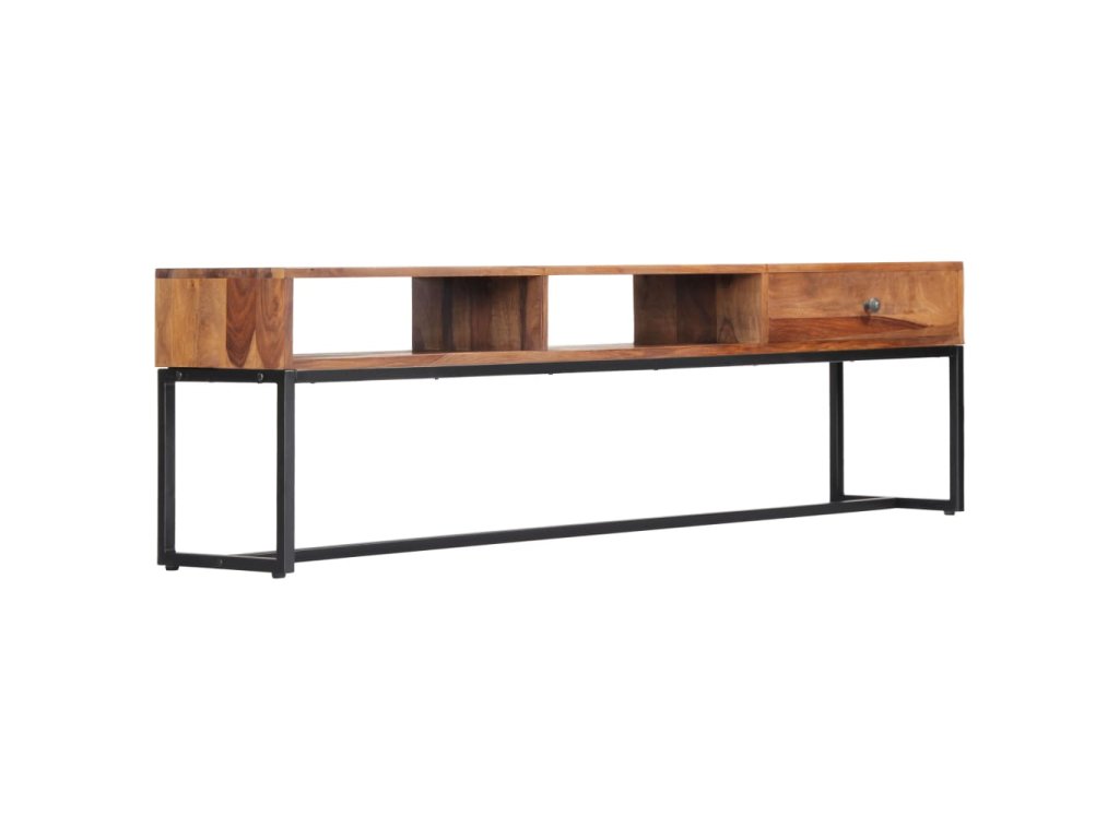 Táto TV skrinka vo vintage štýle je vyrobená z masívneho akáciového dreva a bude nadčasovým doplnkom vašej domácnosti. Akáciaové drevo je tropické tvrdé drevo, ktoré sa vyznačuje svojou bohatou štruktúrou. Je tiež známe ako ružové drevo alebo palisander. Každý krok výrobného procesu sa vykonáva s najvyššou starostlivosťou, či už ide o leštenie, maľovanie alebo lakovanie. Vďaka pevnému oceľovému rámu je tento TV stolík mimoriadne stabilný a trvácny. Má zásuvku na uloženie drobností a otvorené priečinky na uloženie multimediálnych zariadení, herných konzol a časopisov.