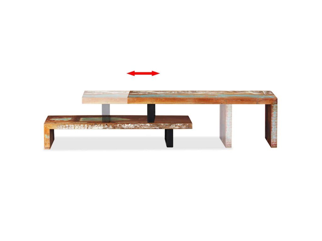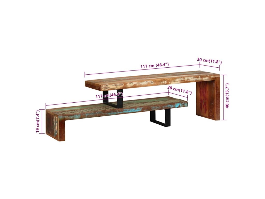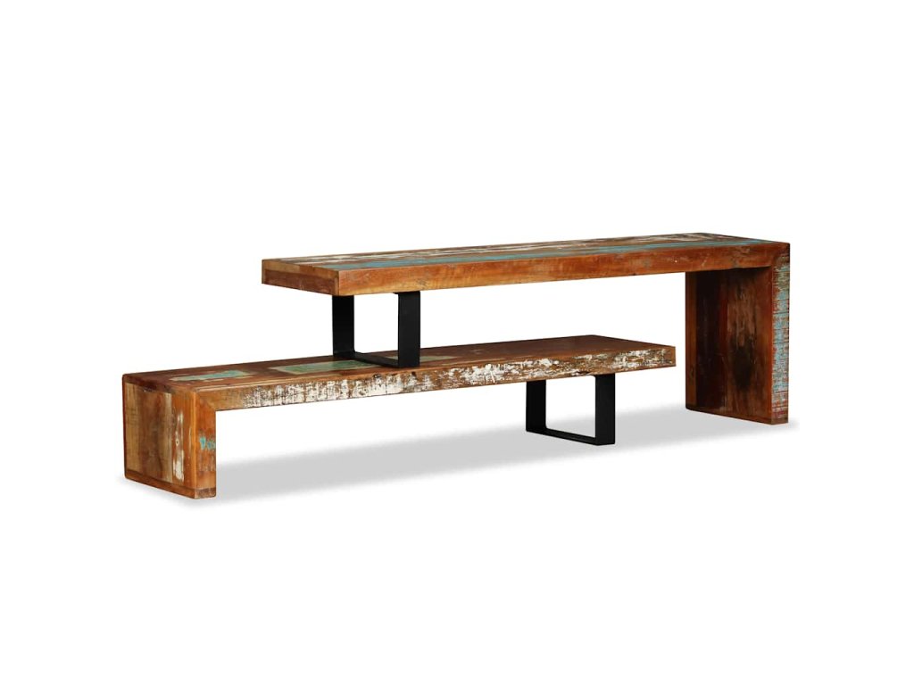TV stolík je ručne vyrobený z recyklovaného masívu, ktorý je stabilný, trvácny a krásny a má podobné vlastnosti ako napríklad tíkové, mangové či akáciové drevo a podobne. Každý krok výrobného procesu sa vykonáva s maximálnou starostlivosťou, či už je to leštenie alebo lakovanie. Vďaka remeselnému opracovaniu a krásnej textúre dreva je každý kus nábytku jedinečný a trochu odlišný od ostatných. Skrinka na TV s 2 poličkami navyše poskytujú množstvo priestoru na odkladanie multimediálnych zariadení, mediálnych nosičov či iných predmetov, ktoré si chcete vystaviť alebo ktoré by ste chceli mať vždy poruke. Vrchná časť TV skrinky sa dá zložiť dolu alebo ľubovoľne umiestniť tak, aby bol stolík širší alebo užší.