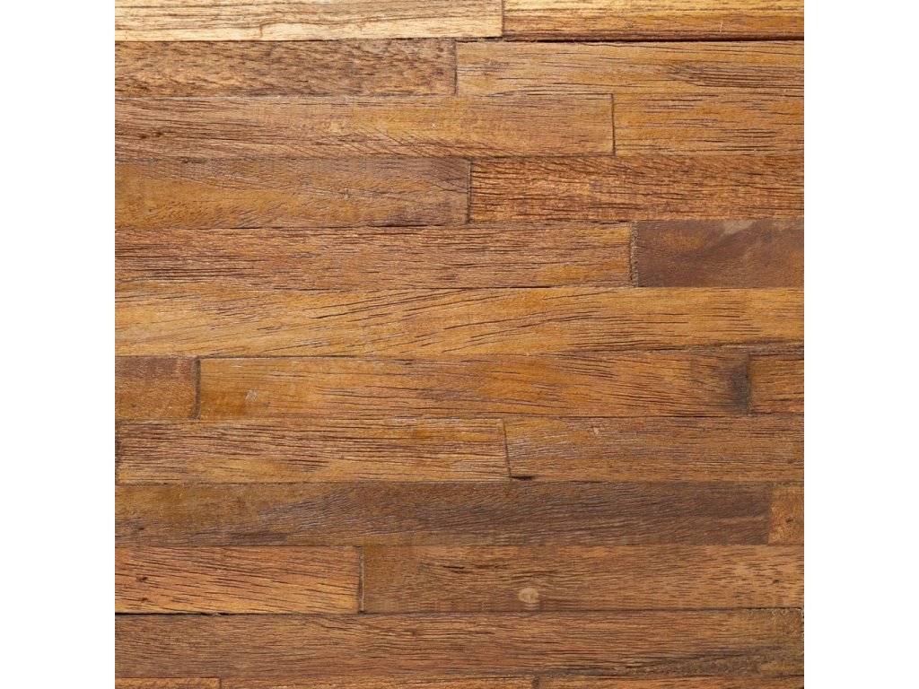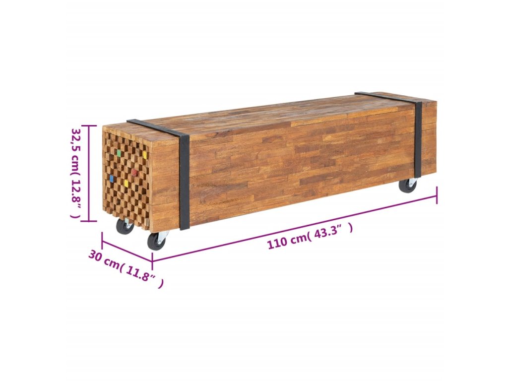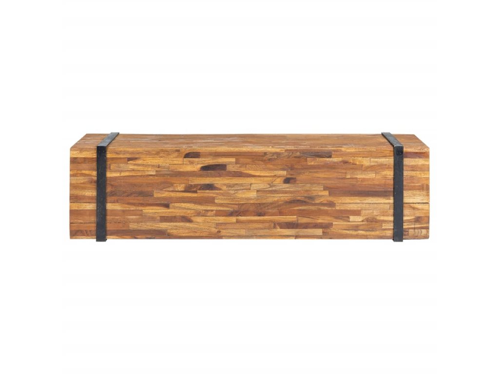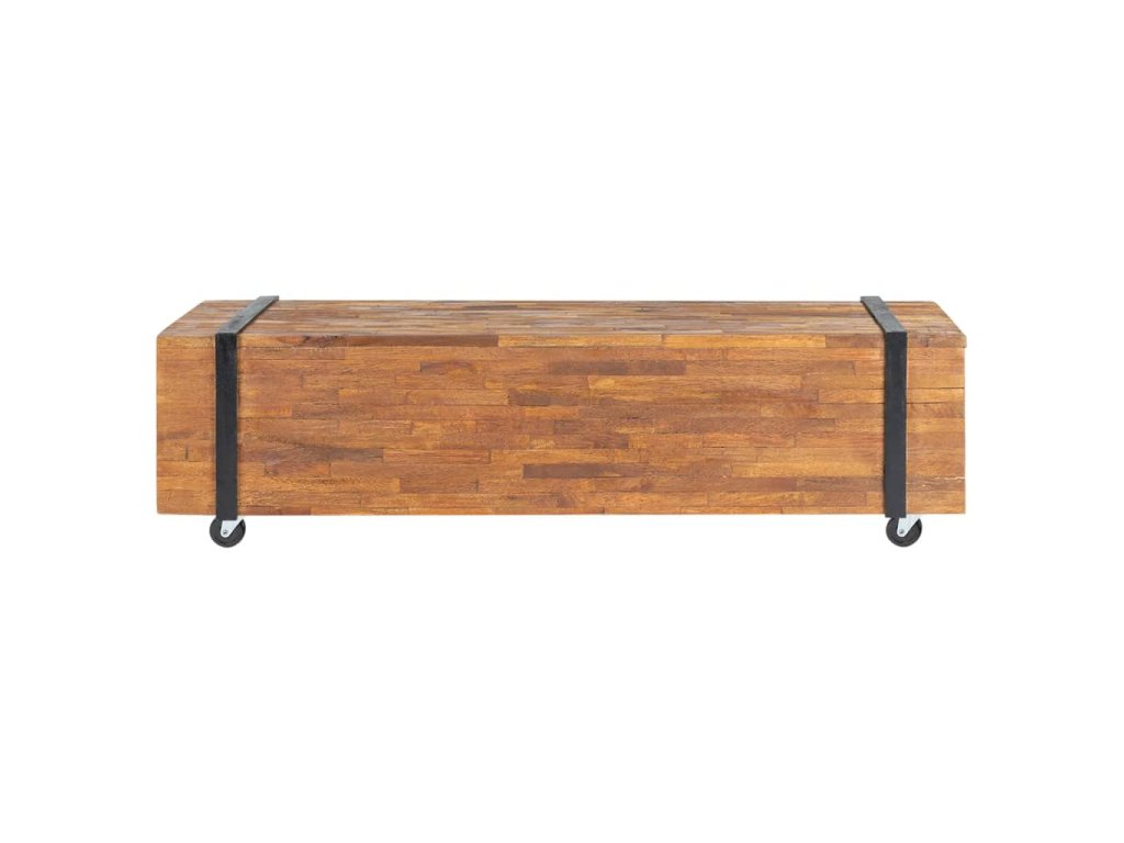 Tento robustný a pevný TV stojan je vyrobený z tvrdého teakového dreva, aby vyzeral ako stĺpec nosníkov, ktoré držia spolu pomocou páru čiernych pásov. Jeho robustný vrch má dostatok priestoru pre váš televízor alebo vázy, črepníkové rastliny, ovocné koše a iné dekoratívne predmety. Prírodný povrch umožňuje ľahké čistenie TV stojanu a vďaka štyrom kolieskam sa ľahko pohybuje.