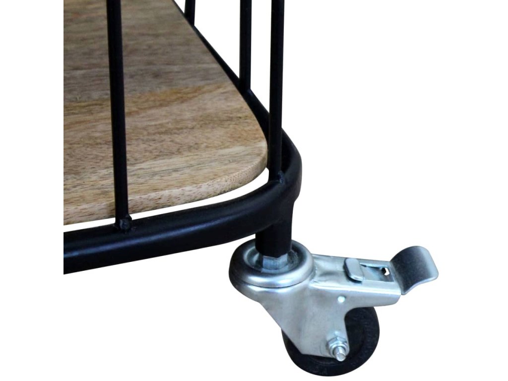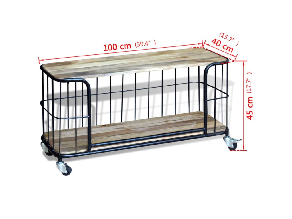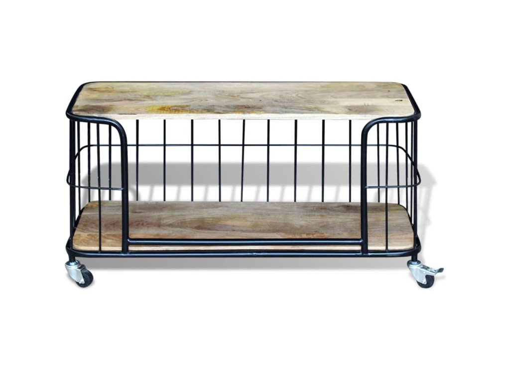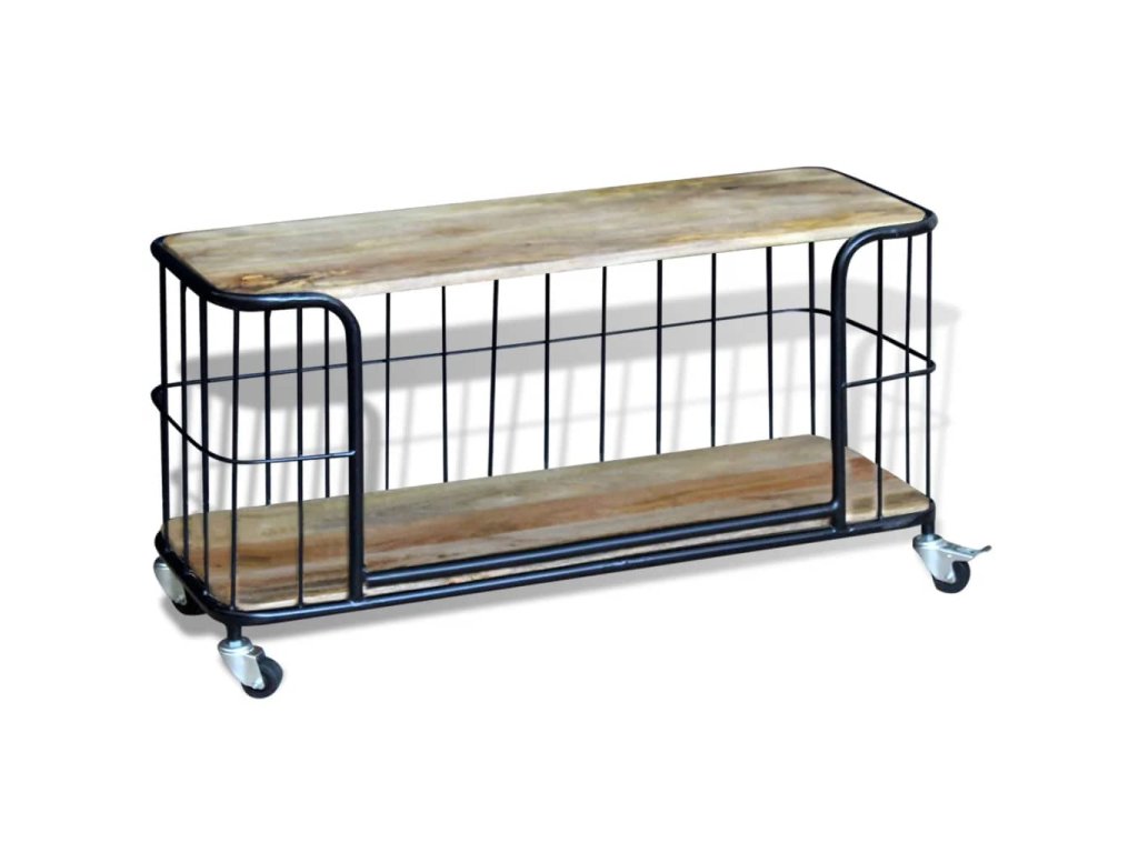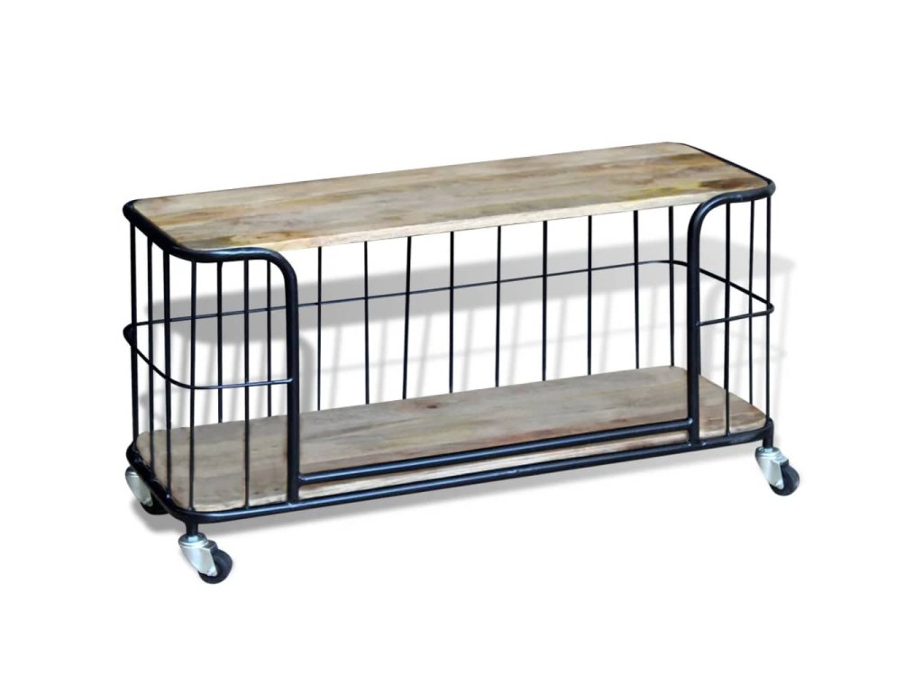 Tento TV stolík je vyrobený z masívneho mangového dreva, čo znamená, že je pevný, stabilný a odolný. Do spodnej poličky môžete uložiť multimediálne zariadenia, časopisy, atď. Železný rám prispieva k robustnosti a vďaka jeho dizajnu je tento stolík úžasným a jedinečným. Vďaka svojim 4 kolieskam sa dá TV stolík flexibilne umiestniť a ľahko sa s ním pohybuje. Viditeľná štruktúra robí každý kus nábytku jedinečným, pretože sa jednotlivé kusy od seba odlišujú.