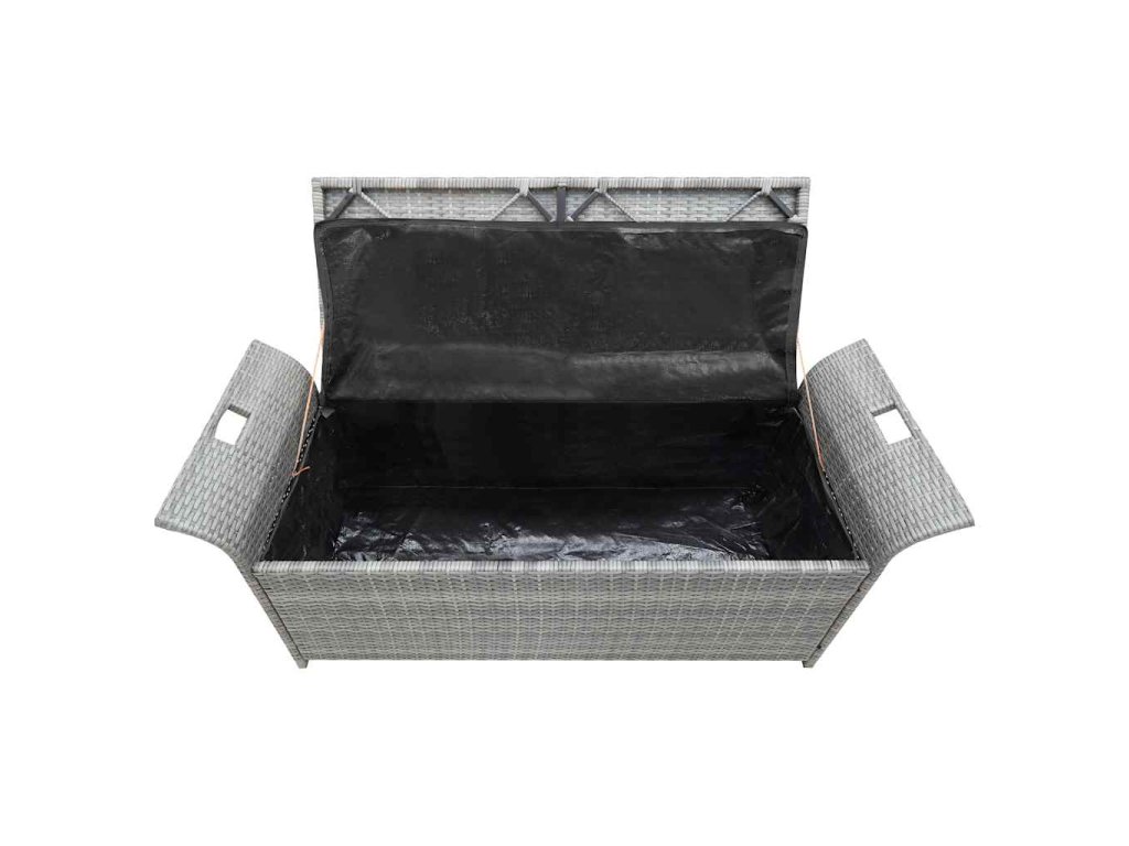 Lavička z vodovzdorného PE ratanu sa dá jednoducho očistiť, je odolná a vhodná na každodenné používanie v exteriéri. Vo vnútri lavice sa nachádza veľký úložný priestor, kde si budete môcť odložiť množstvo predmetov, ktoré tak budete mať vždy poruke. Vďaka vodovzdornej výstelke z PE vám odložené veci nenavlhnú. Polyesterové poťahy si nevyžadujú náročnú údržbu a dajú sa jednoducho zvliecť a oprať. Polyratanová lavička je veľmi flexibilná a dá sa bez námahy premiestniť a prispôsobiť okolitému prostrediu.