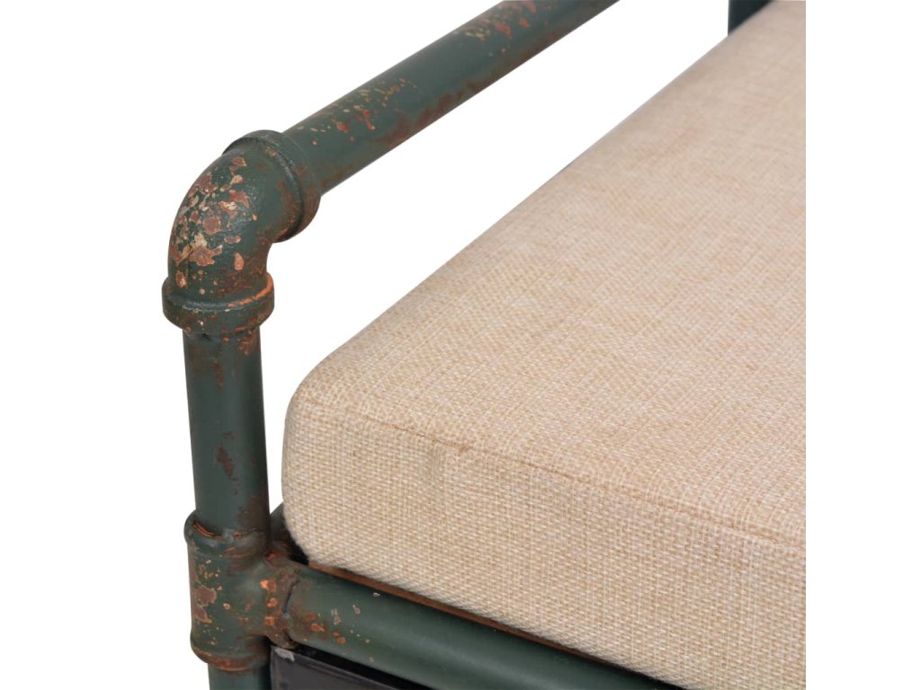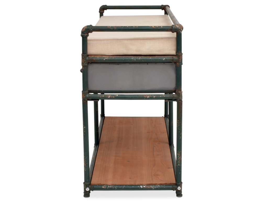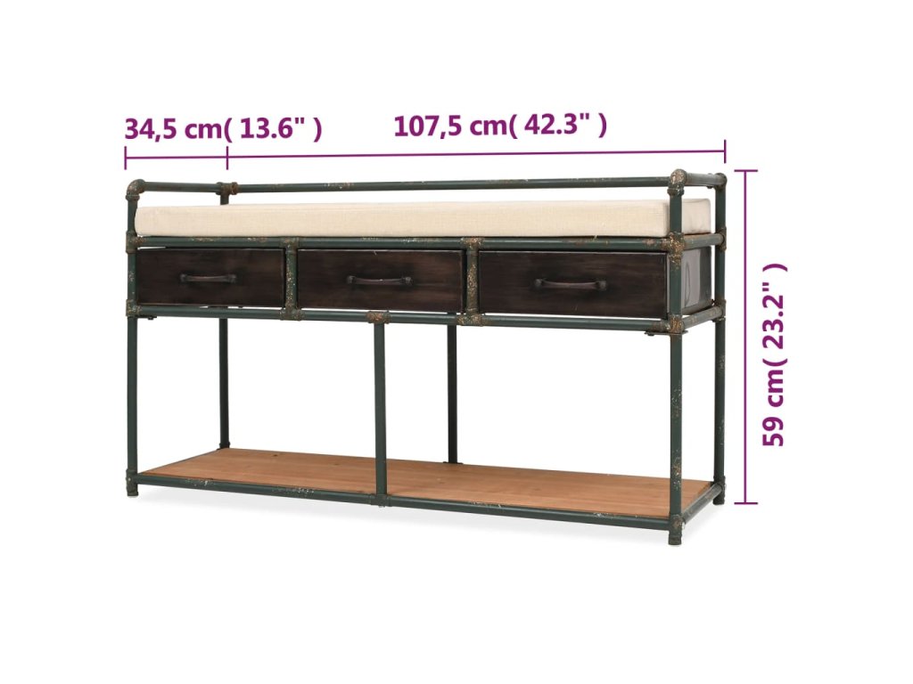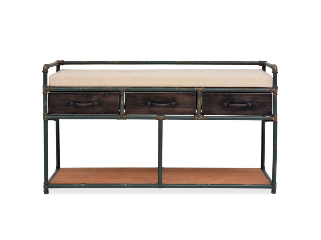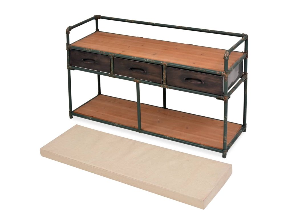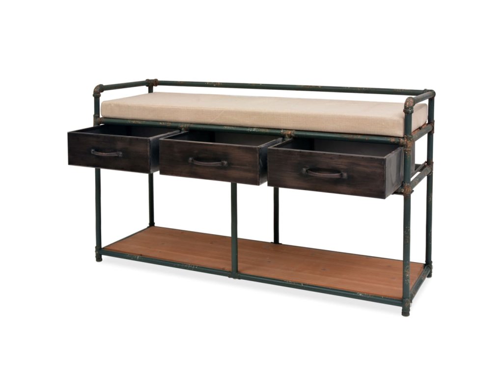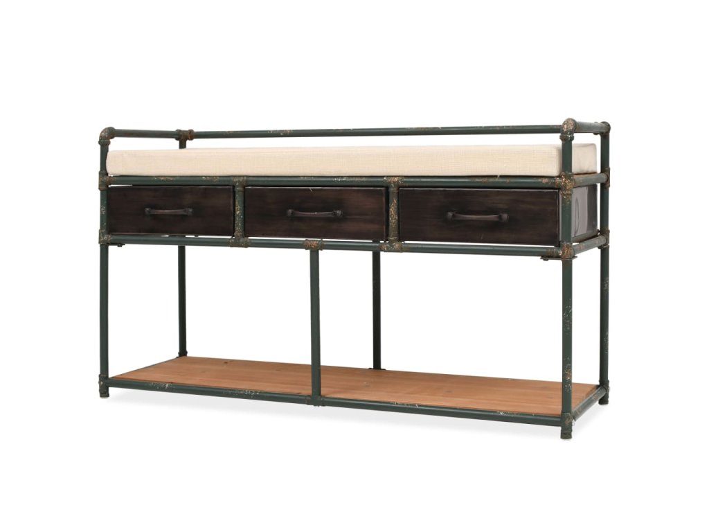 Táto pevná a trvácna lavica je vyrobená z ocele a masívneho dreva. Môže na vykazovať drobné nedostatky, ktoré neboli zámerne vytvorené, no lavici dodávajú starožitný vzhľad a priemyselné prevedenie. Má 3 zásuvky a spodnú poličku, ktoré poskytujú dostatok miesta na uloženie širokej škály položiek. Sedák zvyšuje komfort sedenia na lavici.
