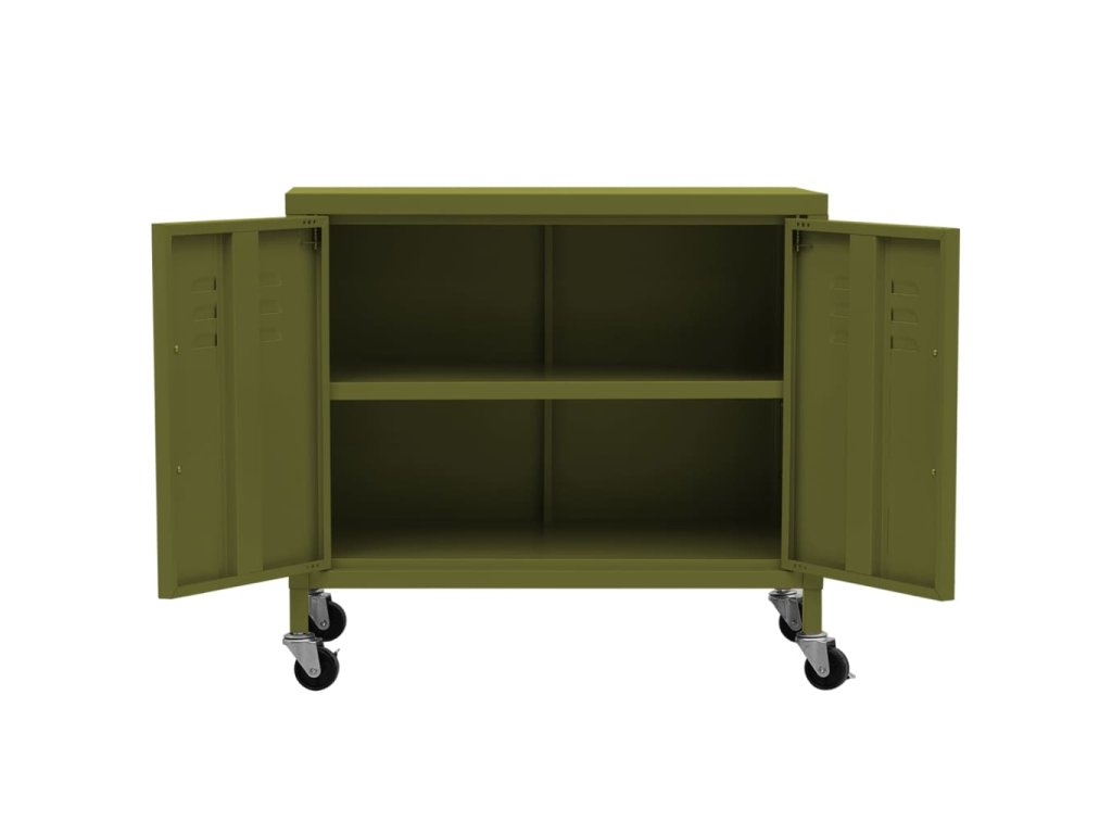 Táto úložná skriňa je vyrobená z ocele, takže je pevná a stabilná. Nastaviteľná polica poskytuje dostatok úložného priestoru, aby ste mali DVD, multimediálne zariadenia, knihy a iné drobné predmety usporiadané a na dosah ruky. Skriňa je vybavená štyrmi kolieskami na jednoduché premiestňovanie. Dve predné kolieska majú brzdy, aby sa zabránilo náhodnému pohybu. Okrem toho sa ľahko čistí vlhkou handričkou.