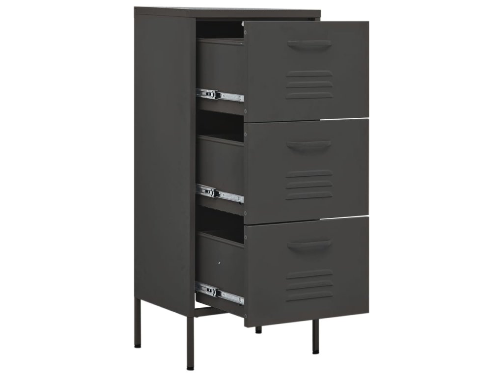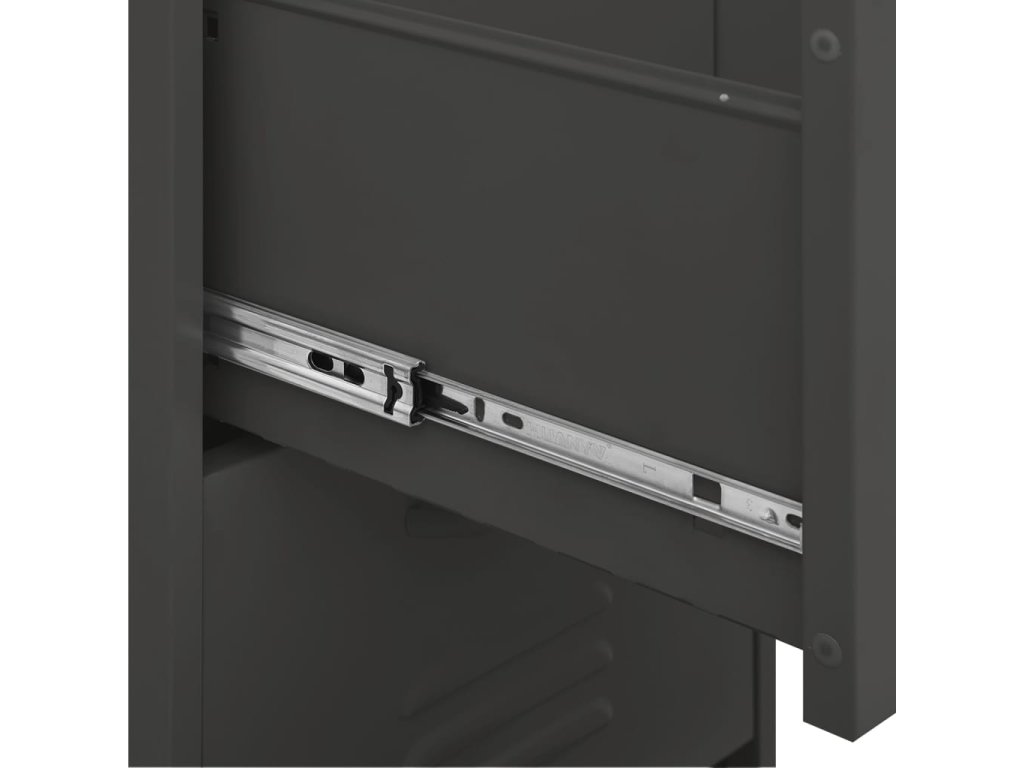 Táto bočná skrinka s oceľovou konštrukciou je pevná a odolná. Na spodnej strane sú vyrovnávače, pomocou ktorých si výšku nastavíte podľa svojich potrieb. Zásuvky sa dajú úplne vysunúť a sú ideálne na uloženie všetkých druhov menších predmetov, ktoré chcete mať na dosah ruky. Zásuvky s guľôčkovými ložiskami zaisťujú plynulé otváranie a zatváranie aj pri zvýšenej záťaži.