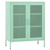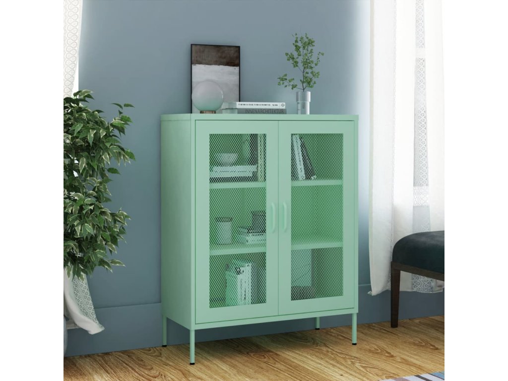 Táto bočná skrinka s oceľovou konštrukciou je pevná a odolná. Na spodnej strane sú vyrovnávače, pomocou ktorých si výšku nastavíte podľa svojich potrieb. Skrinka má 2 sieťovinové dvierka s nastaviteľnými policami vo vnútri, aby sa do nich zmestili predmety rôznych veľkostí, ako sú knihy, časopisy a iné osobné veci.