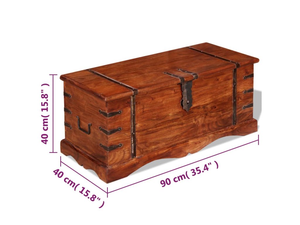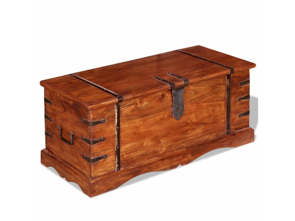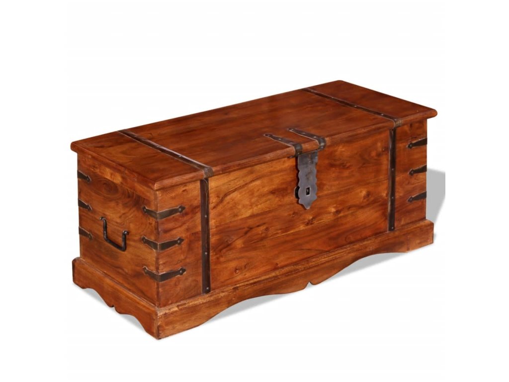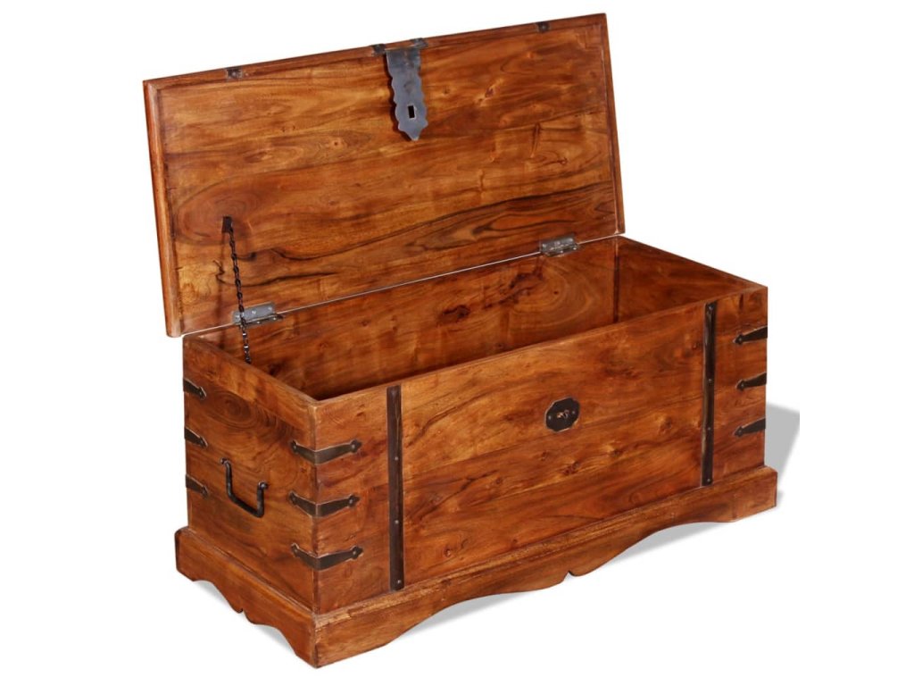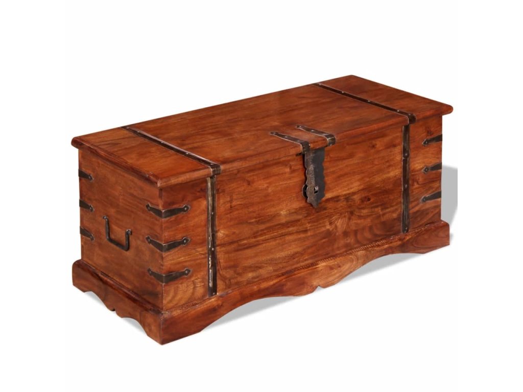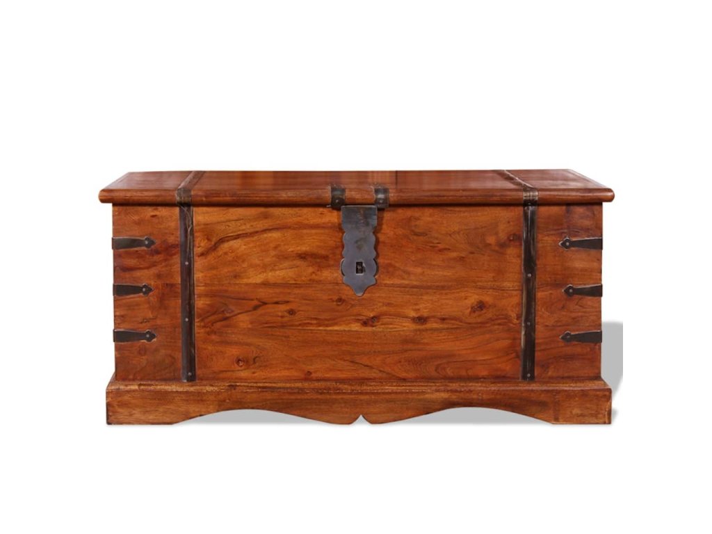 Úložný box poskytuje množstvo úložného priestoru na odkladanie oblečenia, časopisov, kníh, náradia a iných potrieb. Na prednej strane sa nachádza západka a po stranách dve rúčky. Drevený box so stabilnou a rovnou vrchnou doskou sa dá využívať aj ako konferenčný stolík, stolík ku gauču, stolík do obývačky, príručný stolík, odkladací stolík a podobne. Úložná truhlica je ručne vyrobená z akáciového masívu, ktorý má podobné vlastnosti ako palisandrové a ružové drevo. Vďaka kvalitnému remeselnému opracovaniu a krásnej textúre dreva je každý kus nábytku výnimočný a trochu odlišný od ostatných.