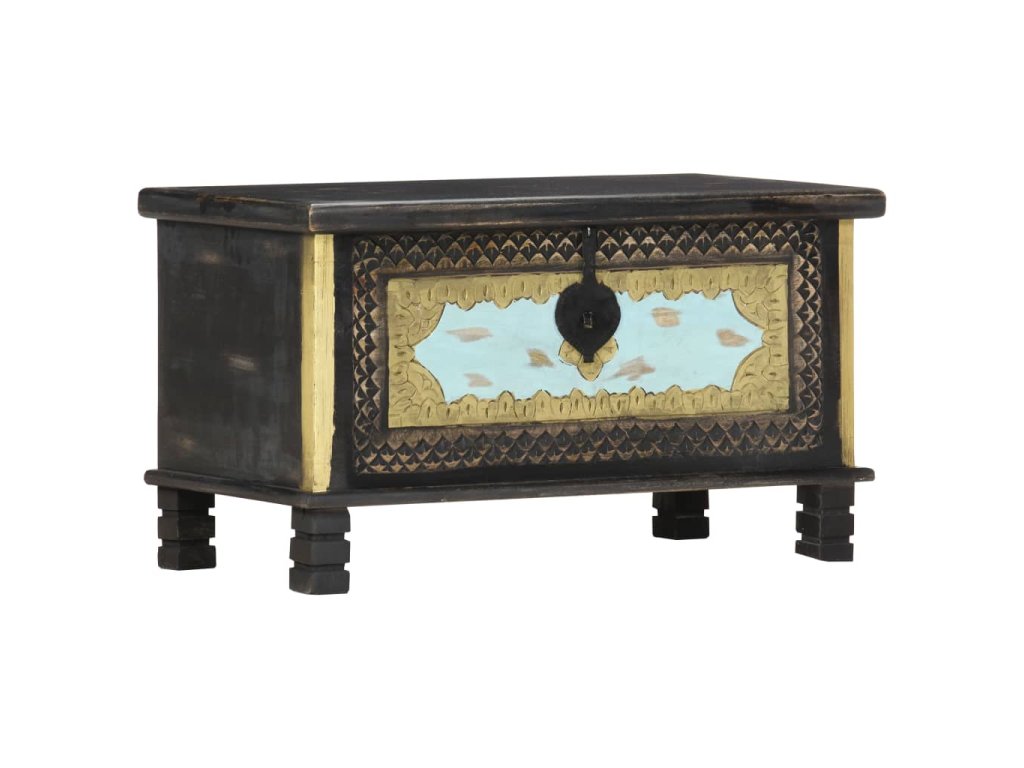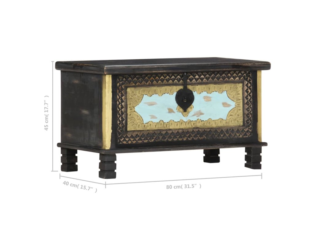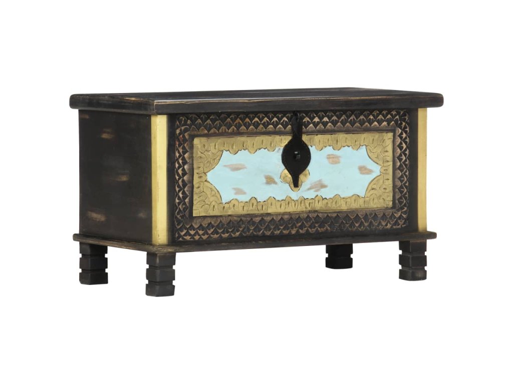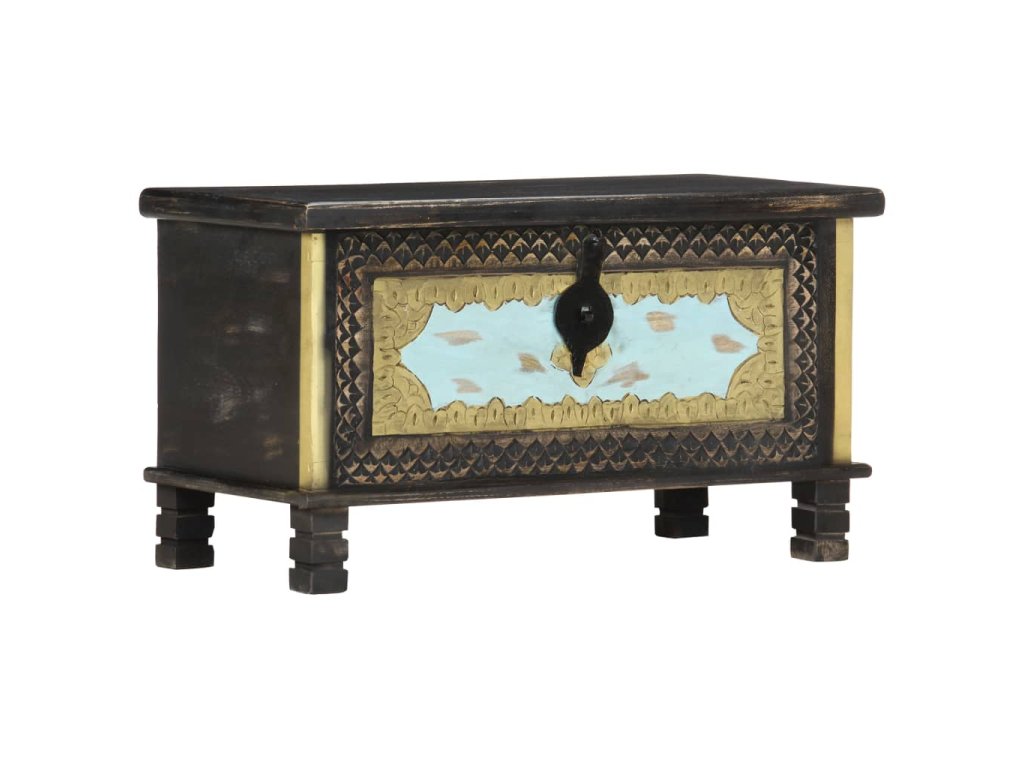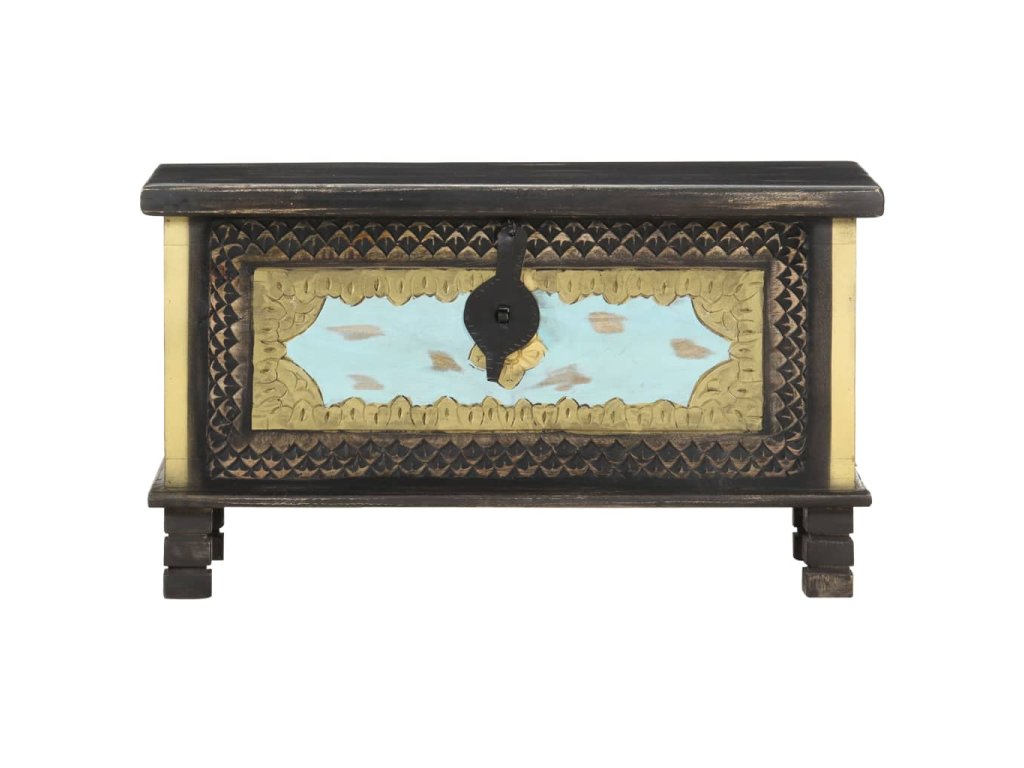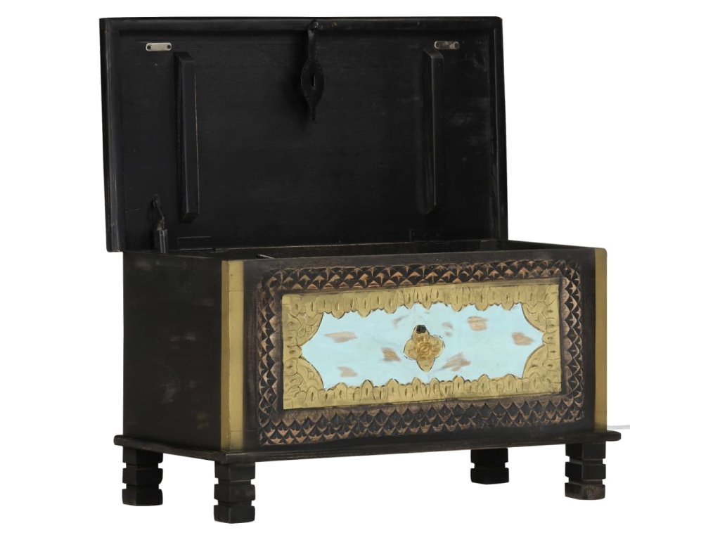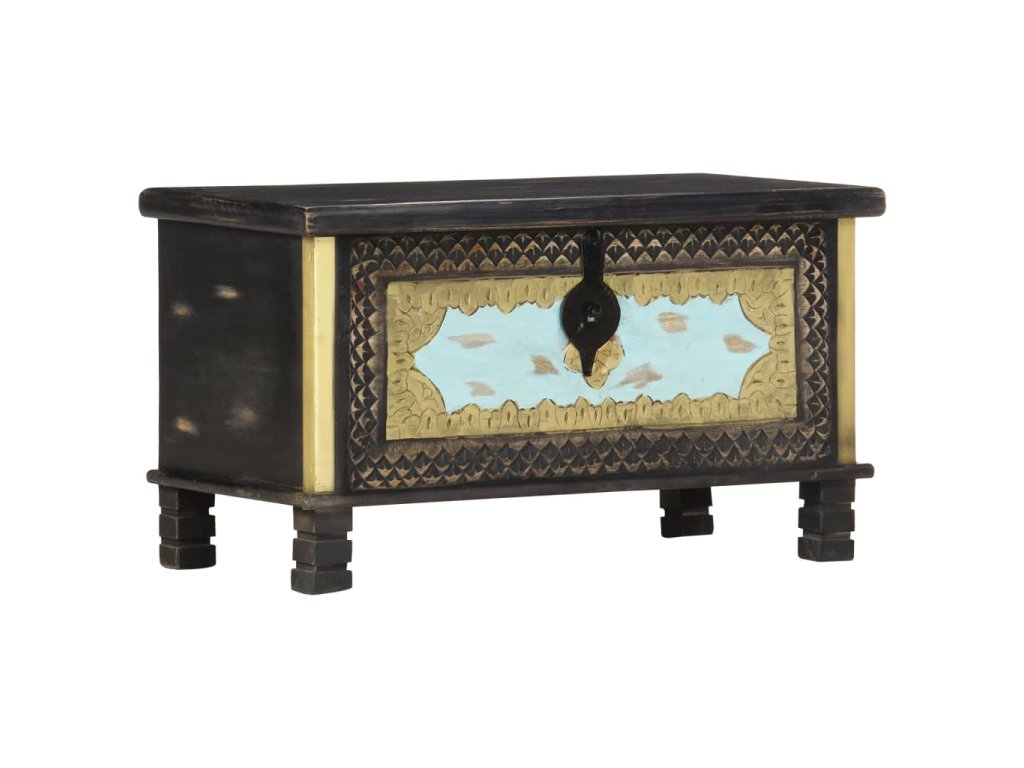 Táto truhlica s krásnymi kovovými dekoráciami a maľbami v prednej časti je vyrobená z masívneho mangovníkového dreva s čiernou povrchovou úpravou, vďaka ktorému na ňu môžete stabilne a bezpečne umiestňovať nápoje, ovocné koše alebo ozdobné predmety. Po odomknutí (zámok nie je súčasťou balenia) môžete dovnútra uložiť veľké množstvo vecí. Vďaka peknému remeselnému spracovaniu a drevnej štruktúre je každý kus nábytku jedinečný a mierne sa odlišuje od nasledujúceho kusu. Každý krok procesu výroby sa vykonáva s najväčšou starostlivosťou, či už ide o leštenie, natieranie a lakovanie. Okrem toho sa jednoducho montuje.