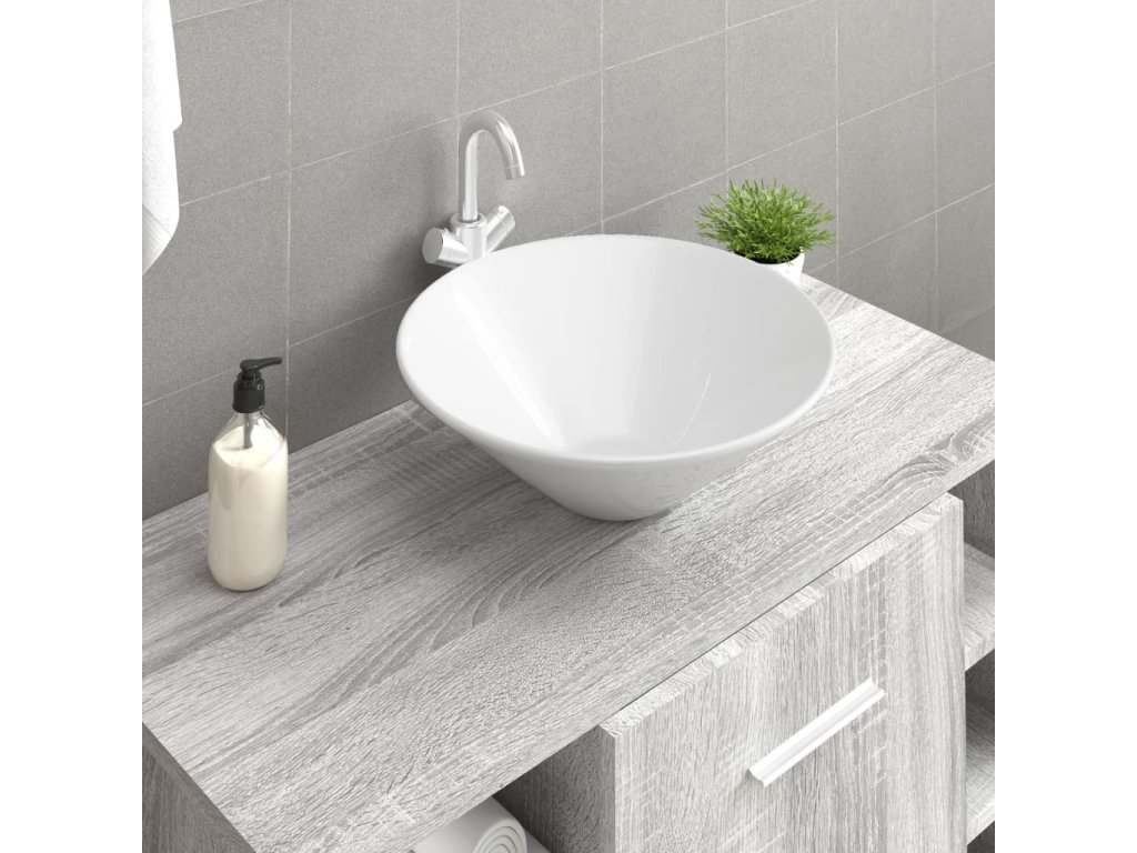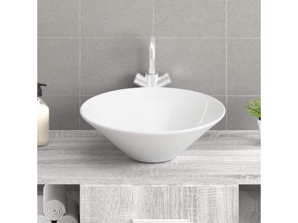 - Keramický materiál: Umývadlo na dosku je vyrobené z keramiky a je odolné voči poškriabaniu a korózii pre dlhú životnosť.