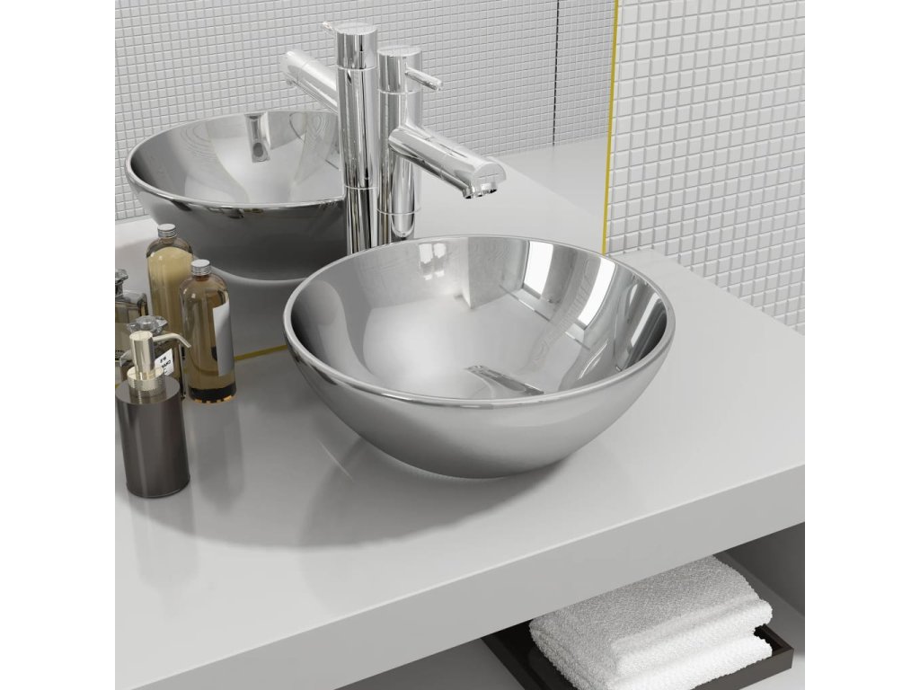 Umývadlo bude mať vo vašom obytnom priestore praktickú, ako aj ozdobnú funkciu. Vďaka svojmu trendovému a modernému striebornému žiarivému dizajnu sa bude toto umývadlo hodiť do každého interiéru. Umývadlo je vyrobené z keramiky a ľahko sa čistí. Jeho vysoko lesklý povrch dodá vašej kúpeľni šarmantný nádych.