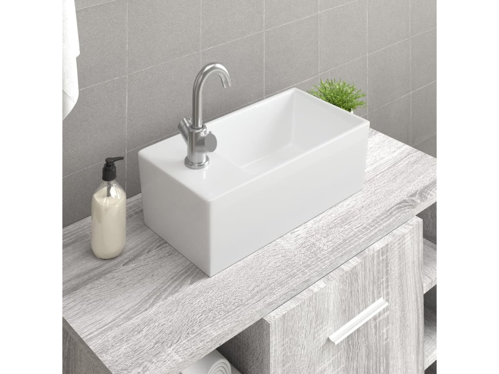 - Keramický materiál: Umývadlo na dosku je vyrobené z keramiky a je odolné voči poškriabaniu a korózii pre dlhú životnosť.
