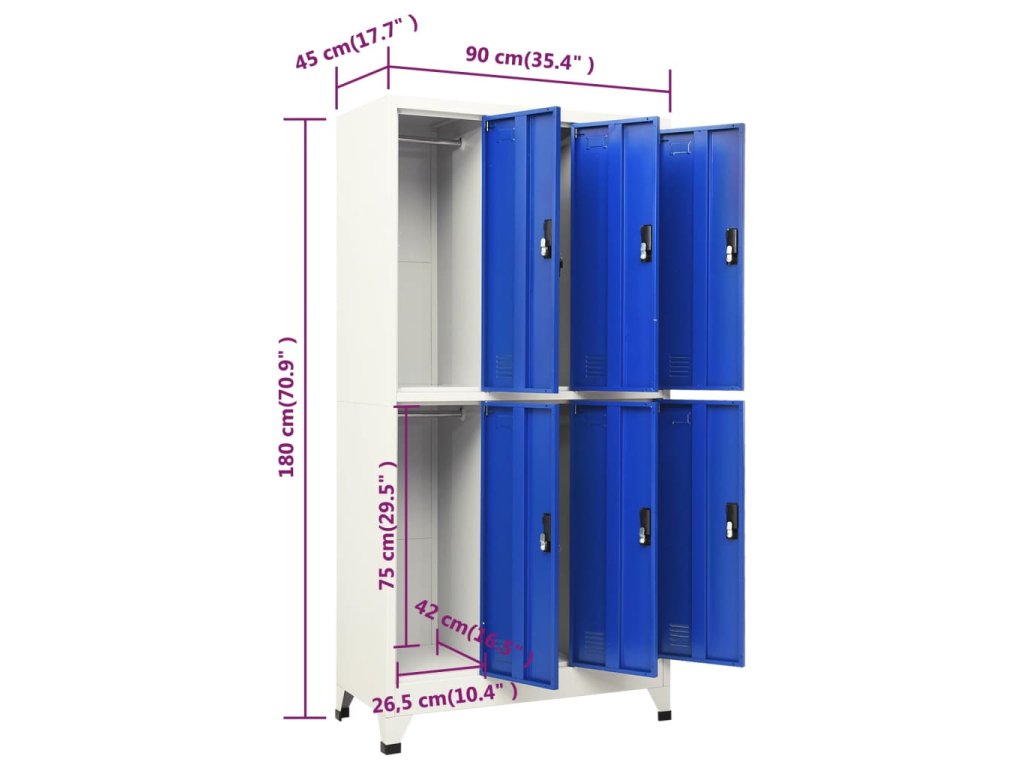 Táto úložná skrinka je vyrobená z ocele, vďaka čomu je odolná a ľahko sa čistí. Každá priehradka je vybavená vešiakom a uzamykateľnými dverami s ventilačnými otvormi. Skrinka má dostatok úložného priestoru na uloženie oblečenia a iných osobných vecí. Držiak na menovky vám navyše umožňuje prehľadne triediť vaše položky. Táto skrinka je vhodná do škôl a kancelárií na uloženie rôznych vecí.