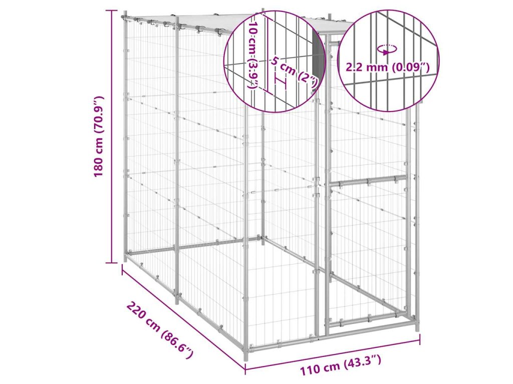 Táto psia búda poskytuje dostatok priestoru na cvičenie. Pletivo po celom obvode pomáha predchádzať nepleche a neočakávaným nehodám a zároveň umožňuje vetranie. Vďaka pevnej konštrukcii z pozinkovanej ocele je táto psia búda odolná a vyrobená tak, aby vydržala. Vyrobená z PE, priložená vrchná strieška je vodeodolná a odolná voči UV žiareniu. Dvere s pántmi a uzamykateľným západkovým systémom zaisťujú extra bezpečnosť a ochranu vašich psov.