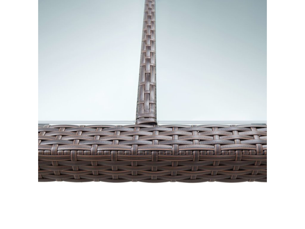 Vďaka oceľovému rámu a sklenenej stolovej doske je stôl robustný a stabilný. Konštrukcia je tiež ľahká, čo umožňuje jeho jednoduché premiestňovanie. PE ratan odolný voči poveternostným vplyvom zabezpečí, že sa jedálenský stôl ľahko čistí.
