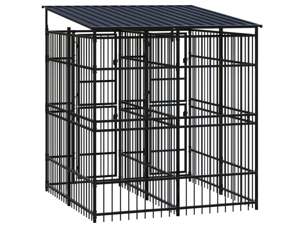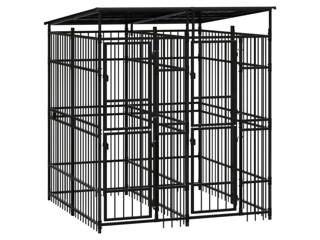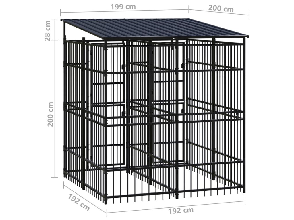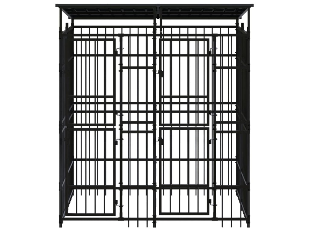 Táto psia búda poskytuje dostatok priestoru na cvičenie. Steny z oceľových tyčí pomáhajú predchádzať nepleche a neočakávaným nehodám a zároveň umožňujú vetranie. Vďaka robustnej oceľovej konštrukcii s práškovým nástrekom je táto psia búda odolná a vyrobená tak, aby vydržala. Strecha poskytuje ochranu pred slnkom, dažďom, snehom, ako aj inými poveternostnými podmienkami. Dvere s pántmi a uzamykateľným západkovým systémom zaisťujú extra bezpečnosť a ochranu vašich psov.