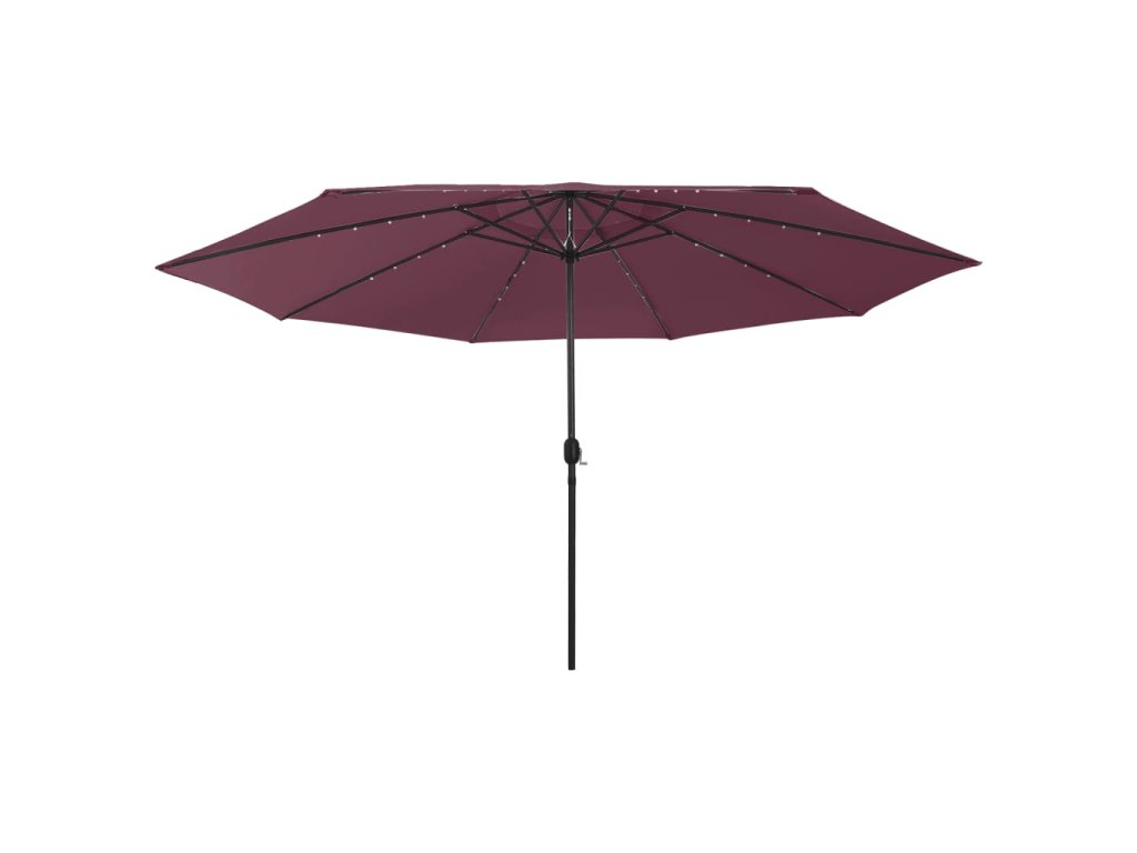 Tento slnečník je vyrobený z polyesteru, ktorý vám poskytuje optimálnu ochranu pred spálením na slnku. Pevná kovová tyč s odolnými rebrami udržuje slnečník stabilný a trvácny. Je vybavený 32 LED diódami, ktoré ho v noci osvetlia a vytvoria útulné a romantické prostredie. Okrem toho sa dá ľahko otvoriť a zavrieť vďaka kľukovému mechanizmu.