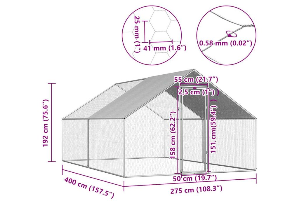 Tento výbeh pre kurčatá je vyrobený z vysoko kvalitnej pozinkovanej ocele pre dlhú životnosť a má strechu zo 100 % polyetylénu. Brána je vybavená zámkom. Montáž produktu je jednoduchá.